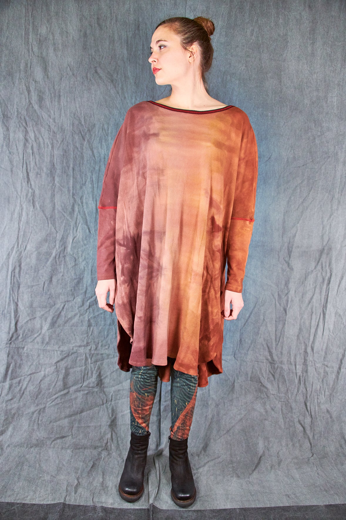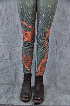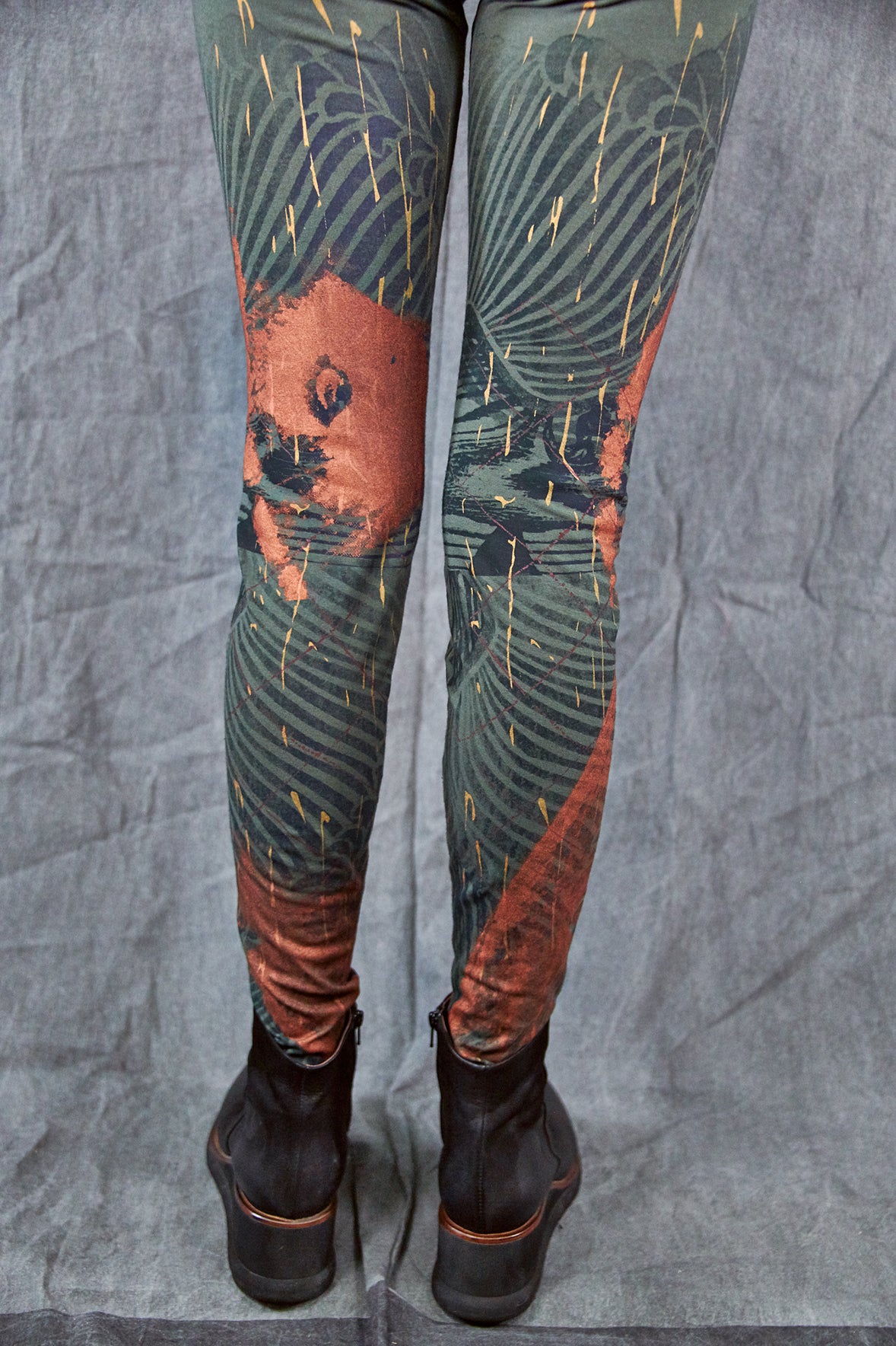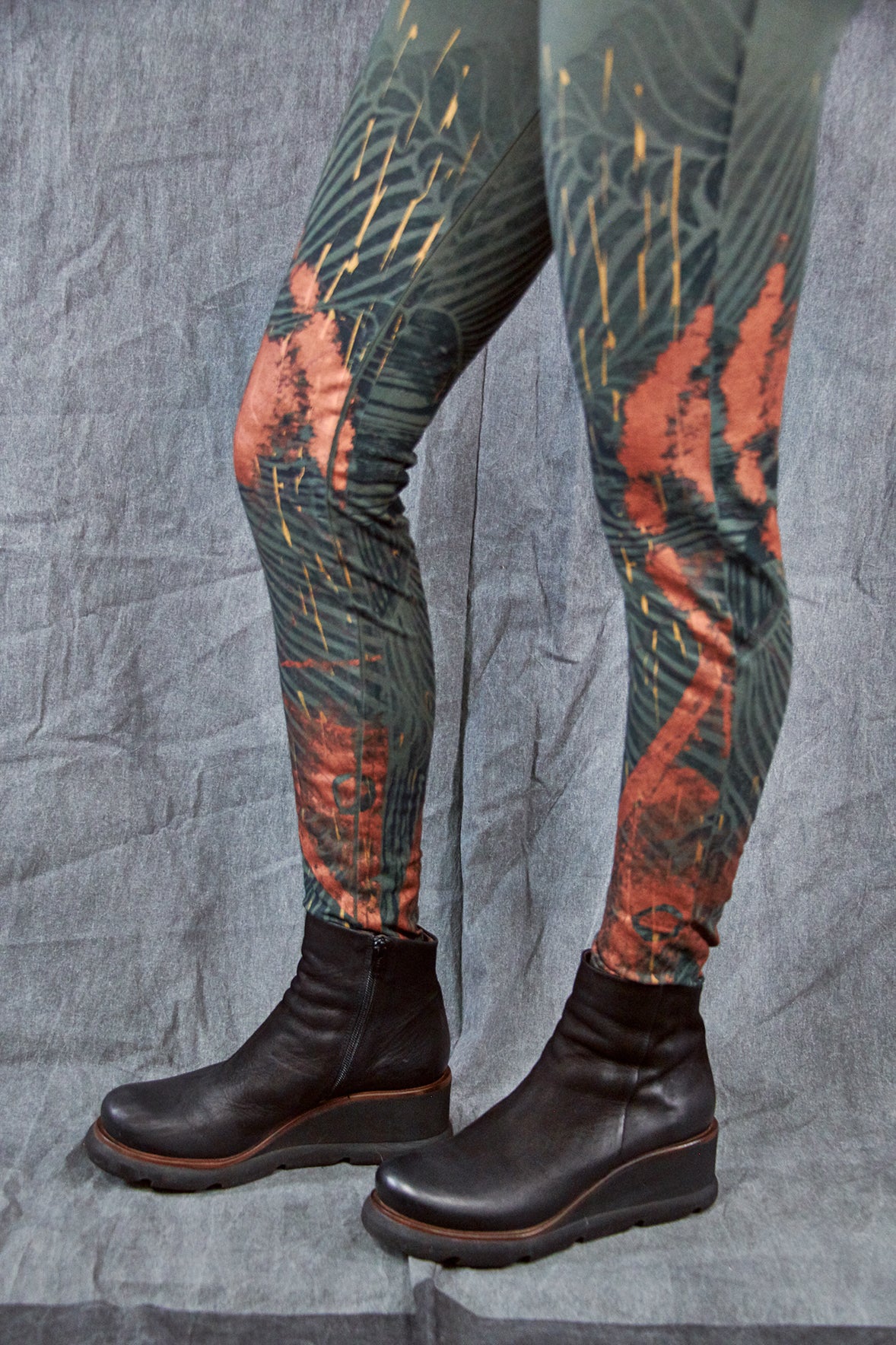 Made entirely in the USA from the knitting of our organic fabric through design to sewing. Hand printed with love in our studio one at a time. Hand printing leggings takes a long time!