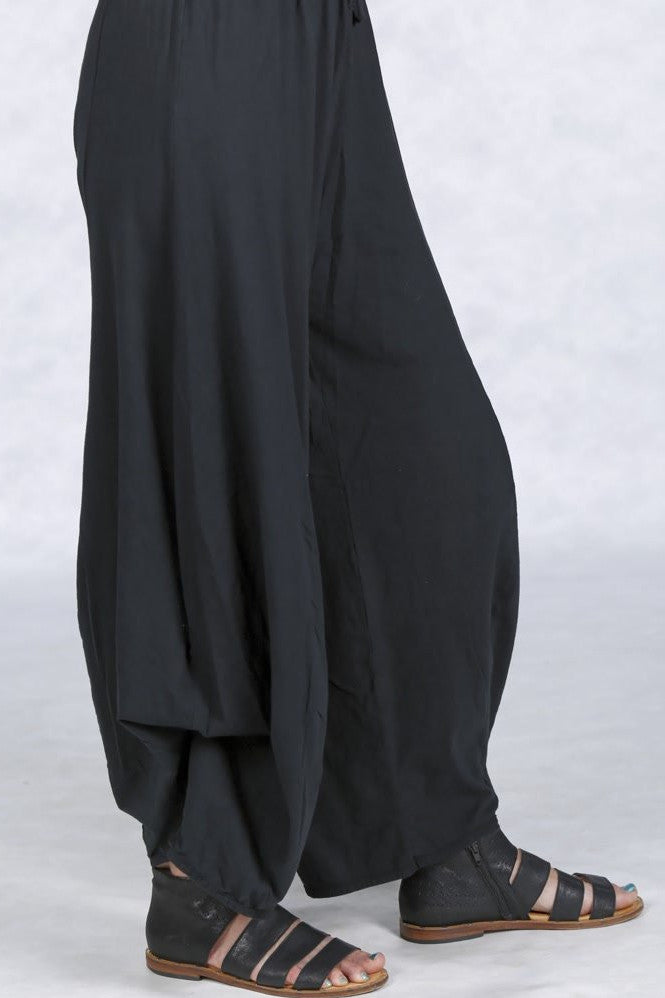 These pants are chameleons. They are, at first glance, long and drapey. They feature ties inside, which cause the pant to drape and shorten. Or leave them long for those who have more height.