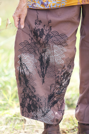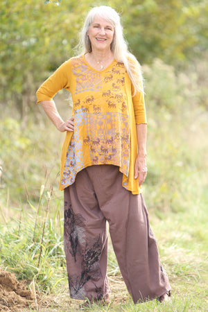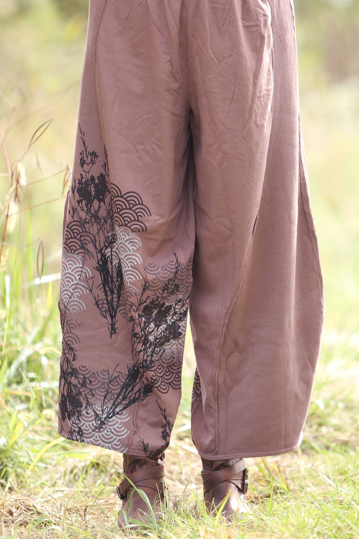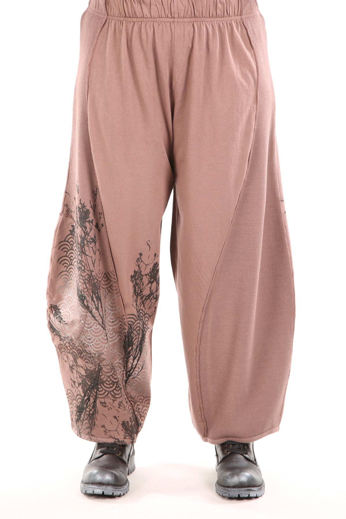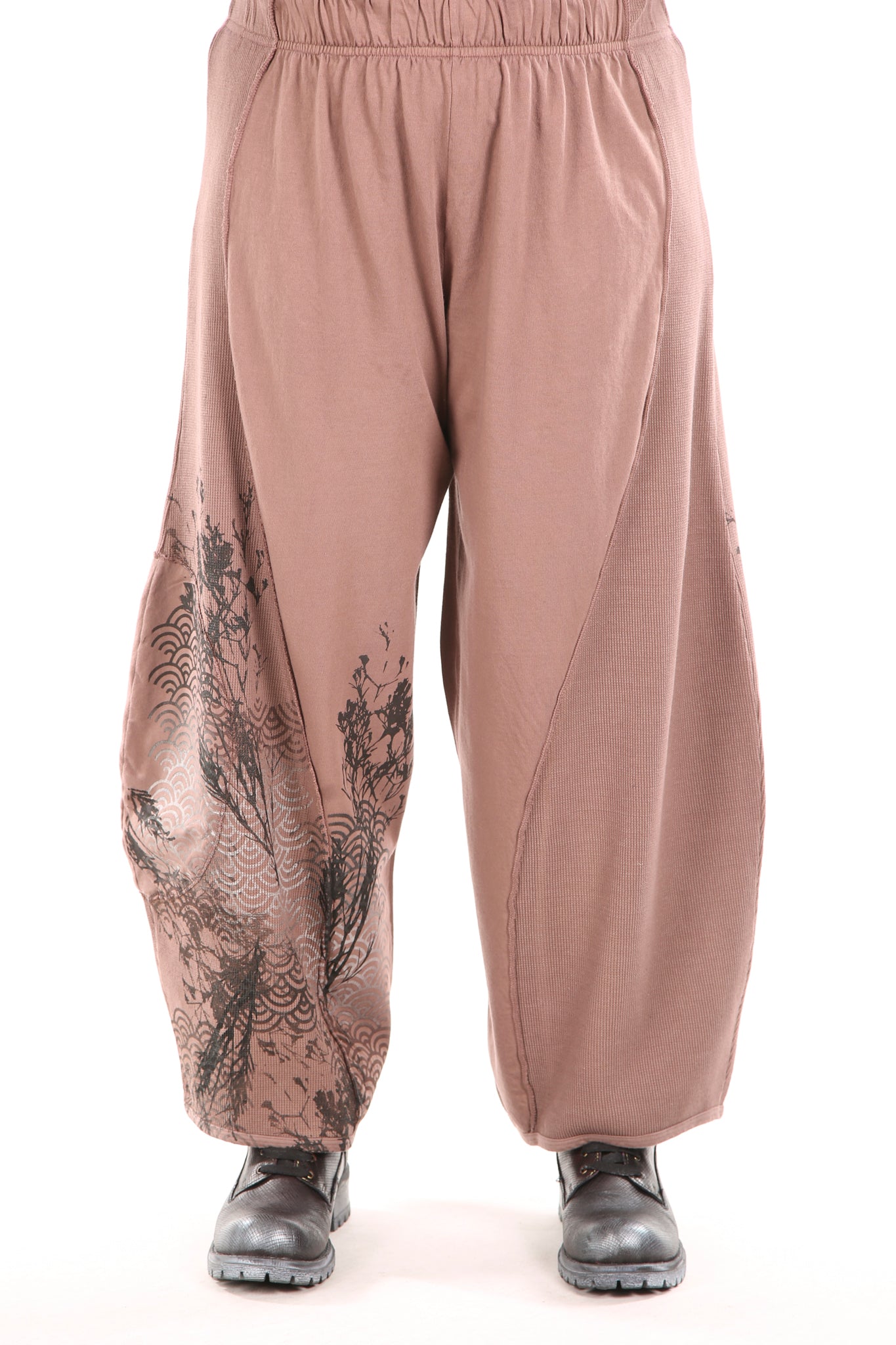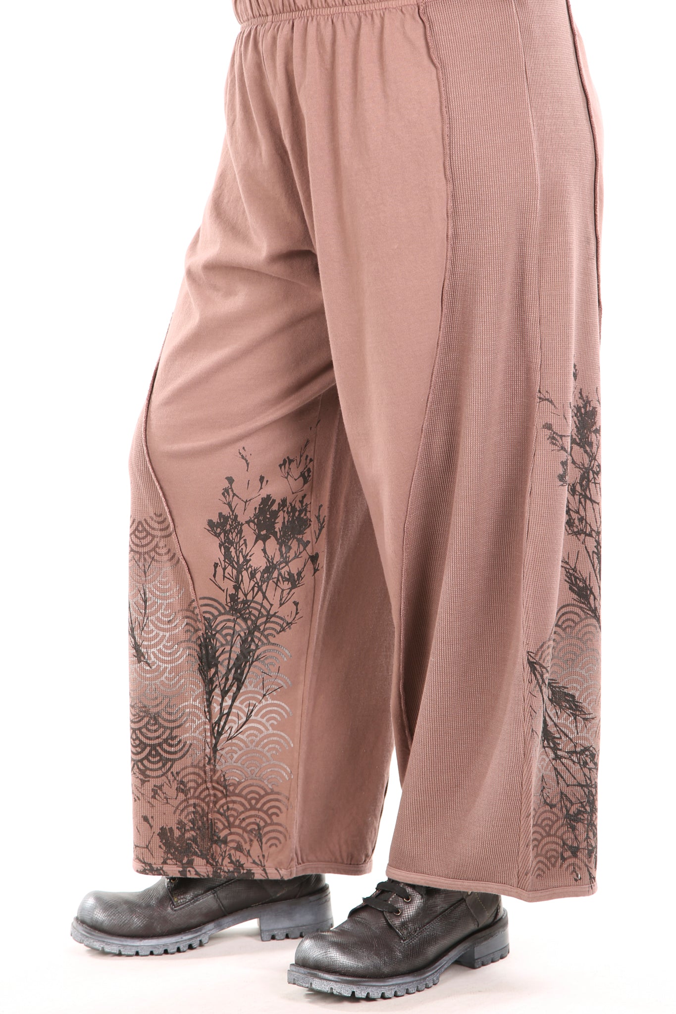- Featuring a full-length wide leg in medium weight, drapey thermal with organic cotton jersey, with a comfortable wide elastic waistband, inside out stitch lines and a rounded appliqué..