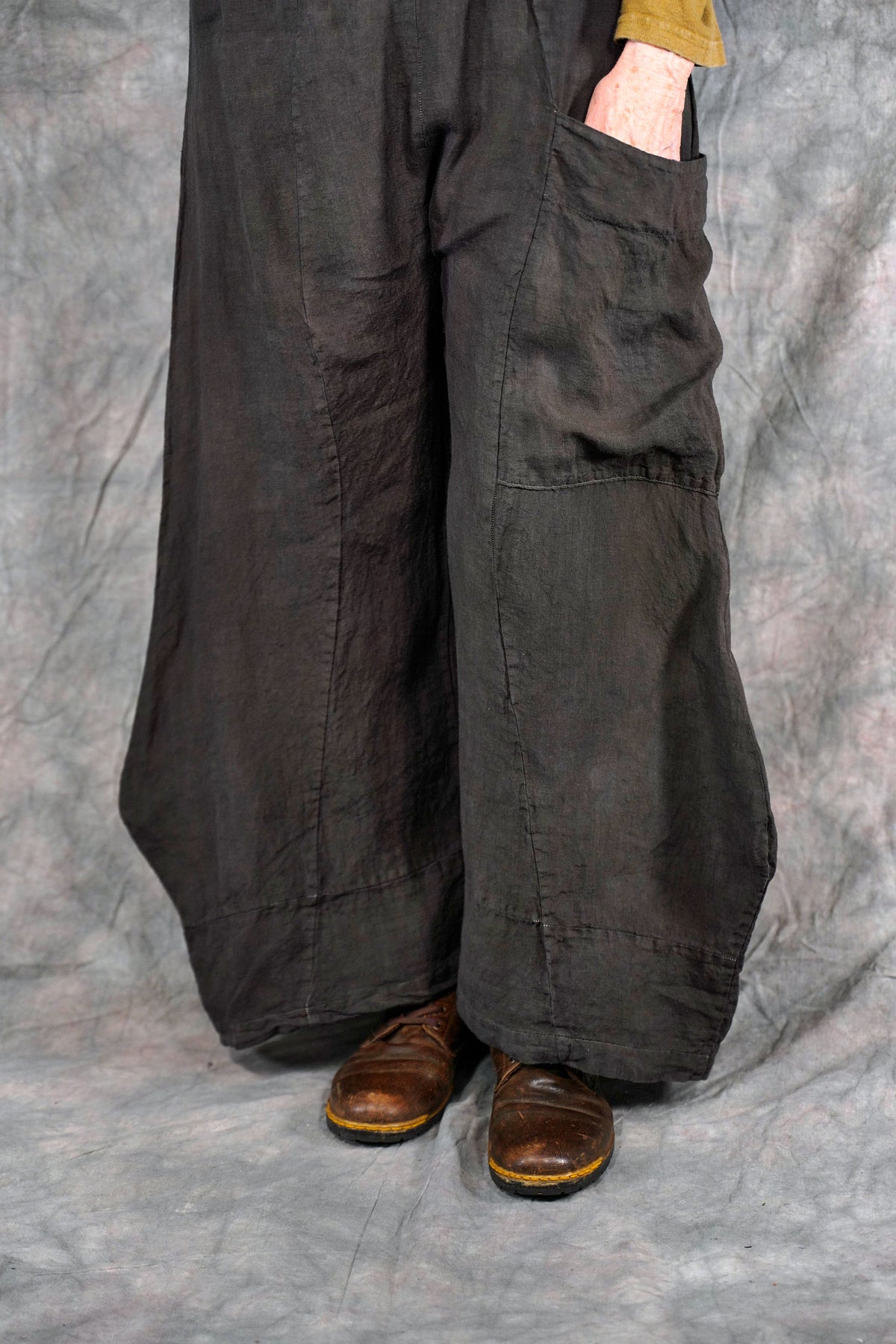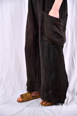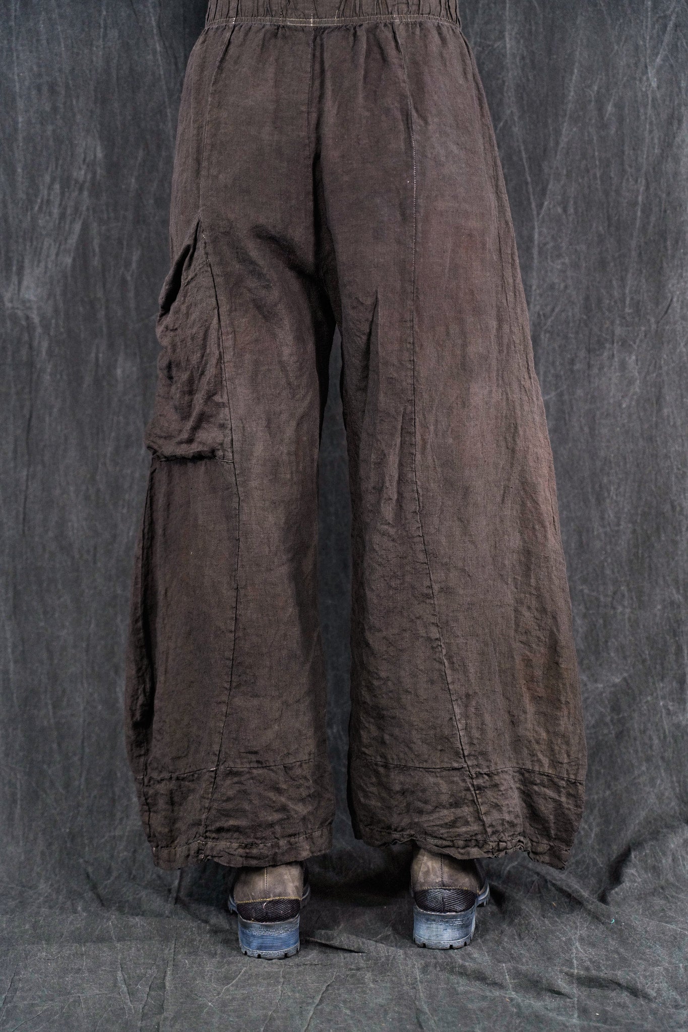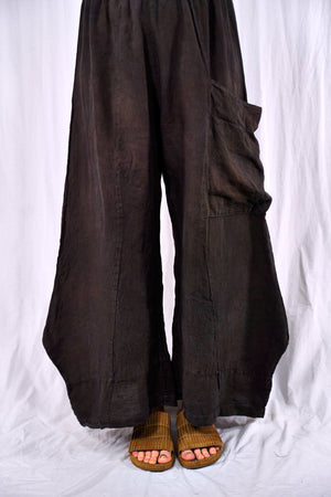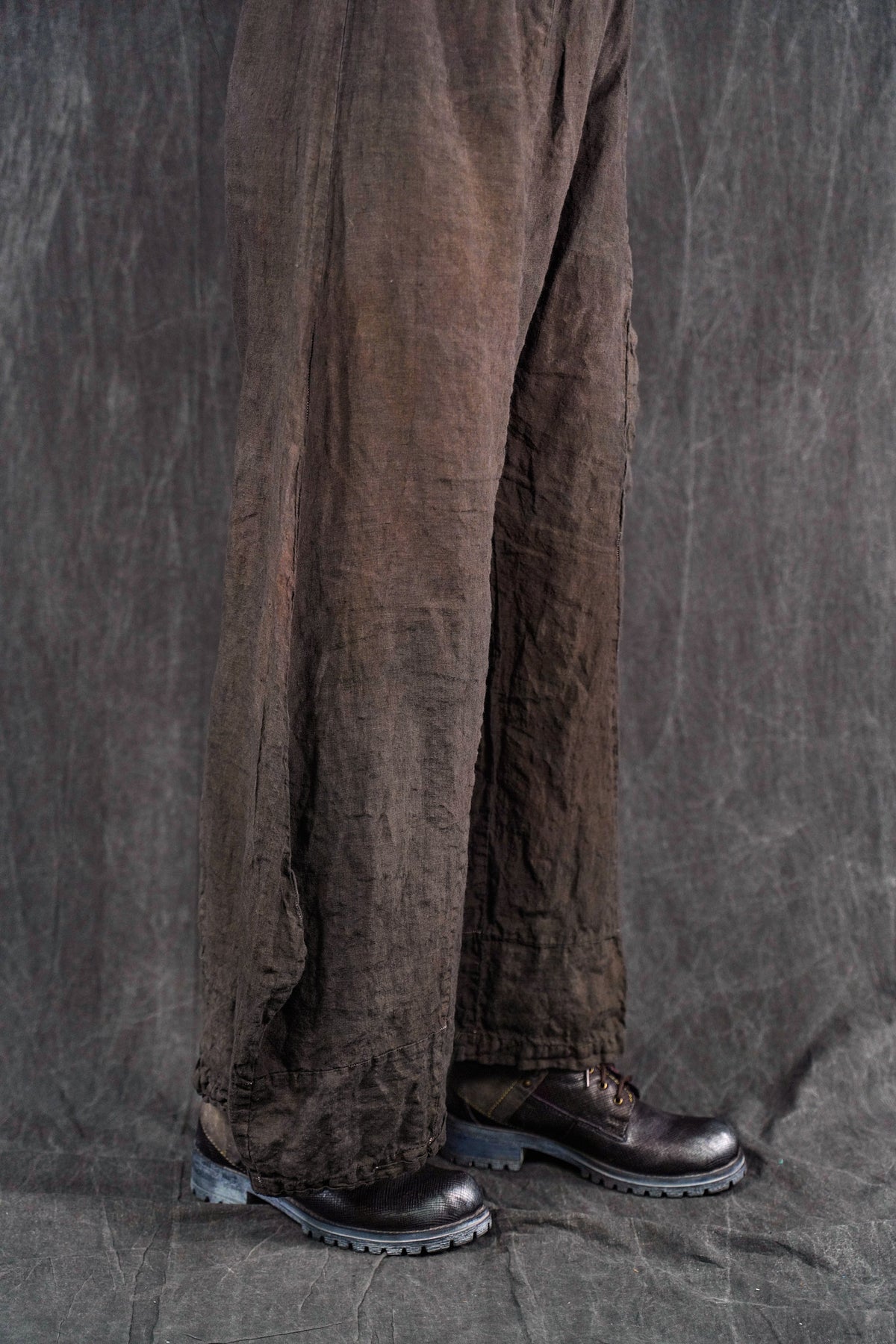 The Klee Pant takes any outfit up a notch. 2" waistband- roll it once to adjust length shorter. Wide legs curve at the out seam for an vintage, cool look. Hand dyed for a distressed, imperfectly lovely antique finish with areas of contrast stitching. Gorgeous burnt brown/charcoal color, goes with almost every color.