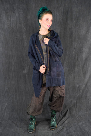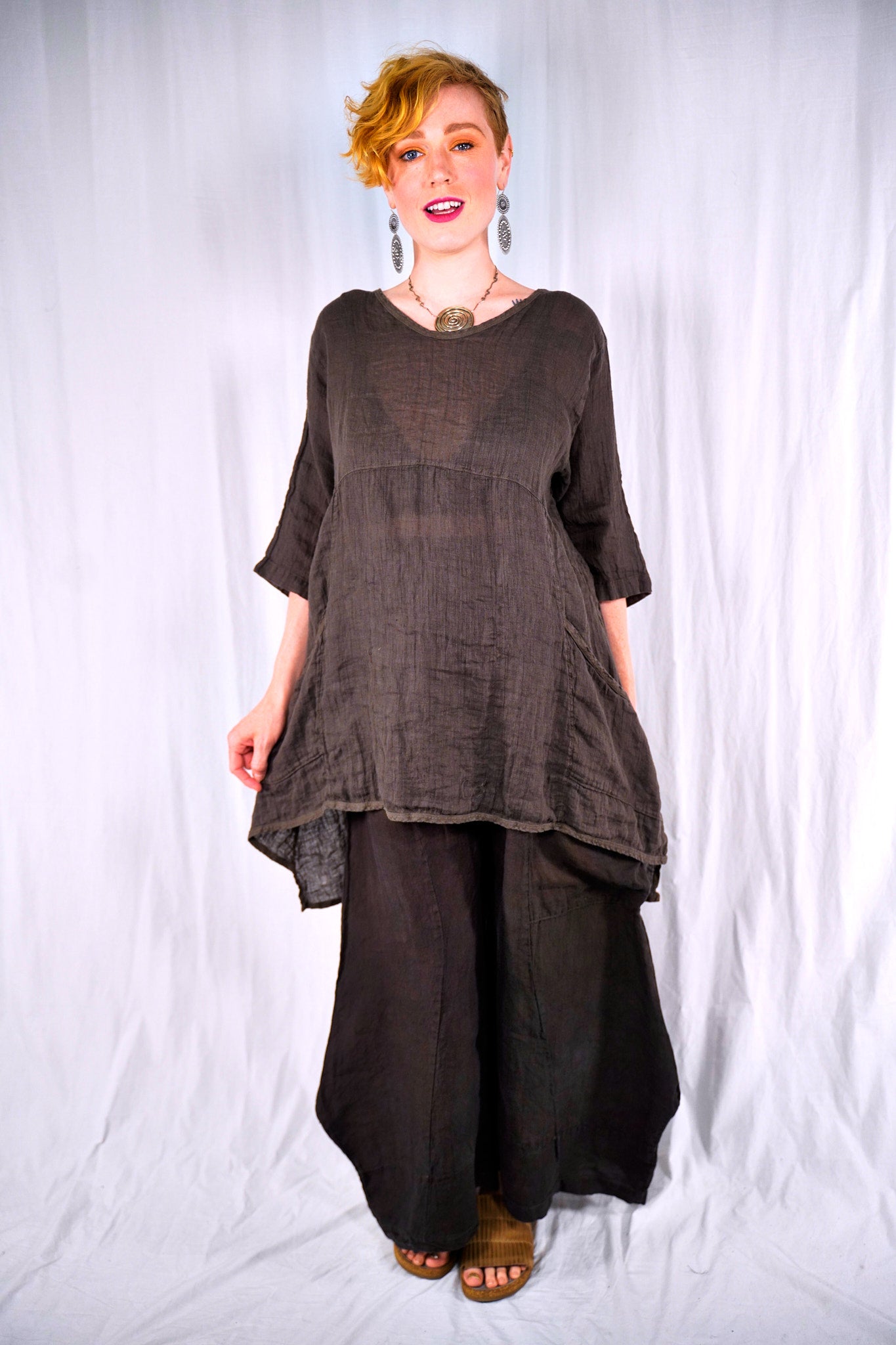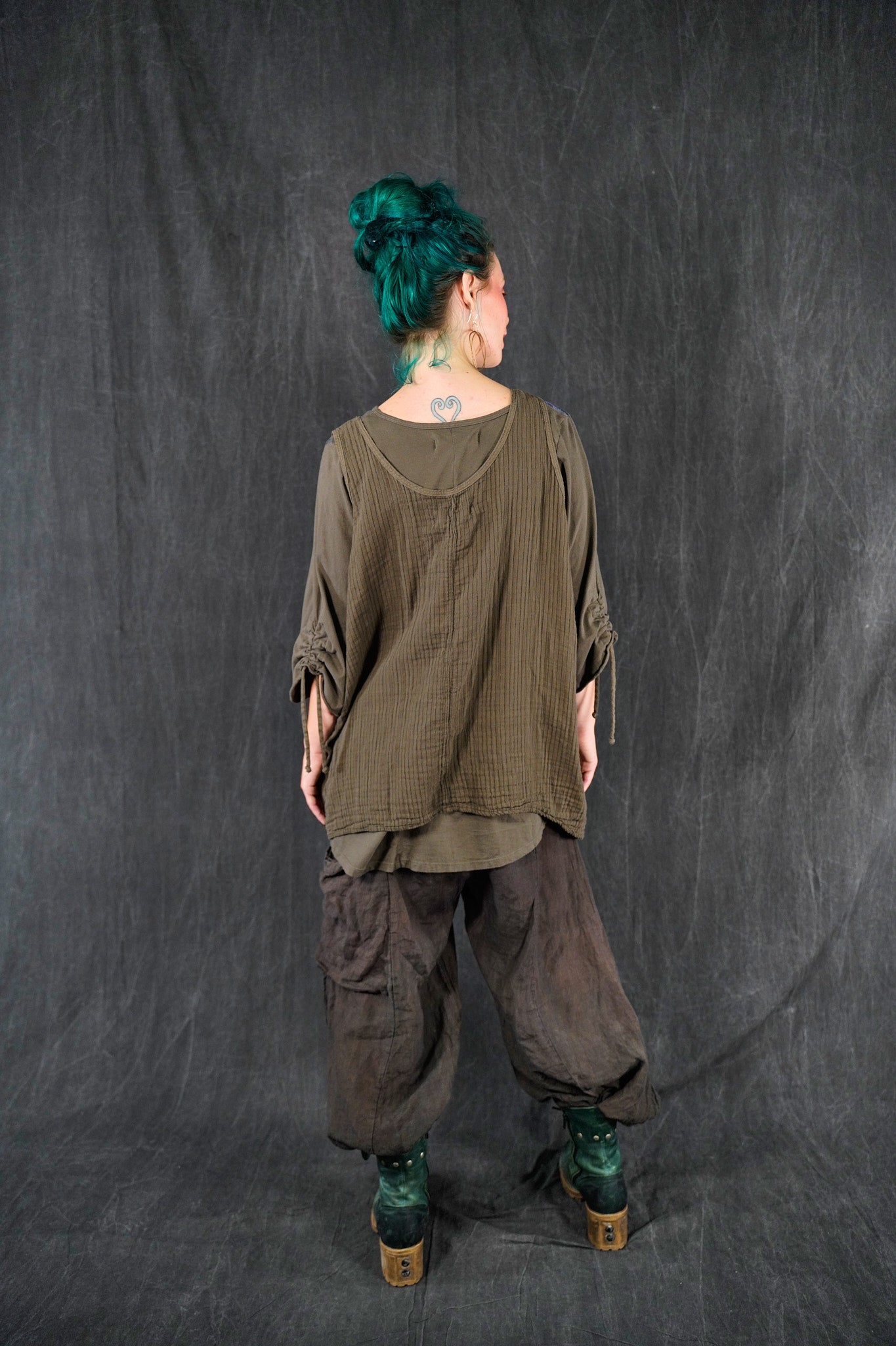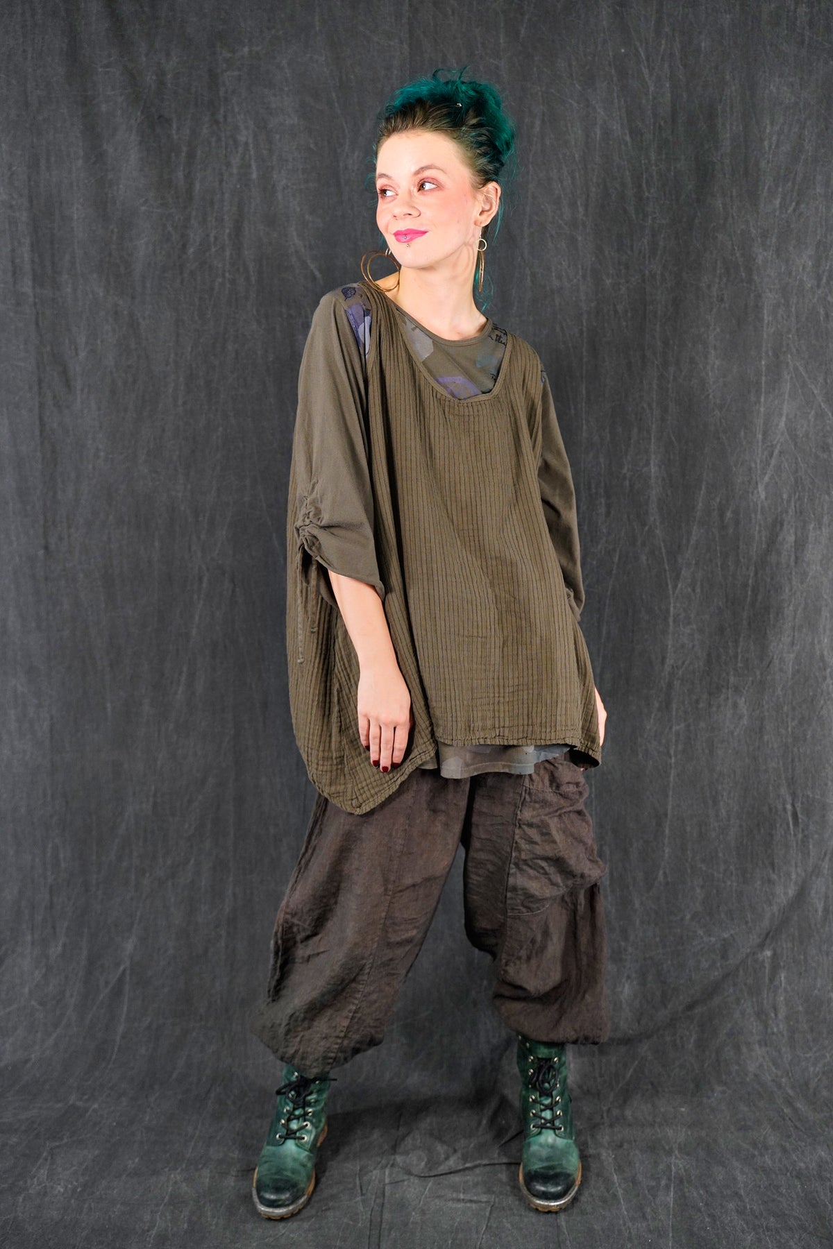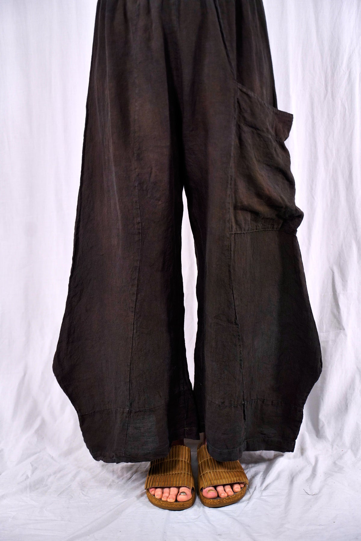 The Klee Pant takes any outfit up a notch. 2" waistband- roll it once to adjust length shorter. Wide legs curve at the out seam for an vintage, cool look. Hand dyed for a distressed, imperfectly lovely antique finish with areas of contrast stitching. Gorgeous burnt brown/charcoal color, goes with almost every color.