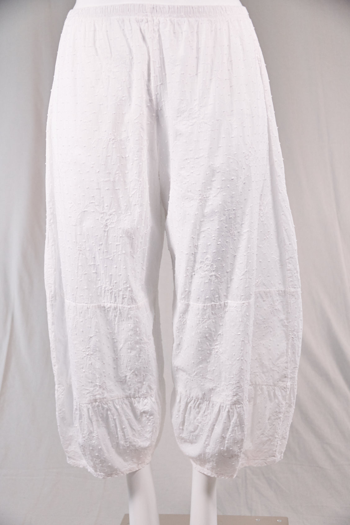 Meadow Pant in an airy, soft, & breathable embroidered cotton. Balloon shaped structure on the bottom creates visual interest & a flattering, rounded shape. These are designed as ‘bloomers’ to layer under shorter dresses or tunics. Elastic waistband sits at the natural waist. These pants are perfectly sized for shorter bodies & will look nicely cropped on taller individuals.