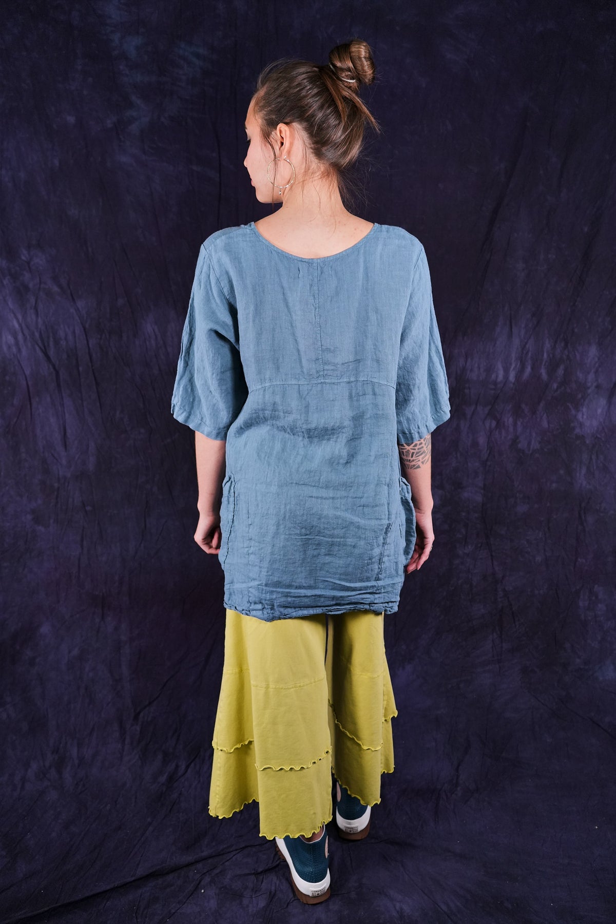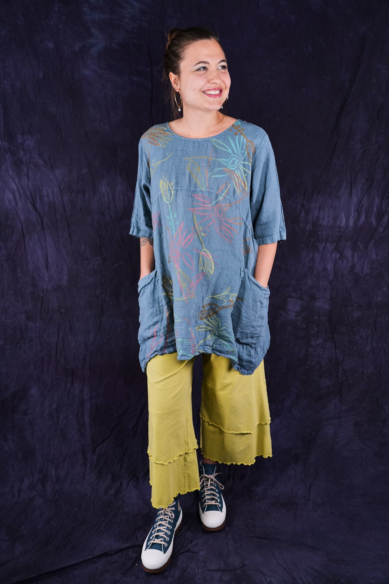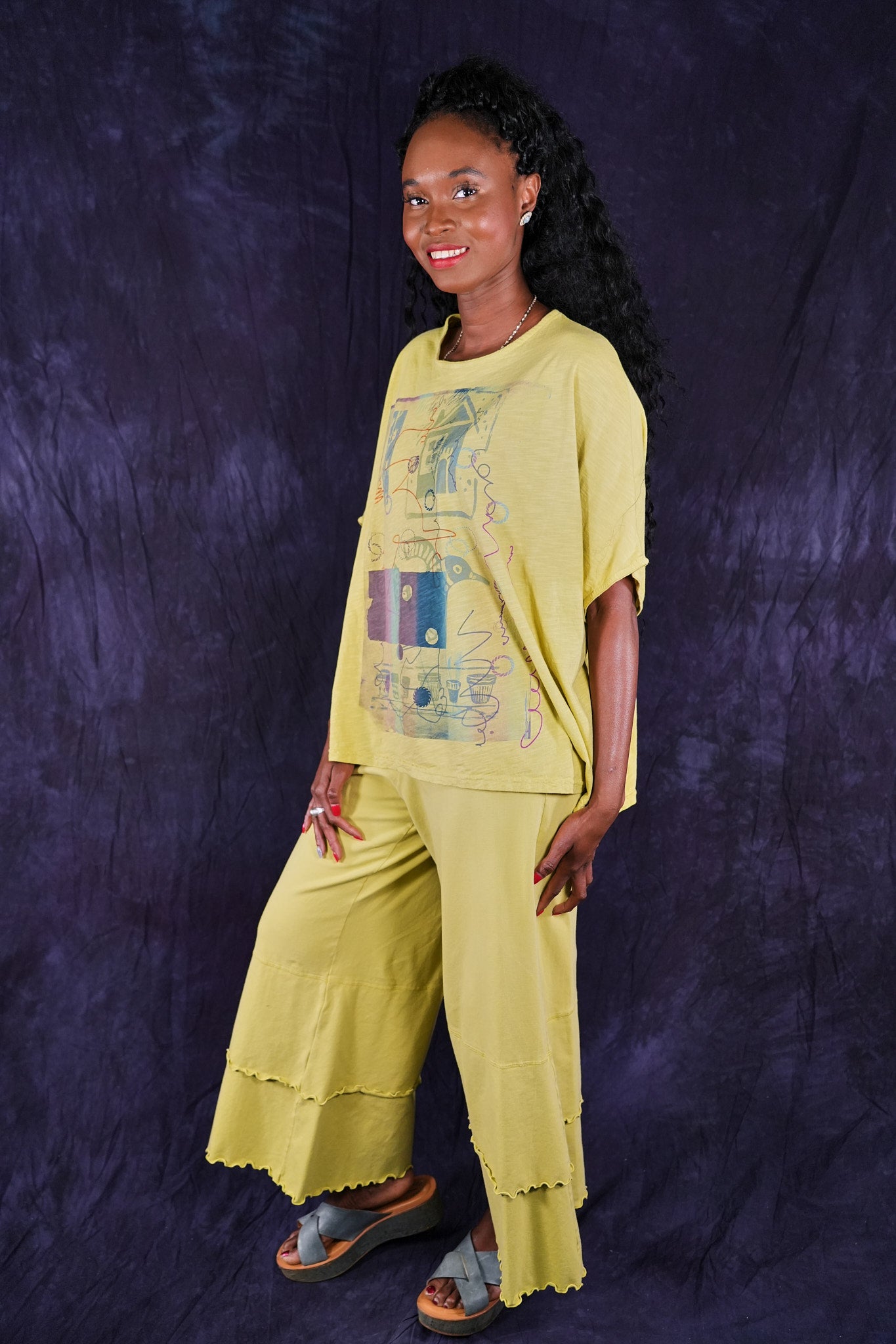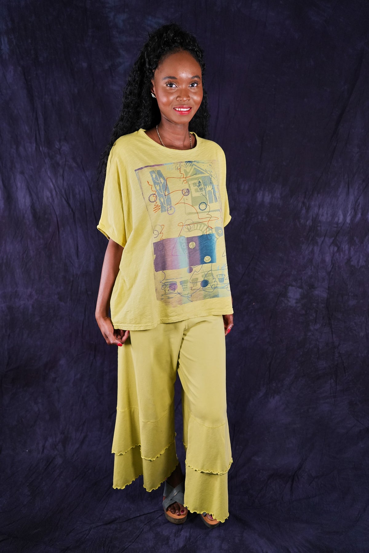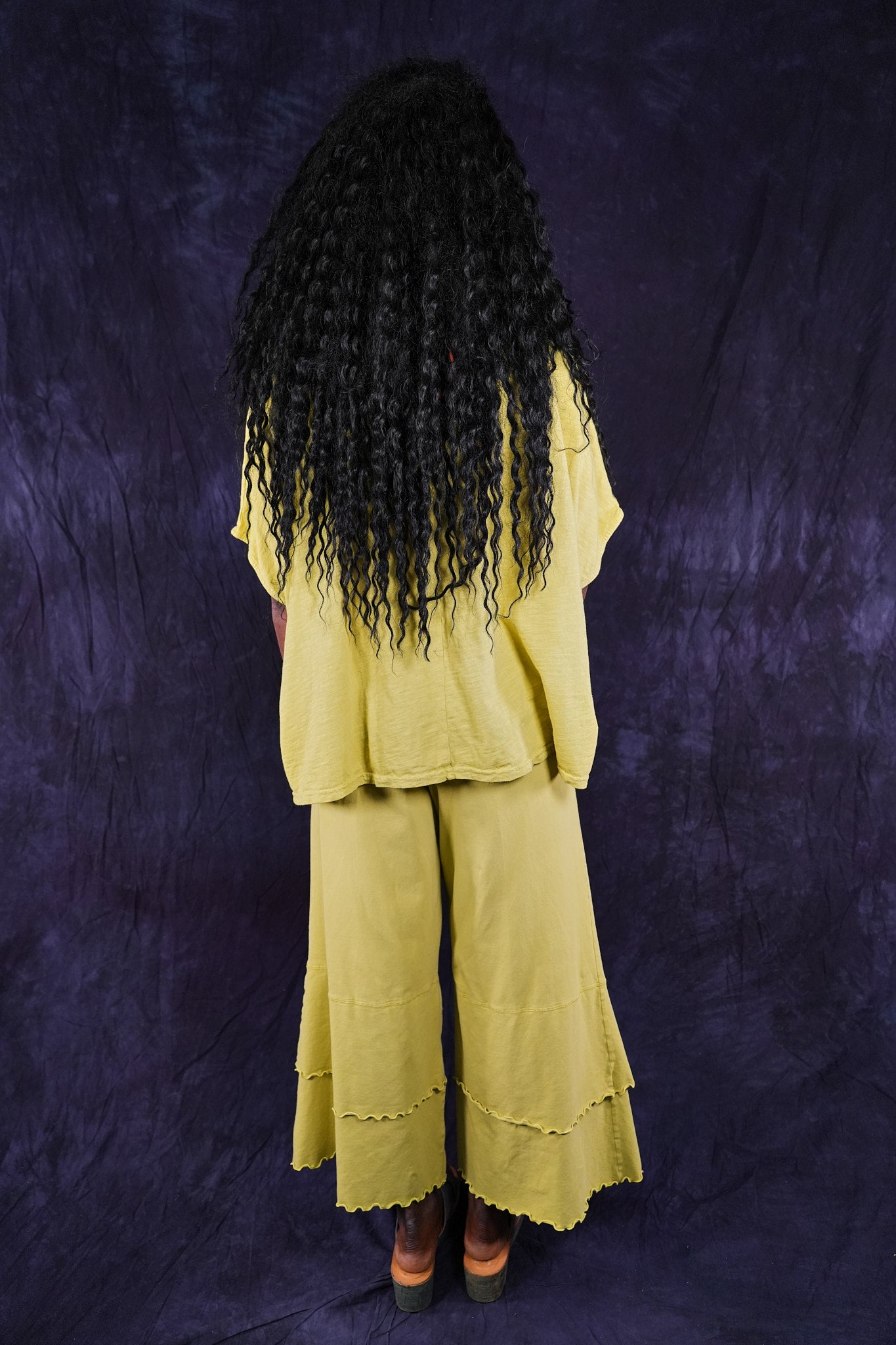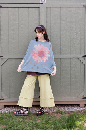 Our favorite Petaloon pants, these have extra wide legs and double layers at the bottom which are trimmed in a feminine lettuce-edge. Made from soft and stretchy organic cotton lycra. The can be layered over and styled many ways. They are a great piece to mix into your wardrobe.