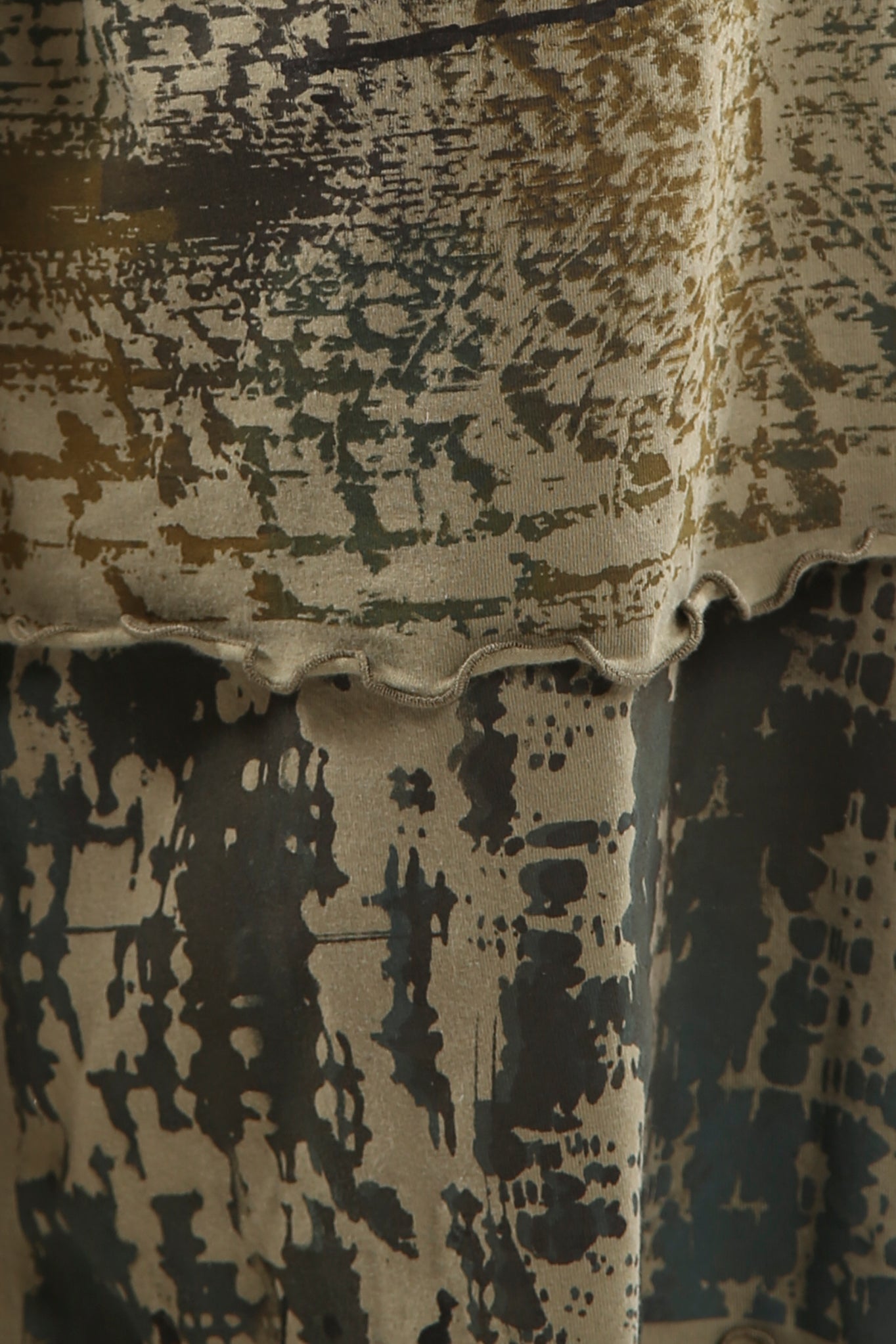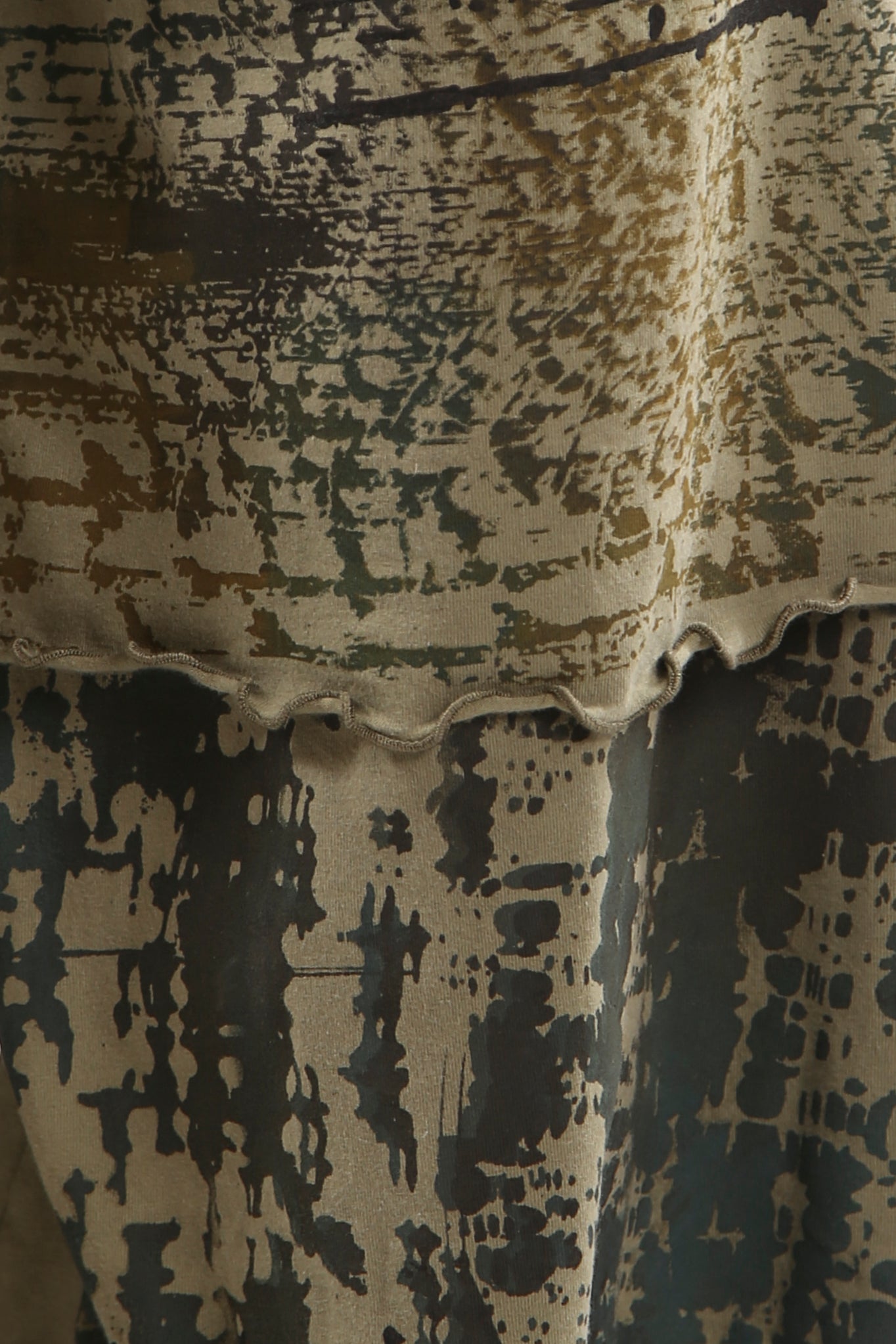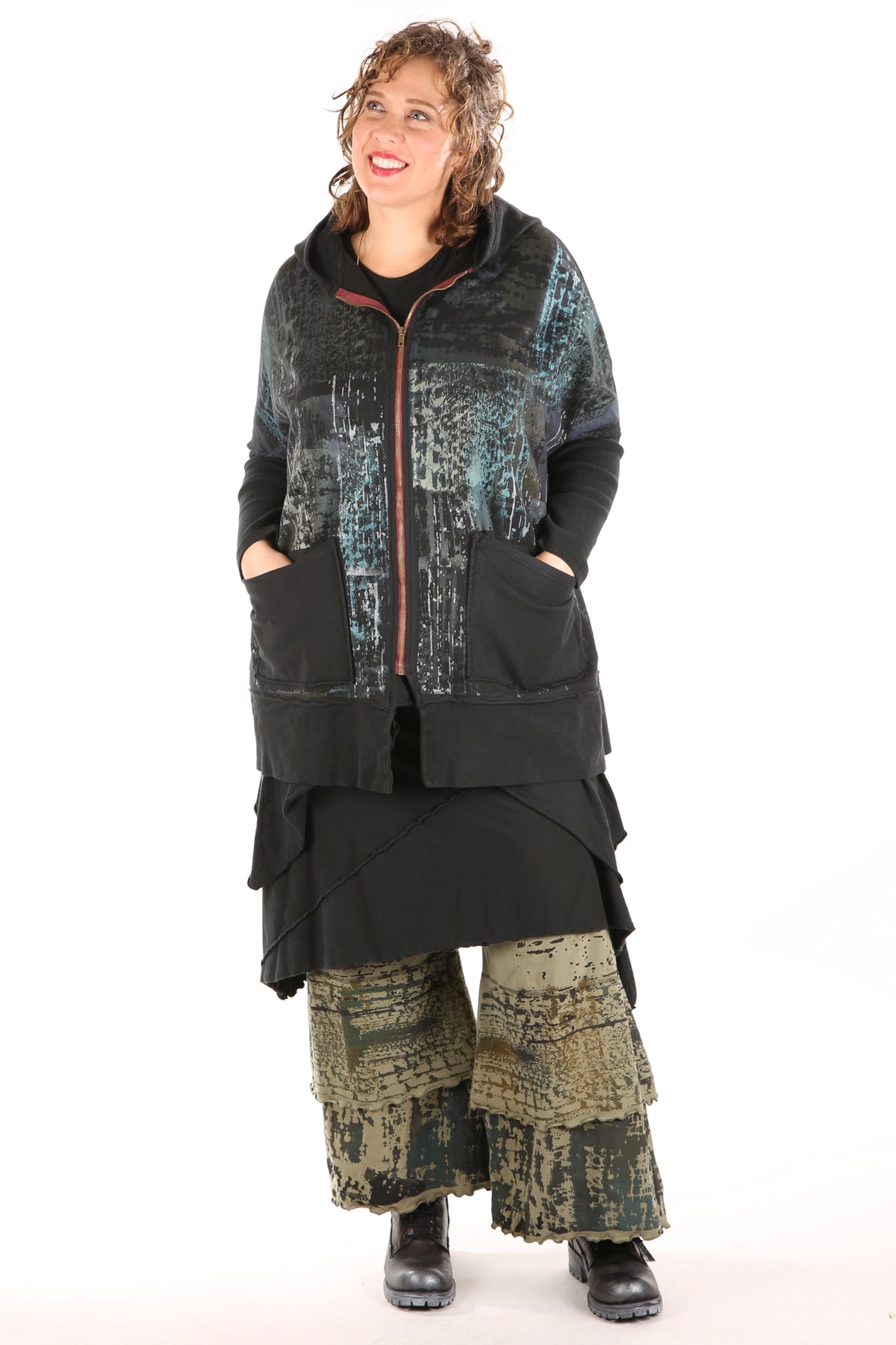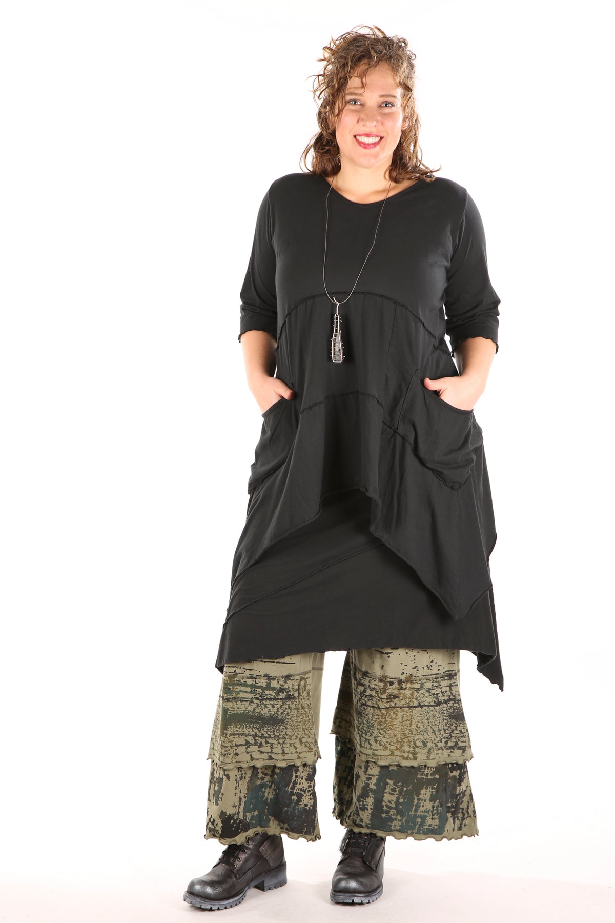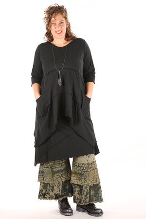 A wide legged design that complements our longer tunics perfectly.UNPRINTED . Tiers are edged with lettuce stitch which is slightly curly looking and adds texture. Check measurements on length. This version is our regular weight organic cotton with stretch, a very comfortable cotton lycra jersey. Perfect under any of our longer tunics/shorter dresses, or organza shifts.