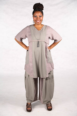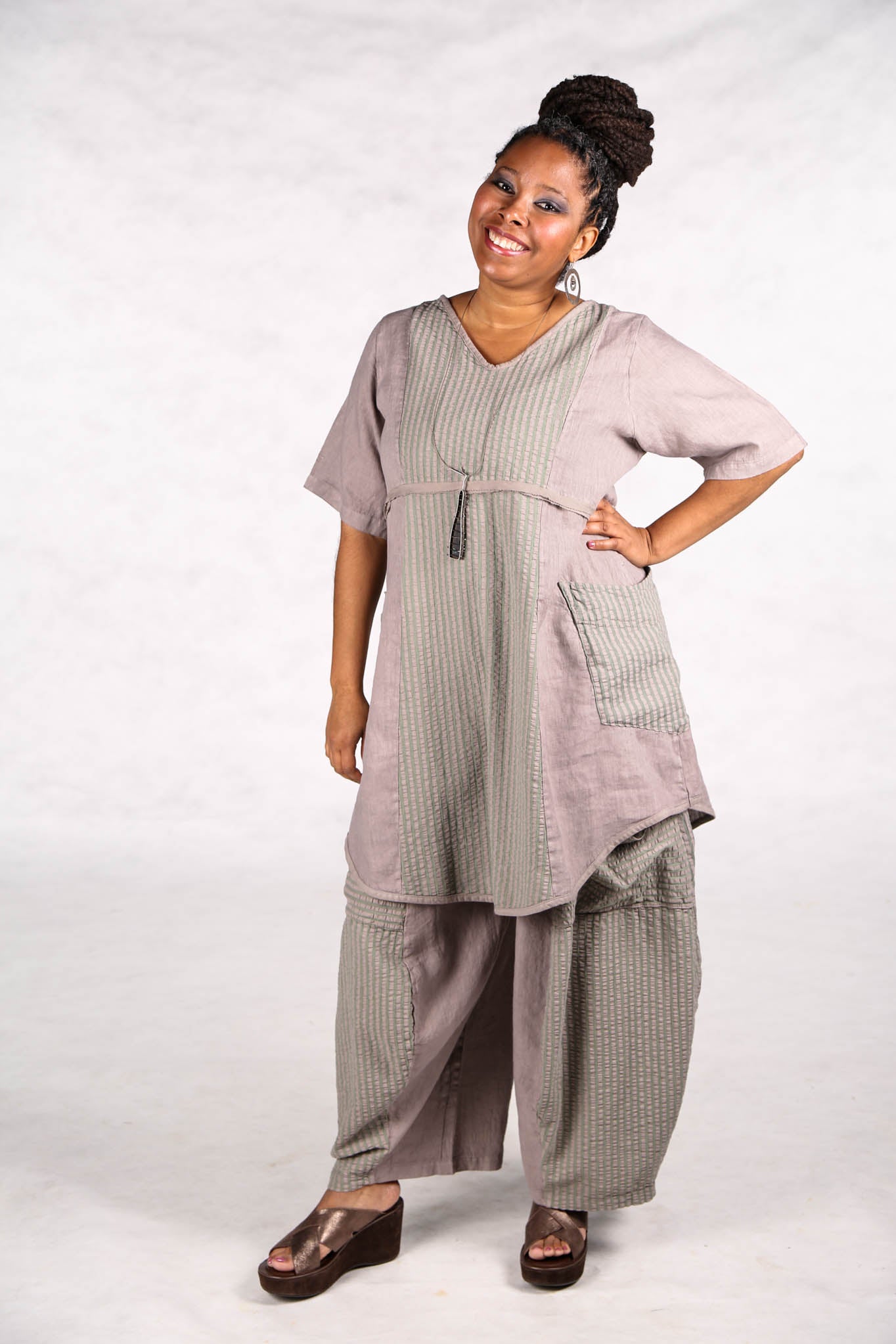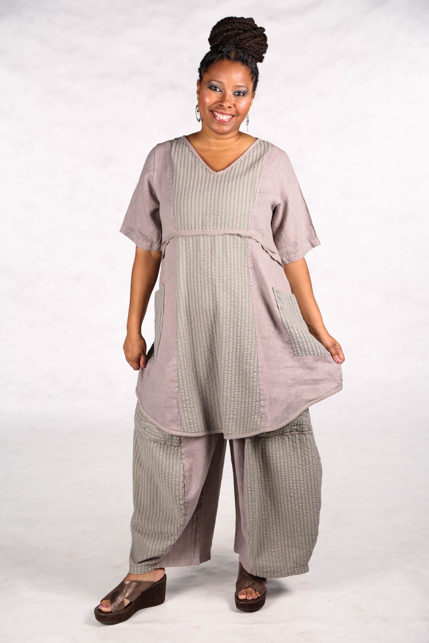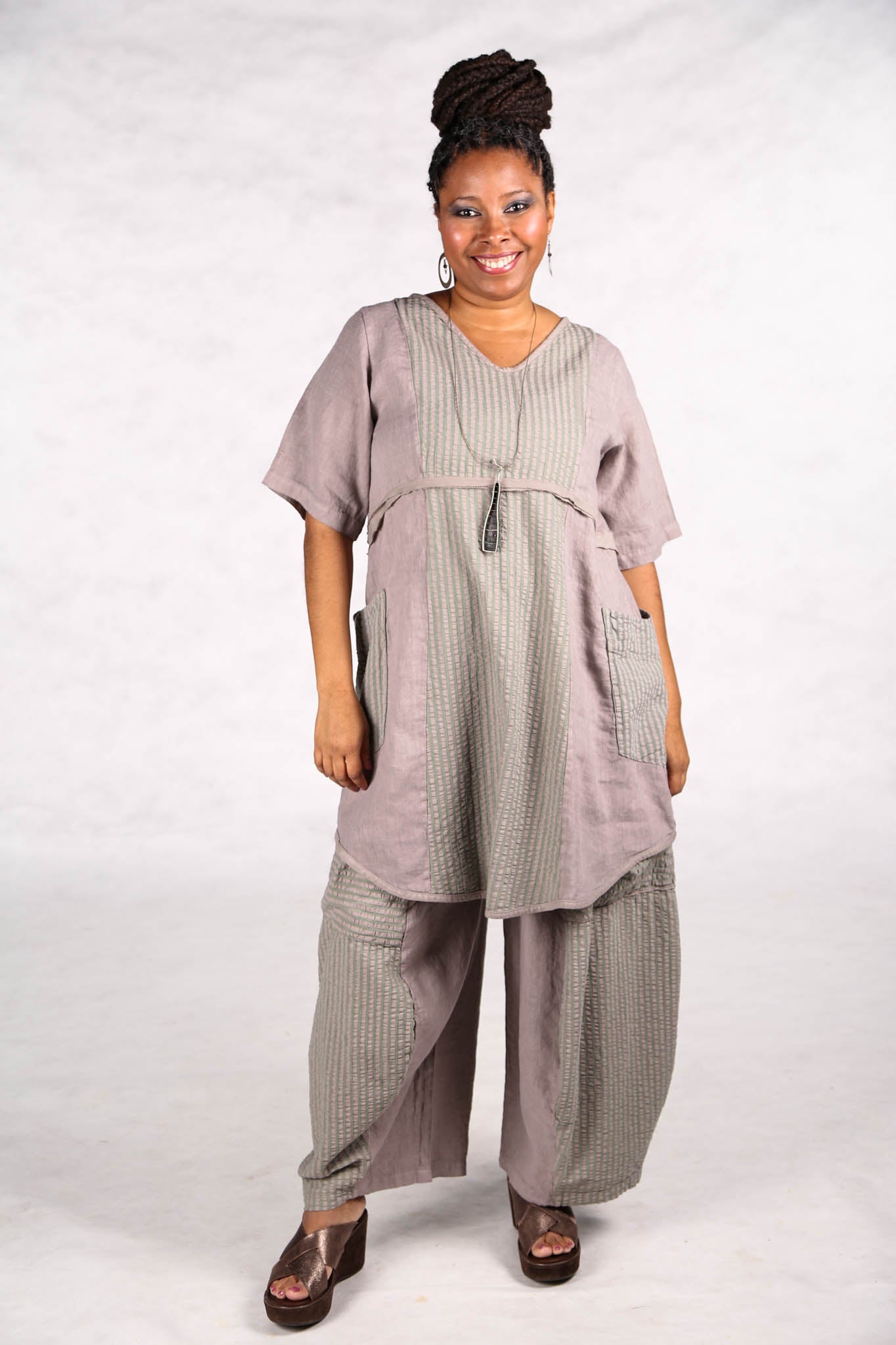 This version of our 3-D pant has striped seersucker panels on each side! One of our best-selling pants for all occasions, this lightweight full-length version features an extra wide leg and seaming detail that creates a three-dimensional, almost geometric billow in the leg.