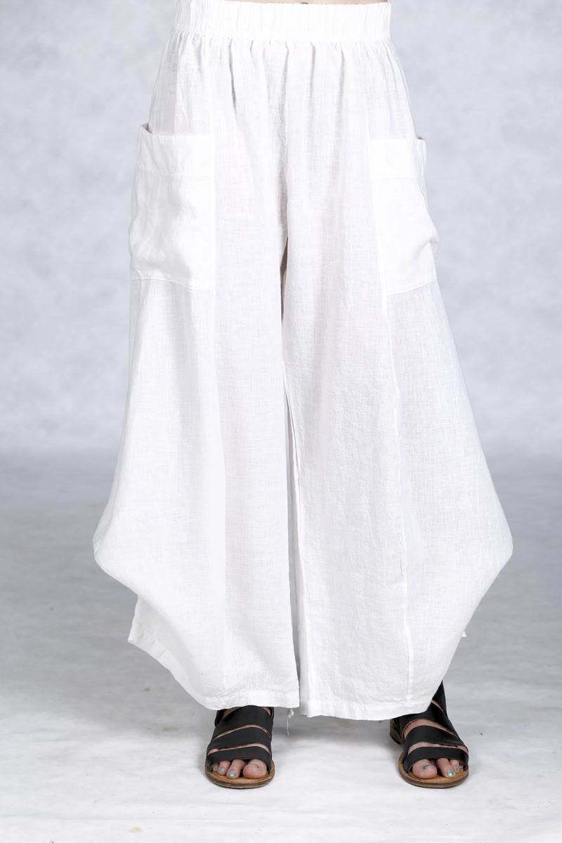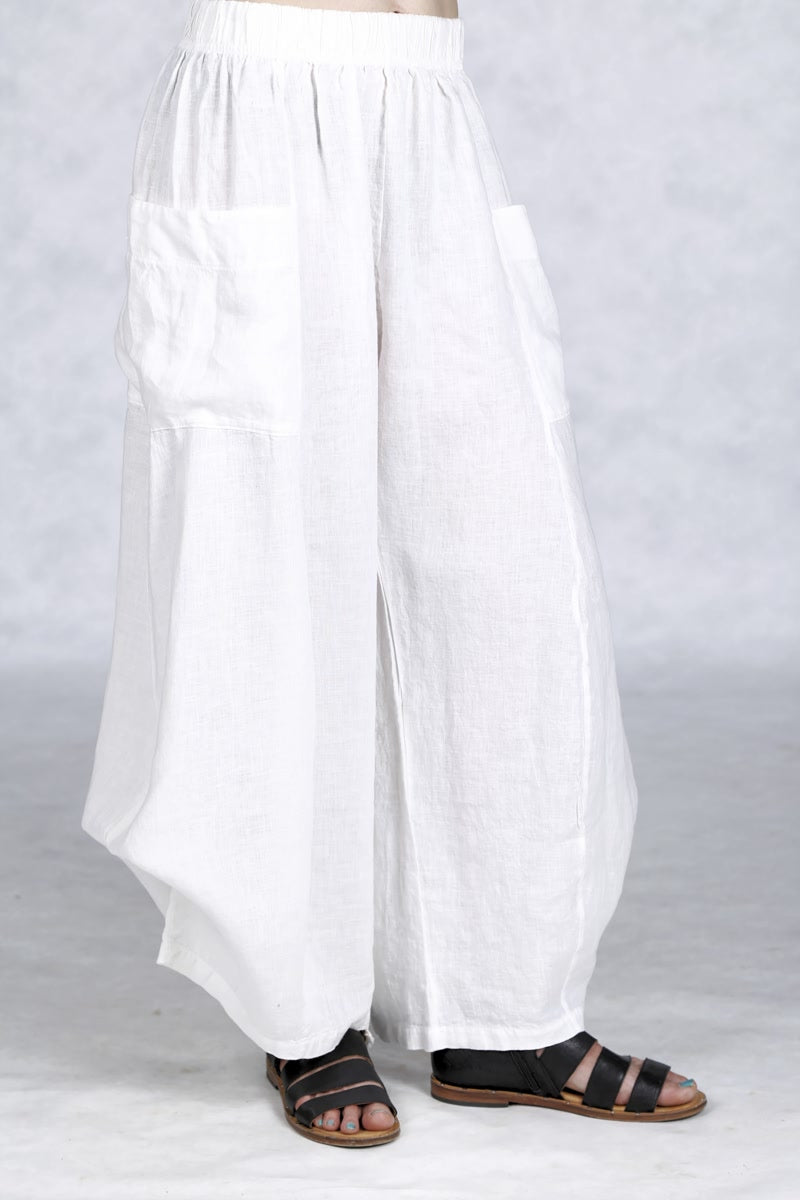 A linen pant with a drape and billow of pure luxury! The secret is in the ties located inside the leg hem. You can leave the ties undone and have long full pants, or tie them up and create the billowing bell at each leg. This feature also allows you to adjust the length up to six inches as needed.