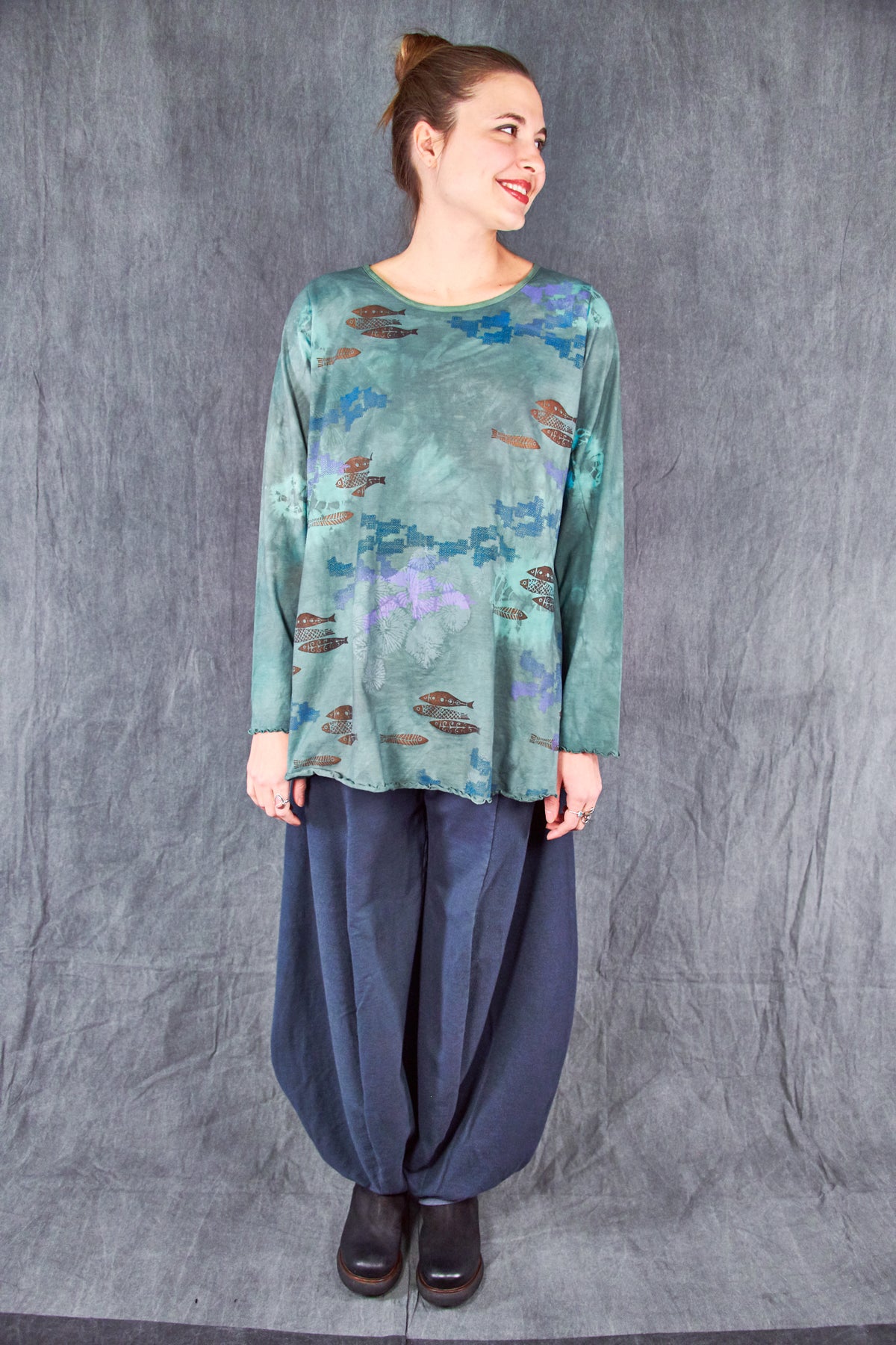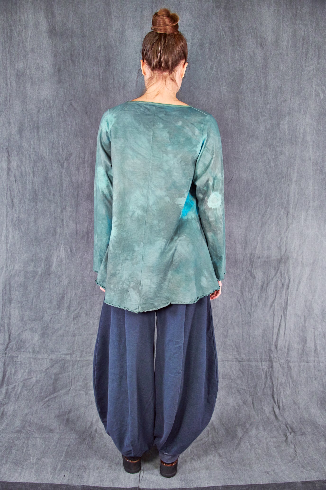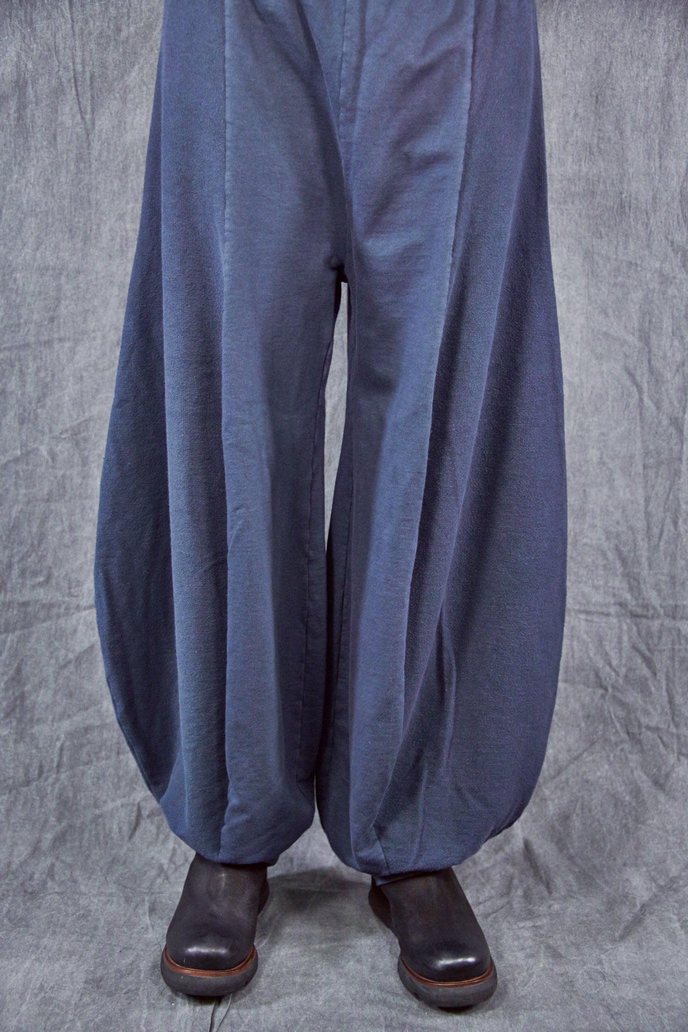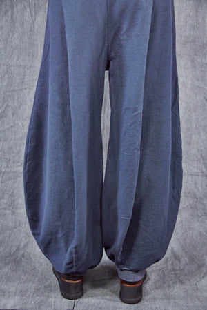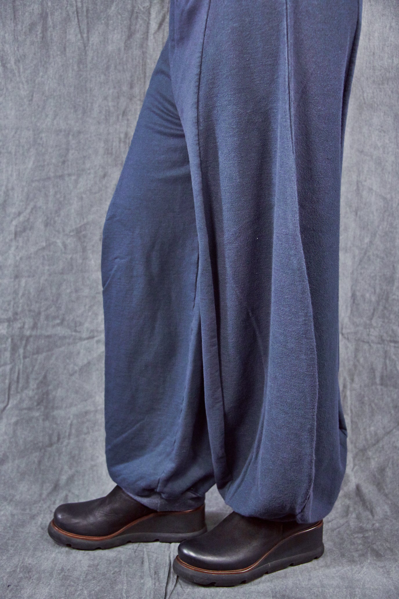 Curved seaming creates an interesting silhouette. 2" waistband, rib cuffs.  This thick french terry pant will be an instant favorite! Rolled up these have a completely different look.