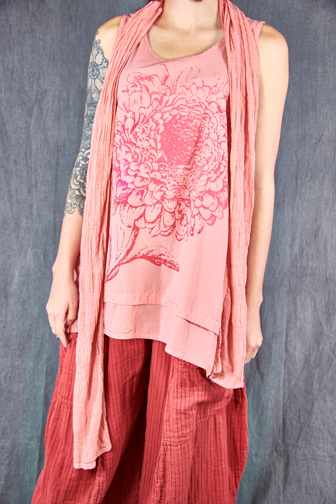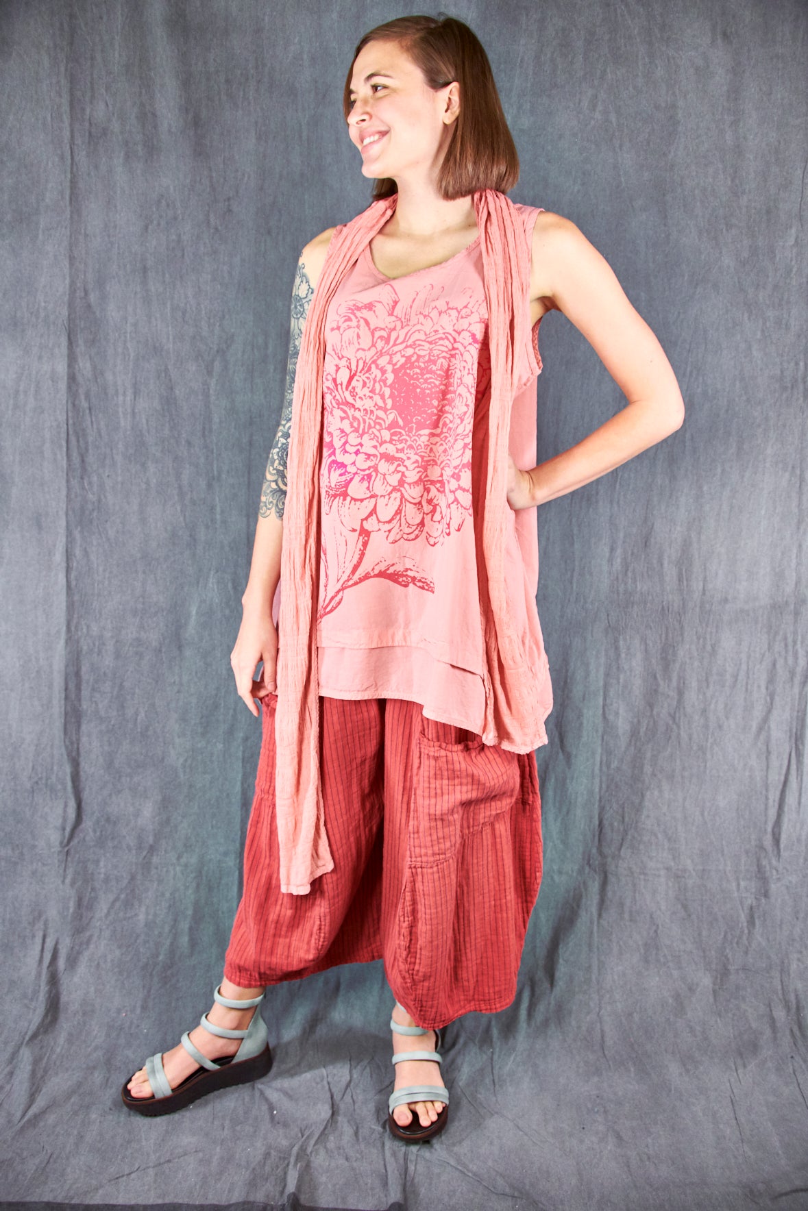 Loose, comfy light and airy double layer cotton double gauze summer pants. Thin stripes in subtle blue. Stretchy comfortable 2" waistband, shaped wide legs, pockets. Length can be adjusted by folding at the waist or can be worn higher as the rise is generous.