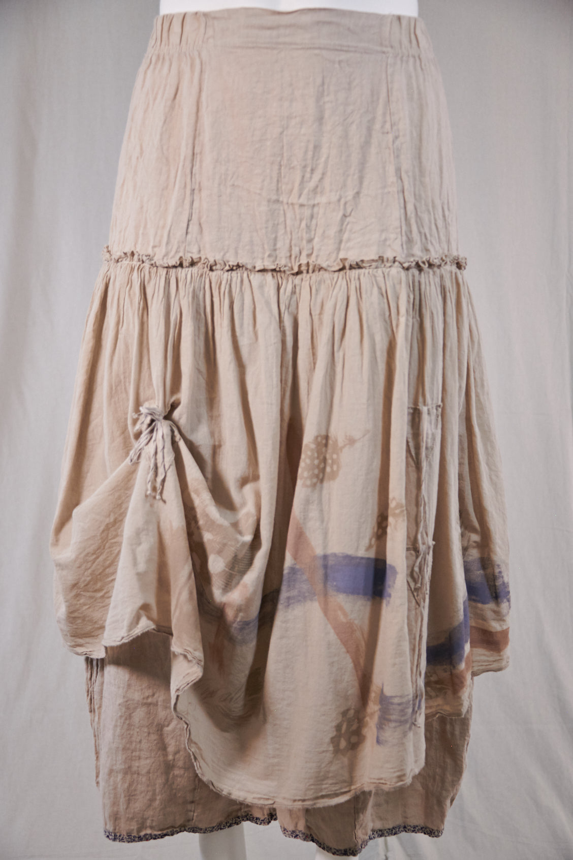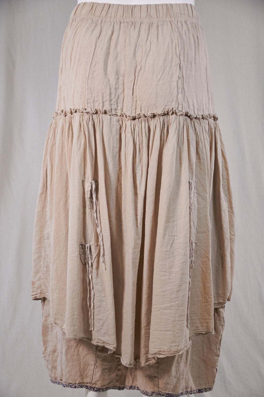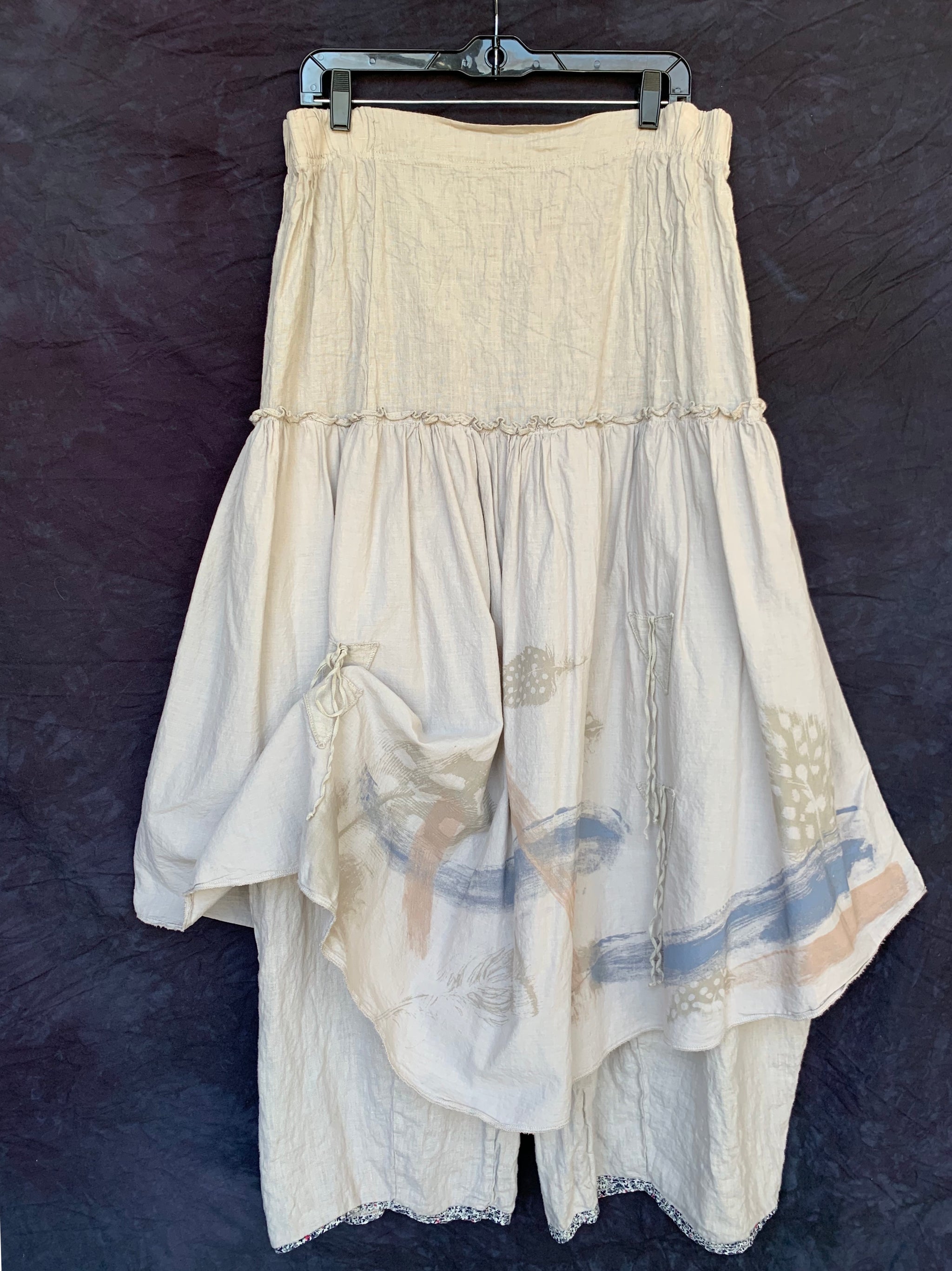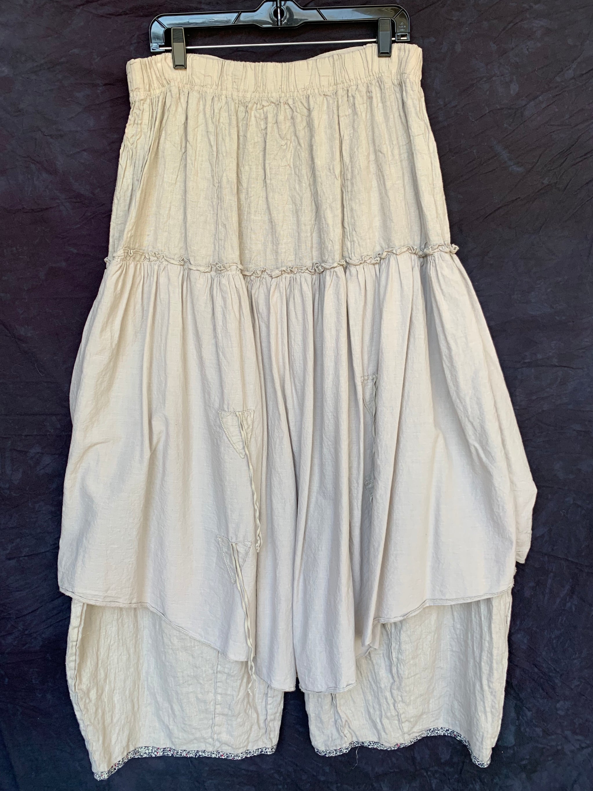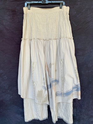 The Fusion Skirt is an amazing creation that fuses the comfort of a pant with the look of a really cool skirt. These incredible lagenlook bottoms feature a generous linen pant with an extra-long rise and the lightest weight cotton voile over-skirt attached at the hip. Two ties in front and two in back allow for the skirt to be left long and flowing, styled in romantic billows all around, or tied just in one spot to showcase your fabulously eclectic style.
