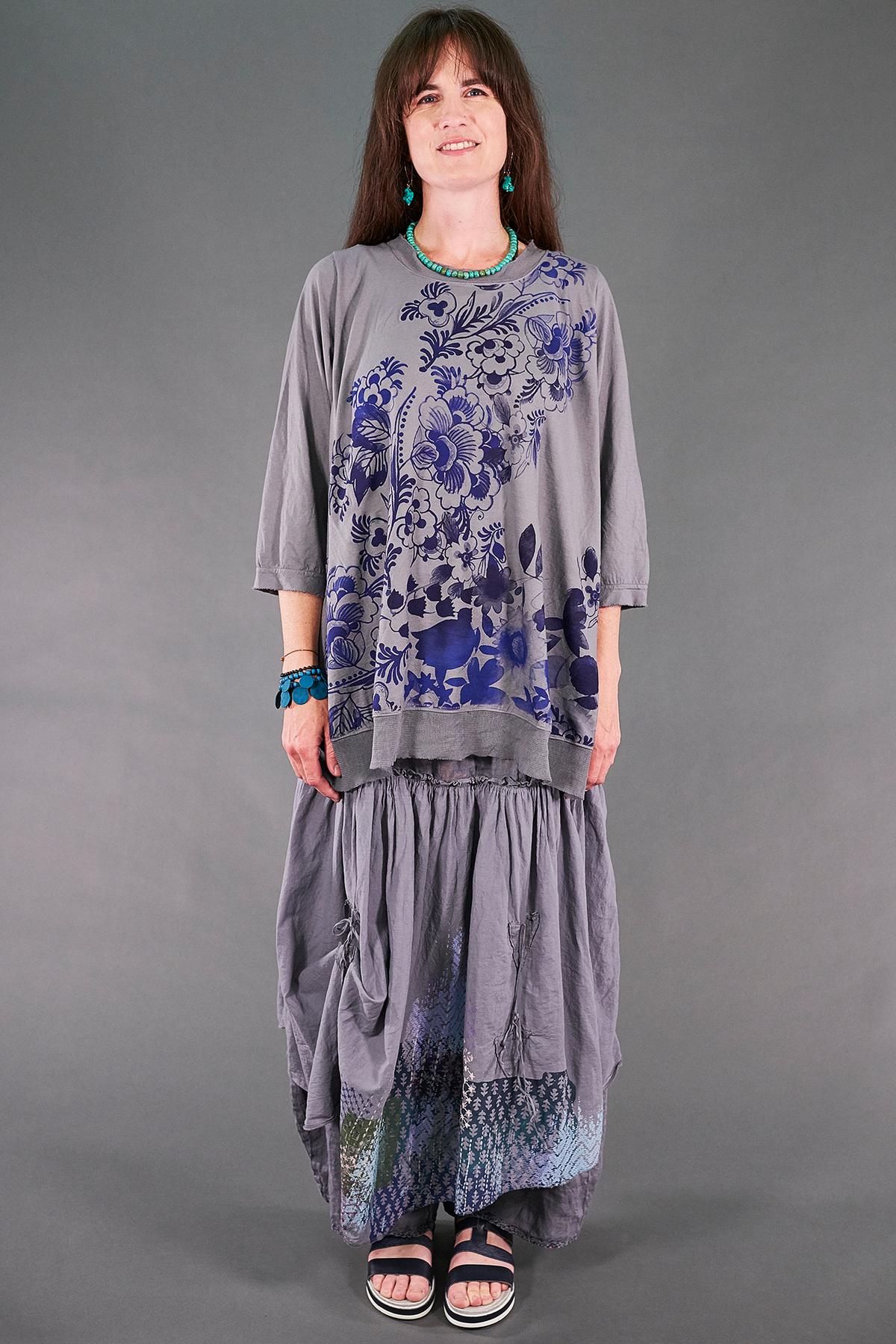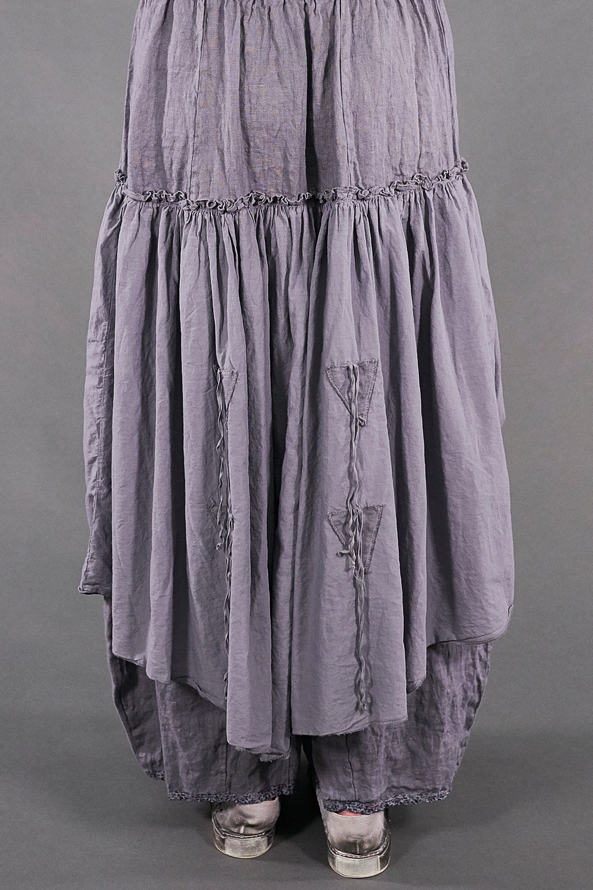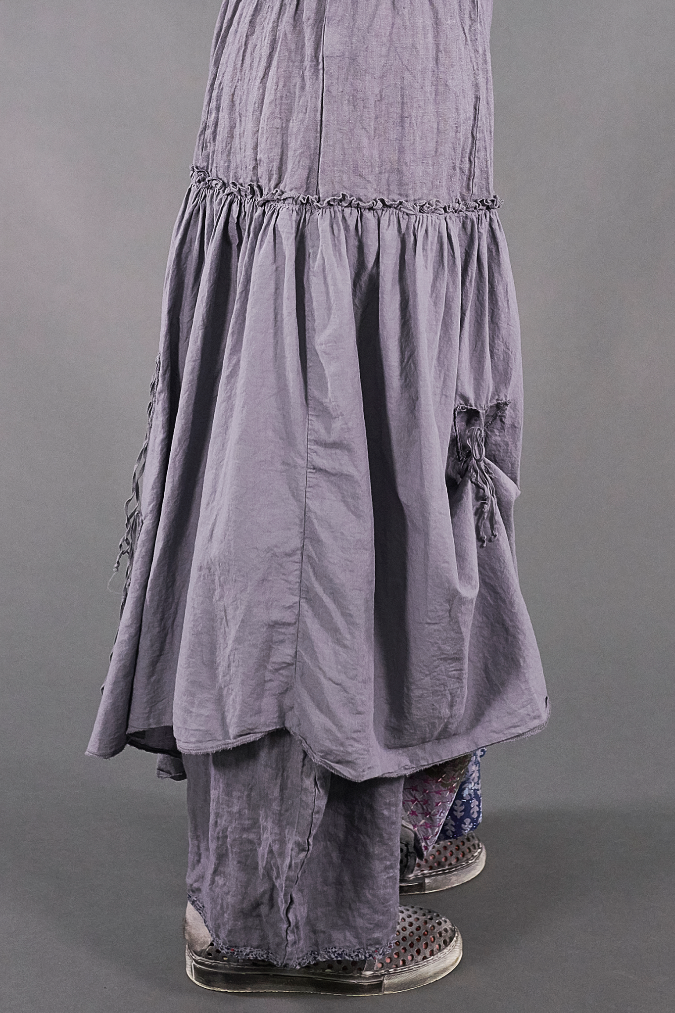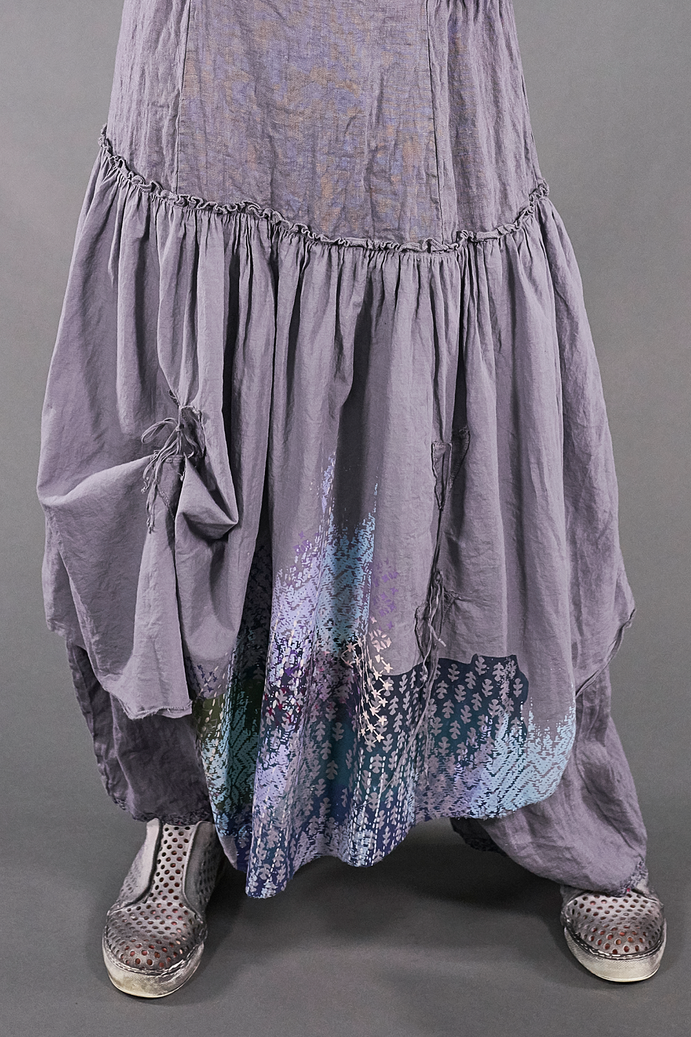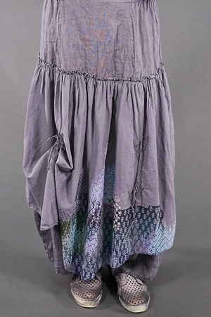 A vintage Blue Fish favorite, these incredible lagenlook bottoms feature a generous linen pant with an extra-long rise and the lightest weight cotton voile over-skirt attached at the hip. Two ties in front and two in back allow for the skirt to be left long and flowing, styled in romantic billows all around, or just in one spot to showcase your fabulously eclectic style.