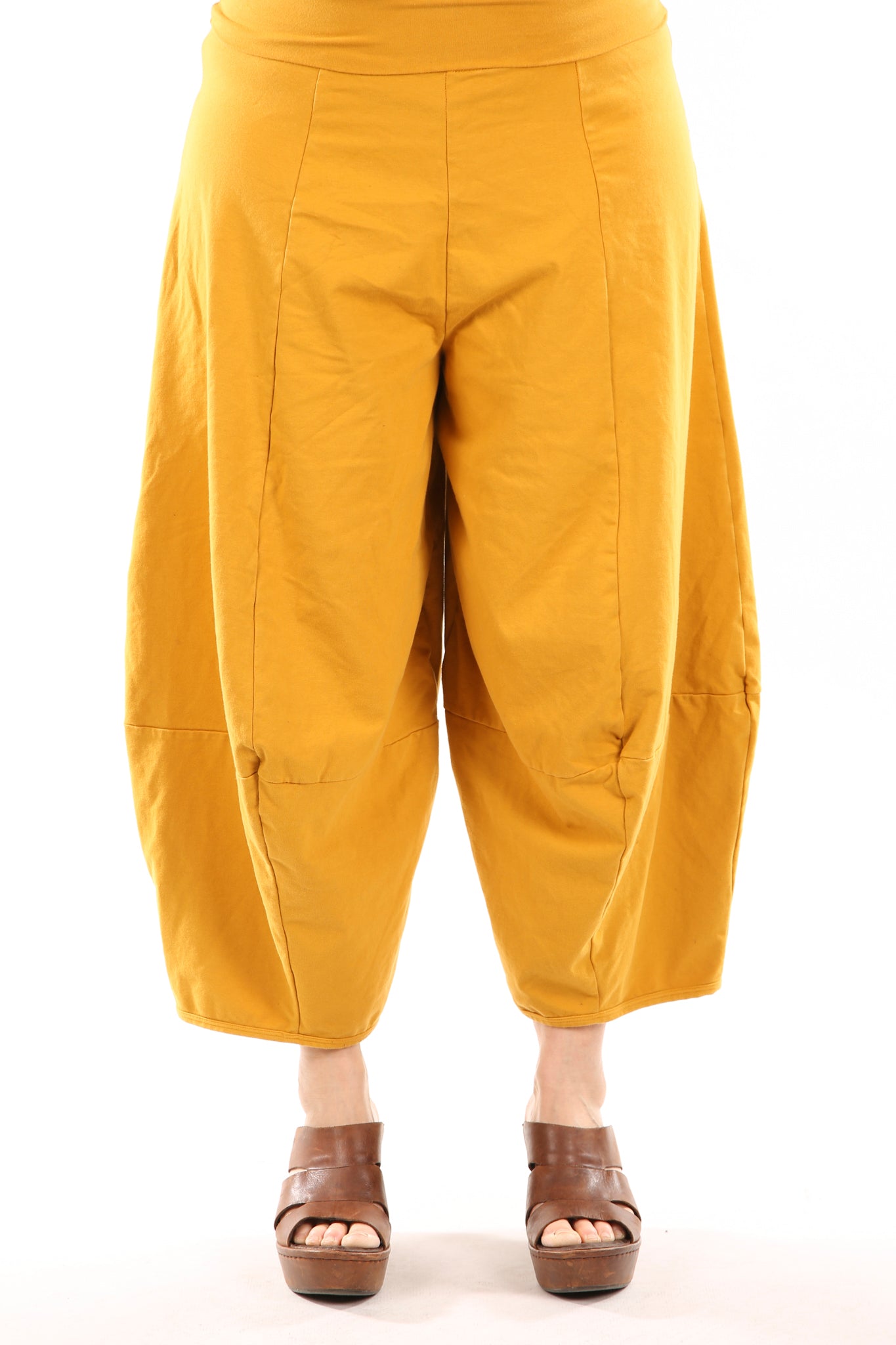 We've added even more dimension to this special edition favorite eclectic pant by creating more architectural shaping. This Blue Fish classic adds "fabulous" to any outfit. We've made these pants extra-comfy using heavy organic cotton lycra jersey. Waistband is a wide doubled band, so you can fold it to where it fits and feels best to you-it fits a variety of sizes and heights in pure comfort.