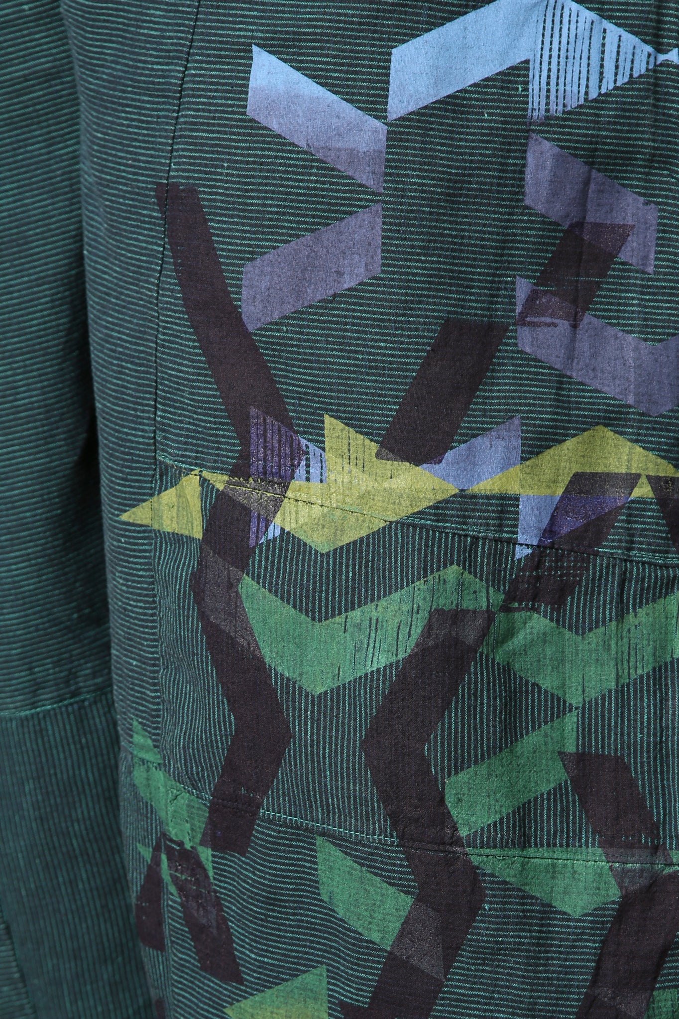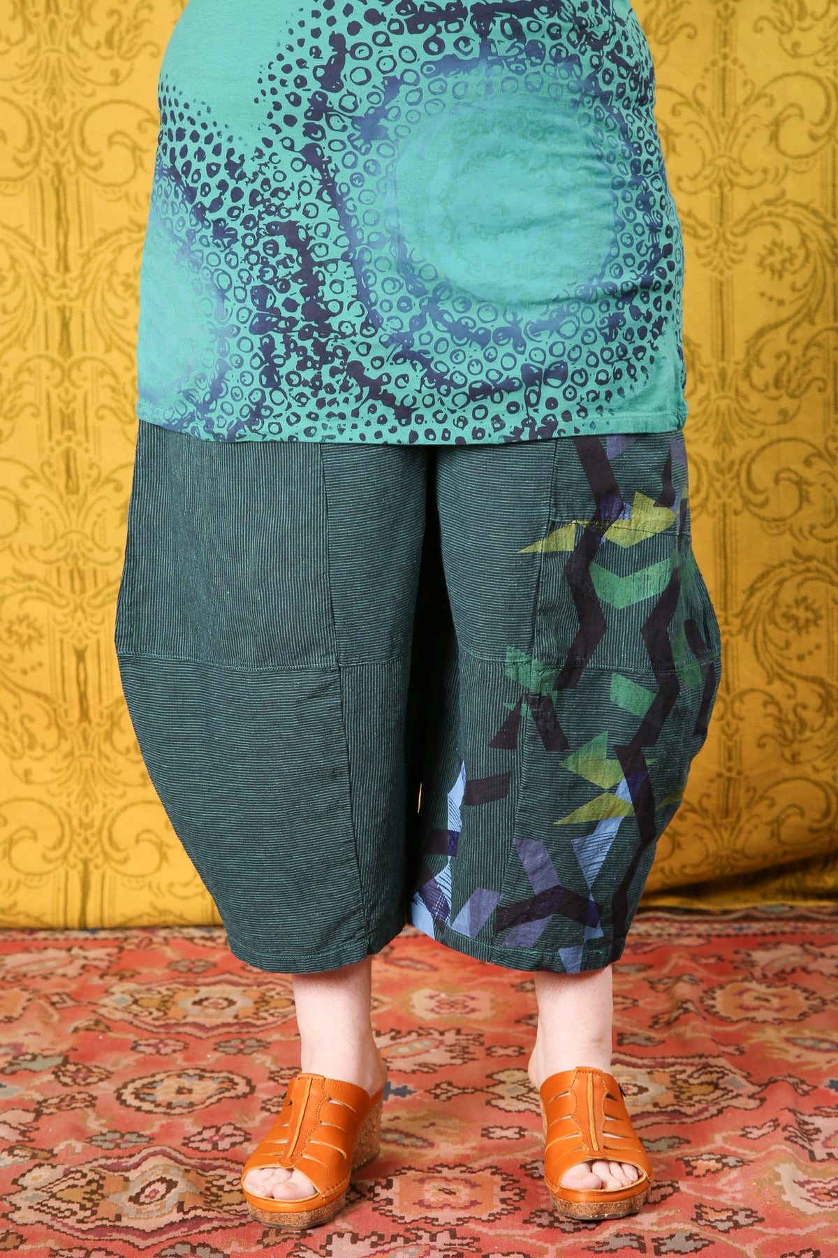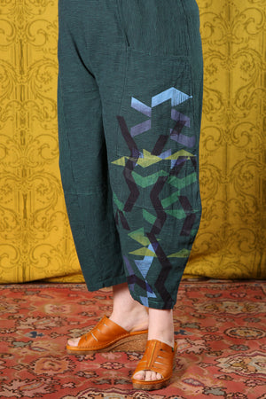 The woven indigo stripe, overdyed in our colors. An architectural full leg tapered at the hem, plus a graphic hand print create a fun boho look. A must-have! Our model is 5'9".