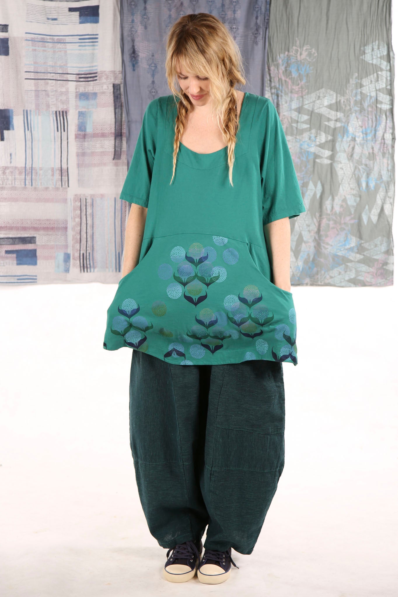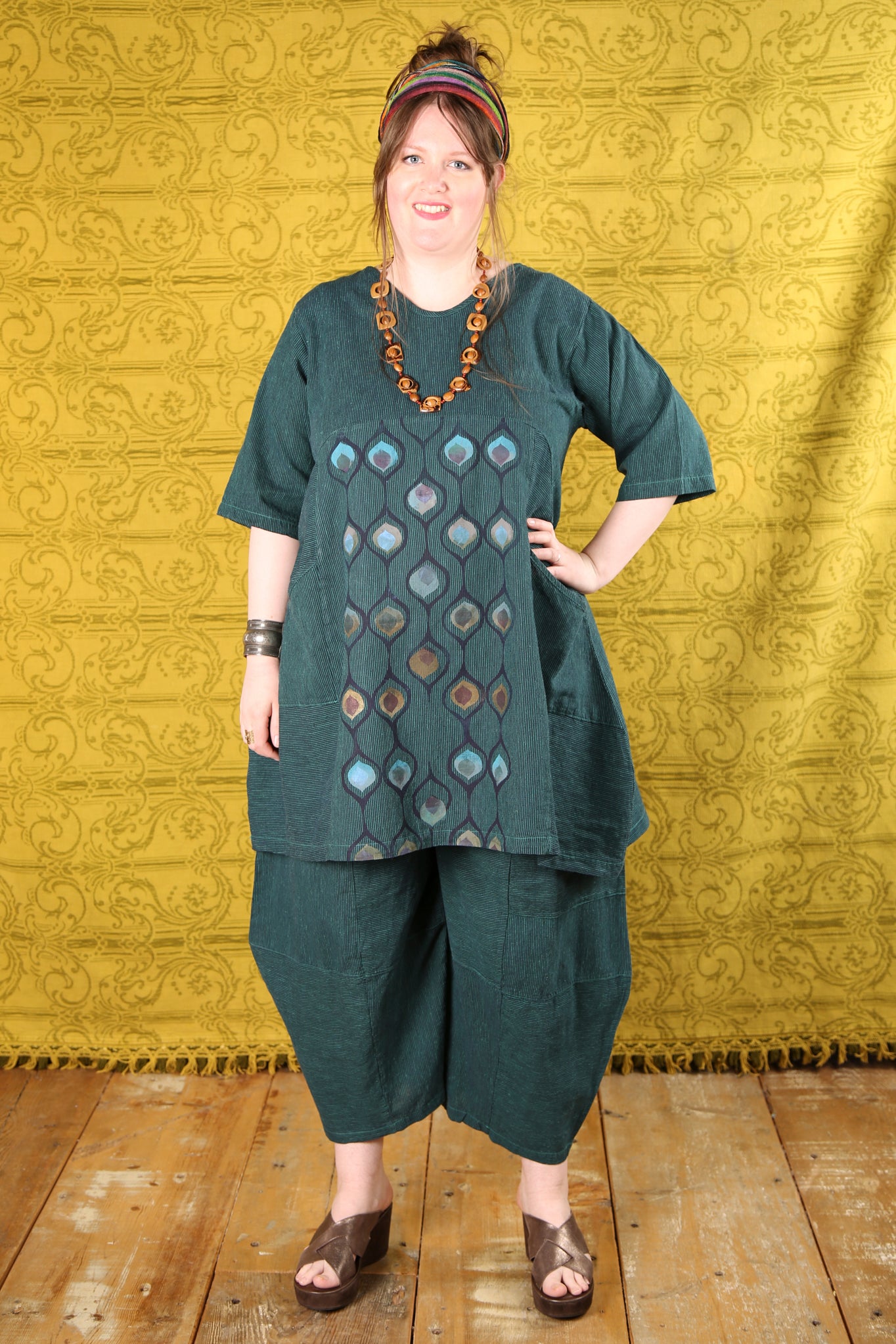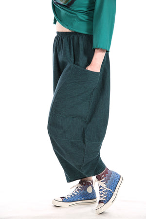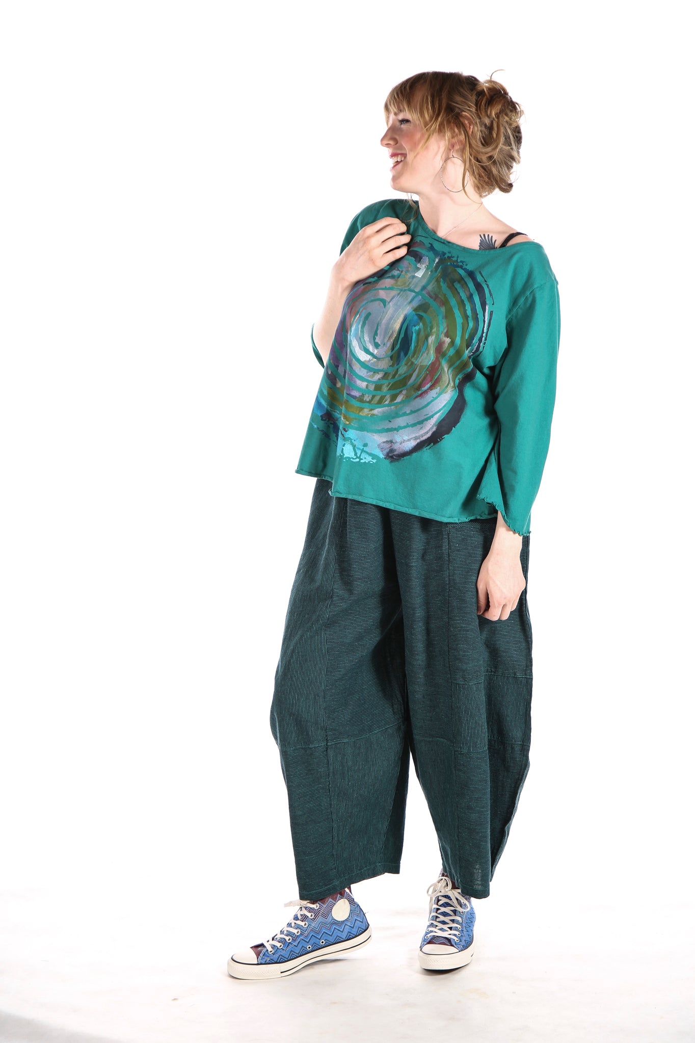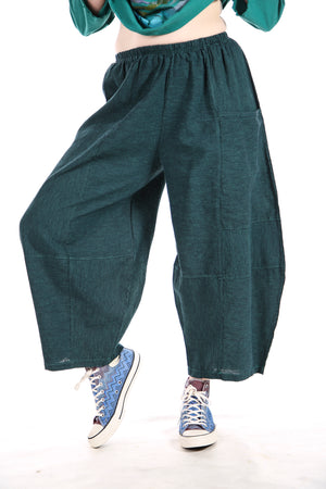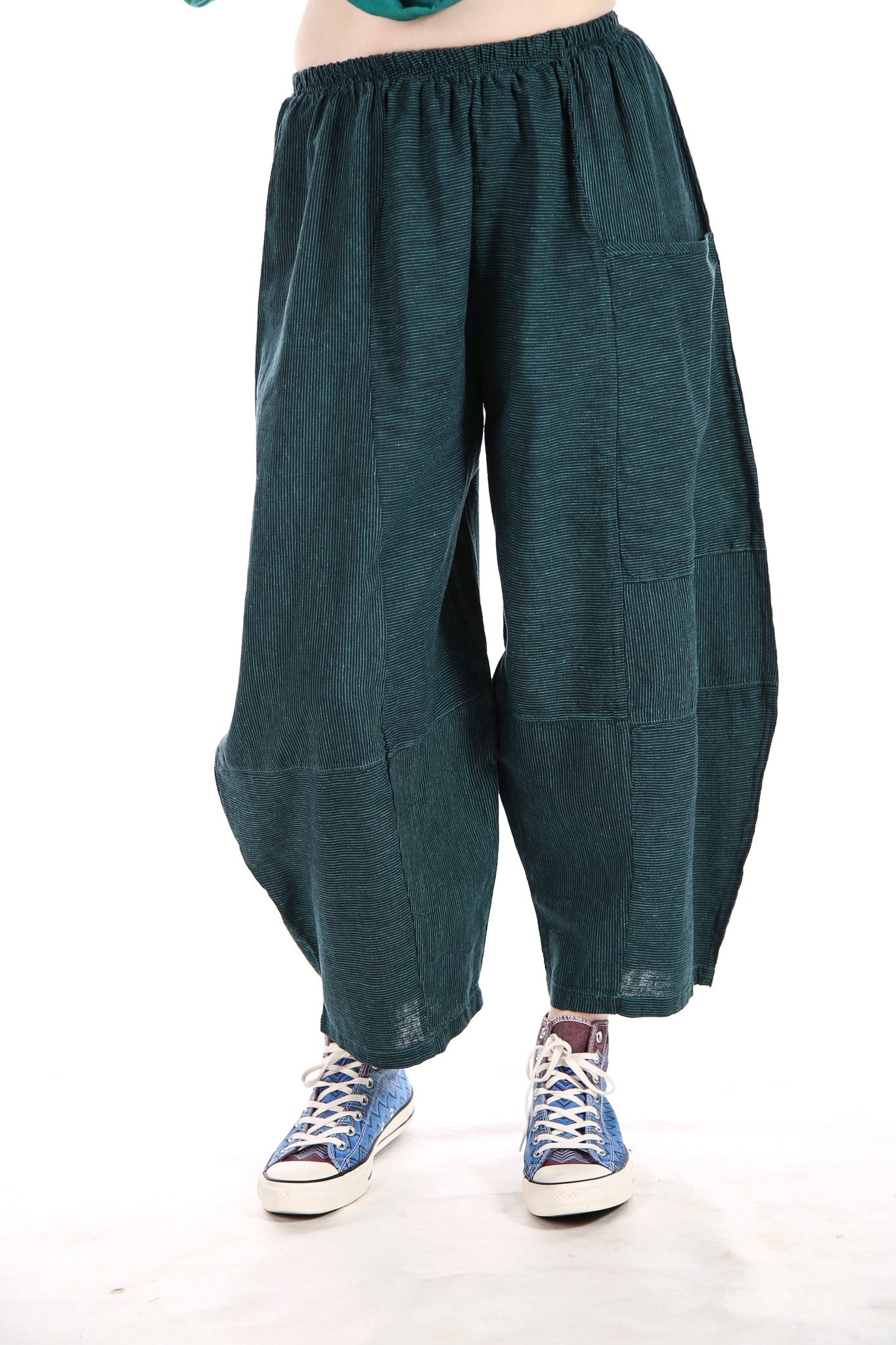 The woven indigo stripe, overdyed in our colors. An architectural full leg tapered at the hem. A must-have! Our model is 5'9".