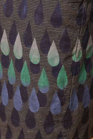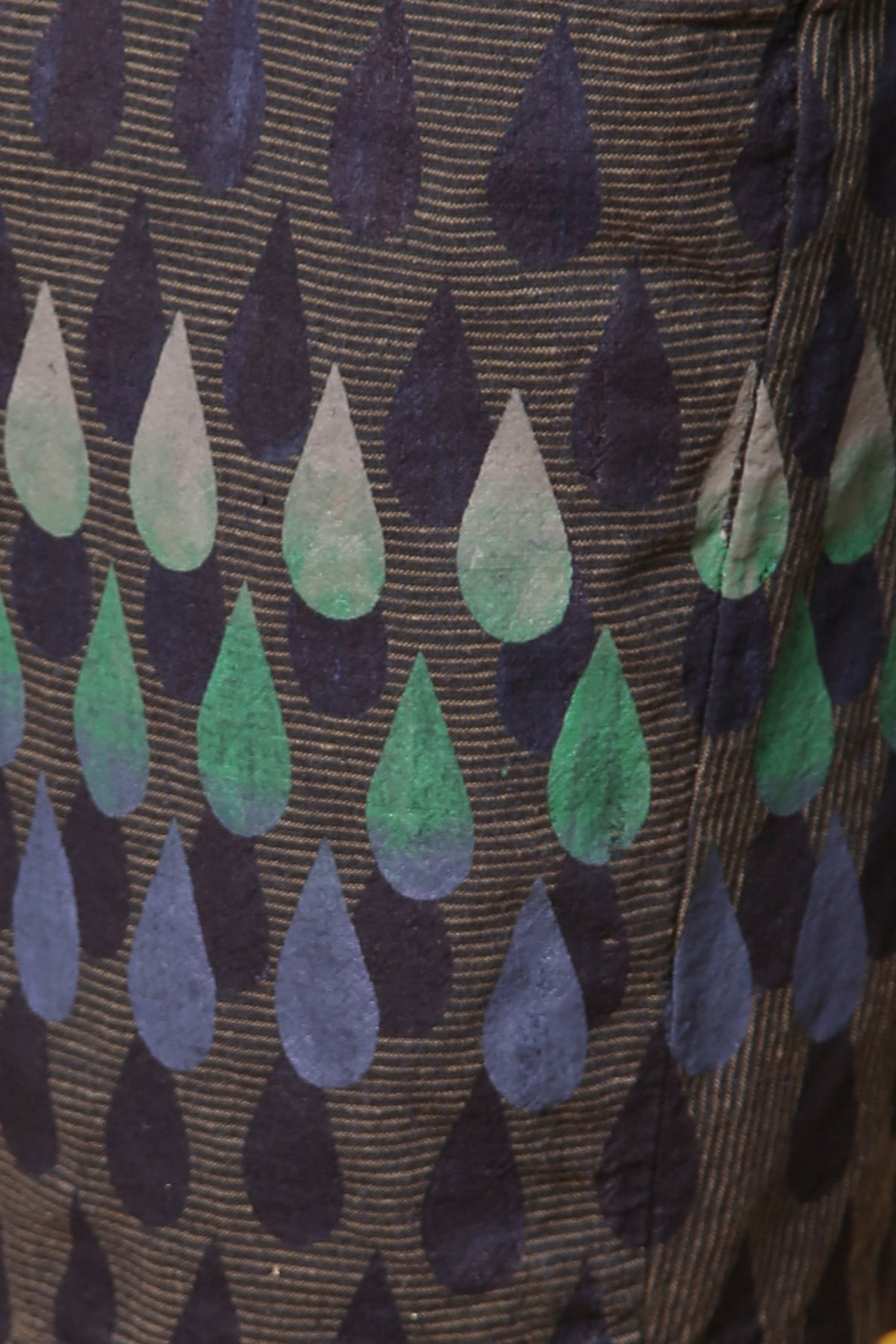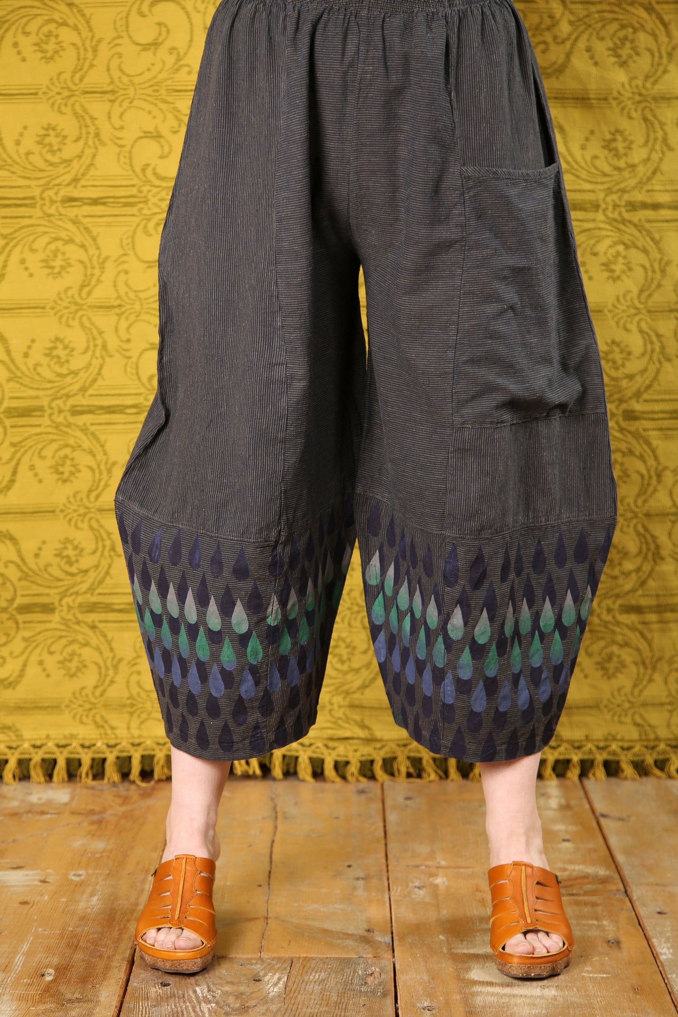 The woven indigo stripe, overdyed in our colors. An architectural full leg tapered at the hem, plus a graphic hand print create a fun boho look. A must-have! Our model is 5'9".
