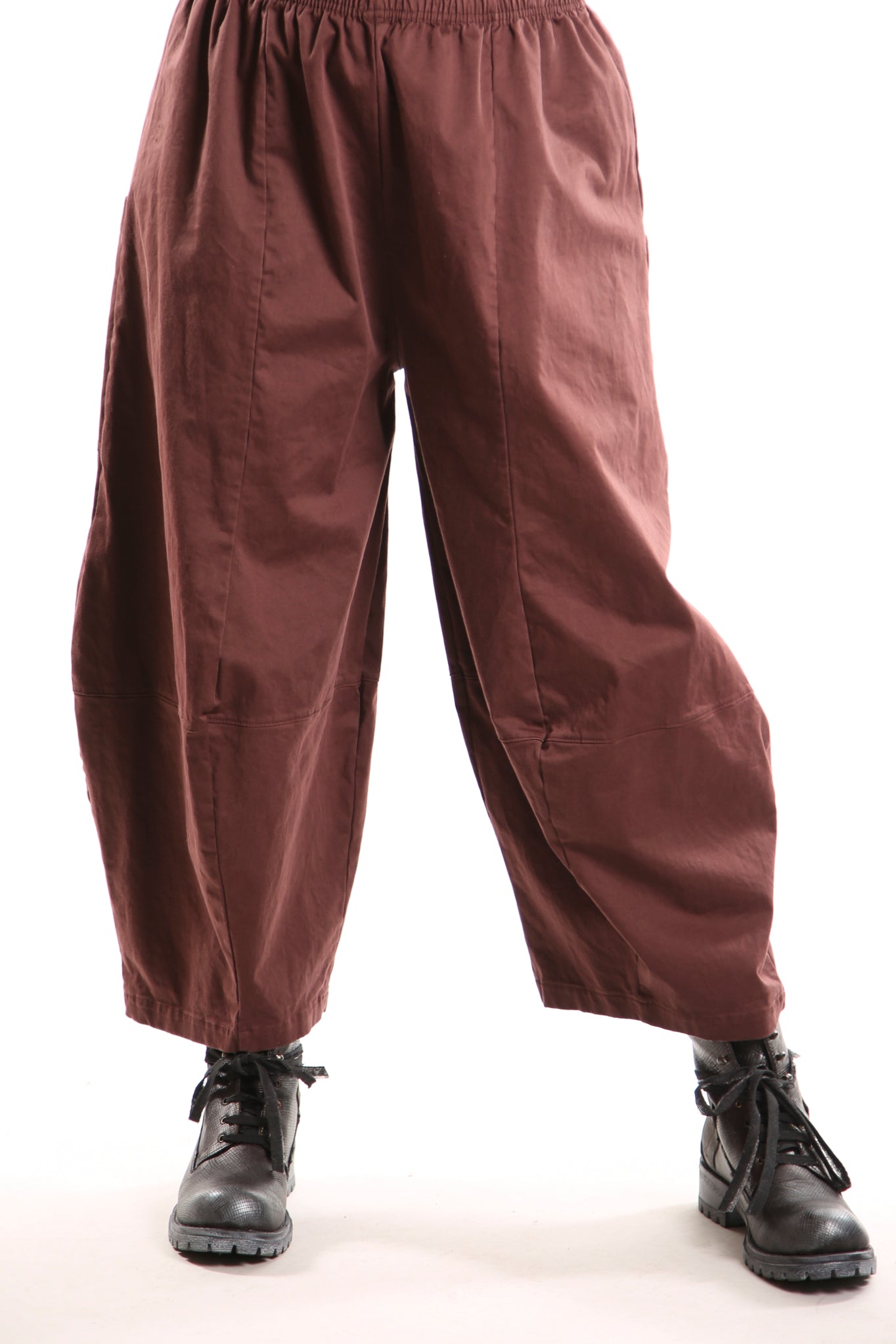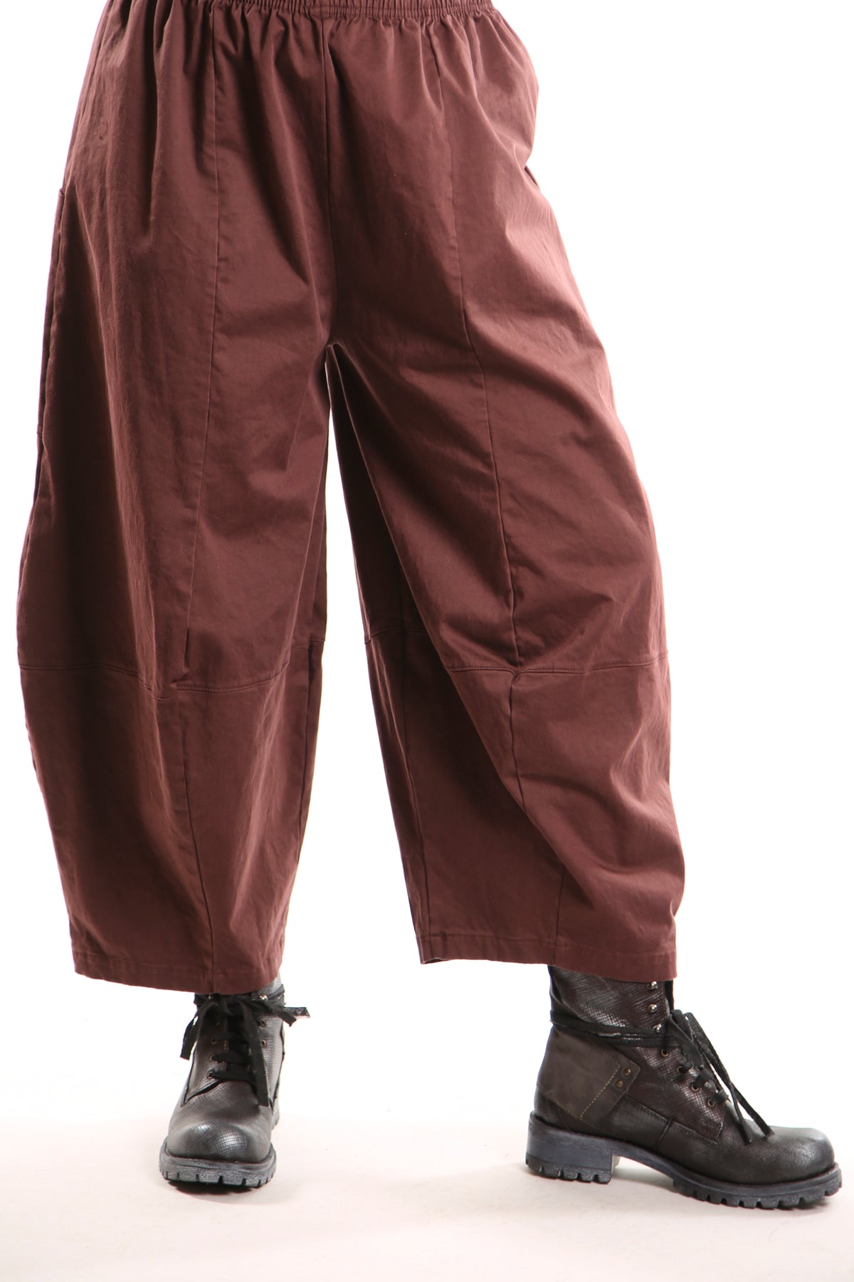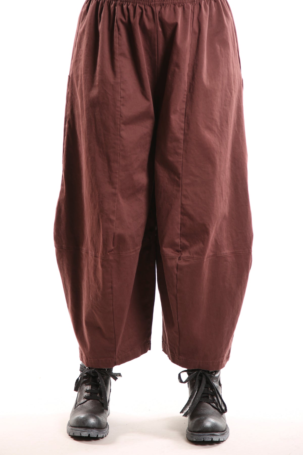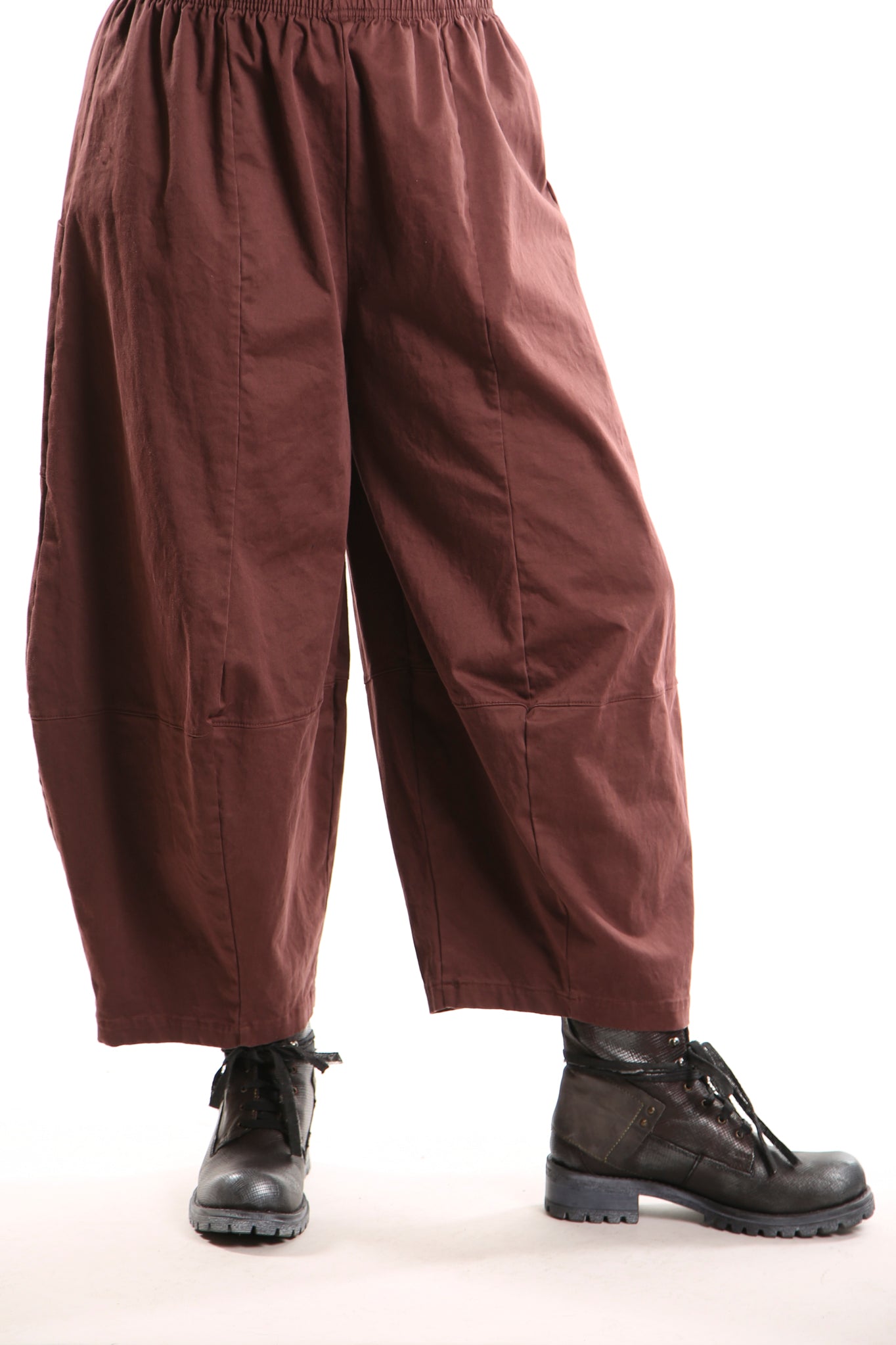 Simple or dramatic heavy woven pant with pockets, wide legs, elastic waist.