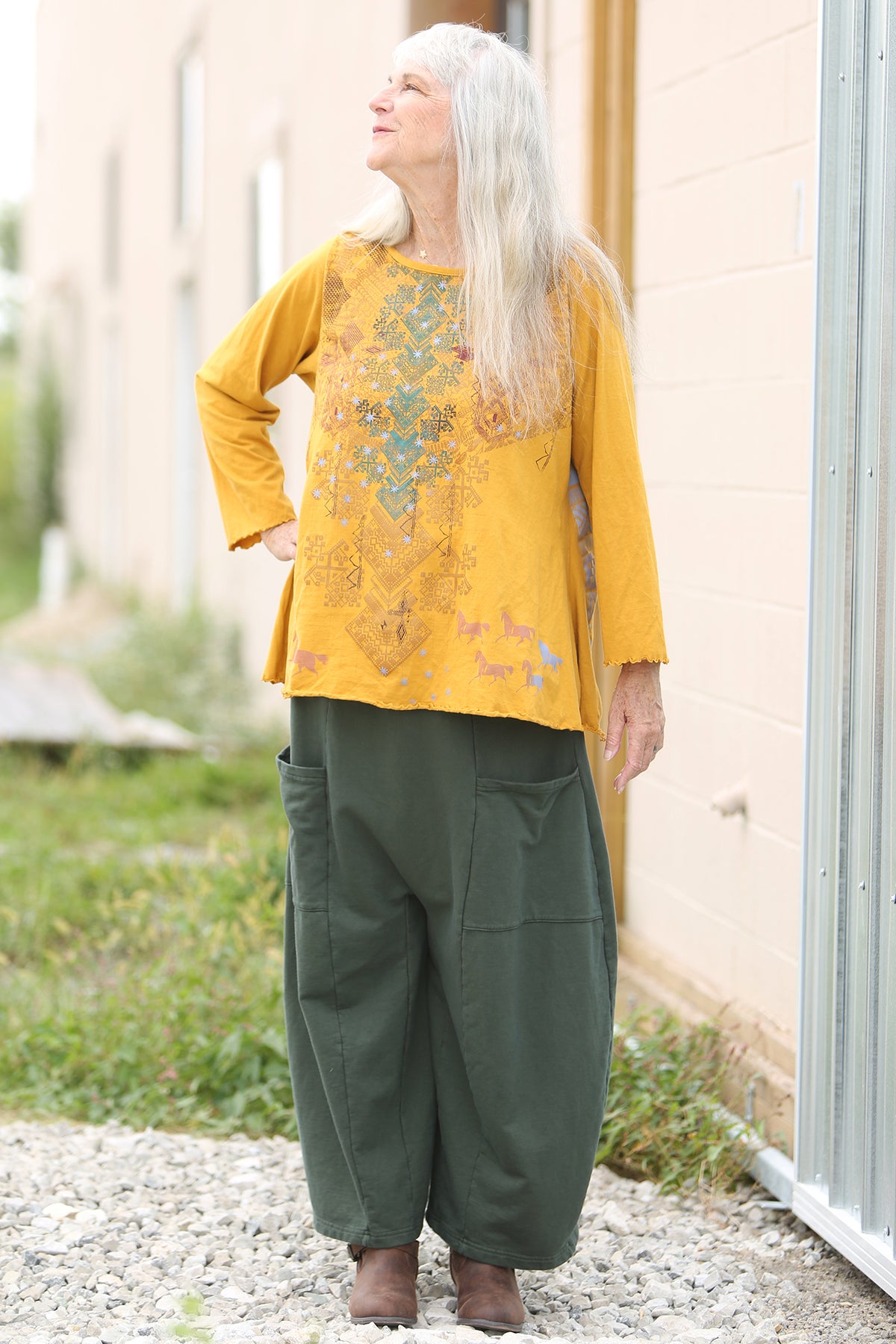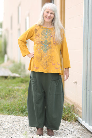 Simple or dramatic heavy woven pant with pockets, wide legs, elastic waist.