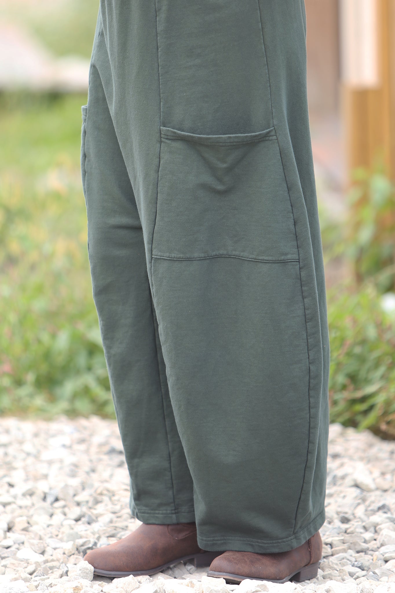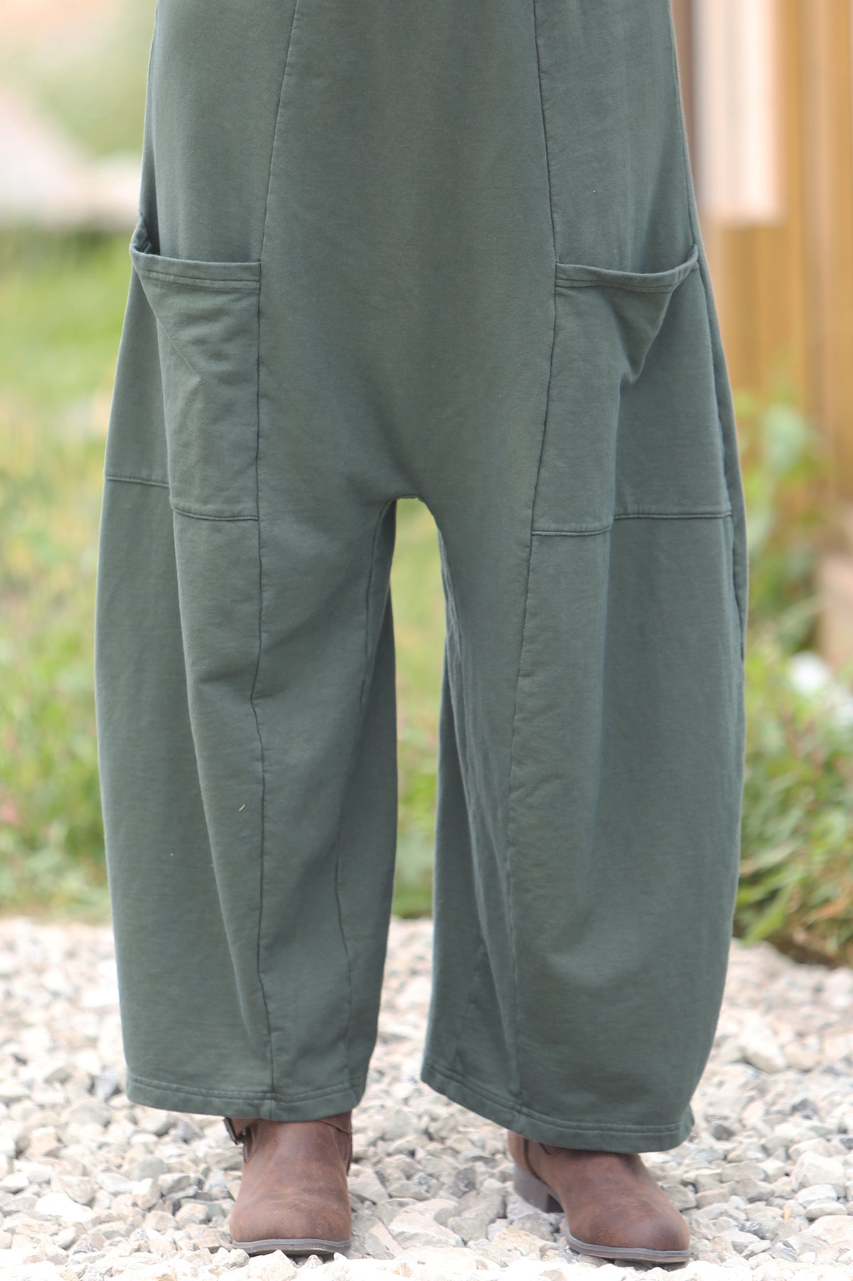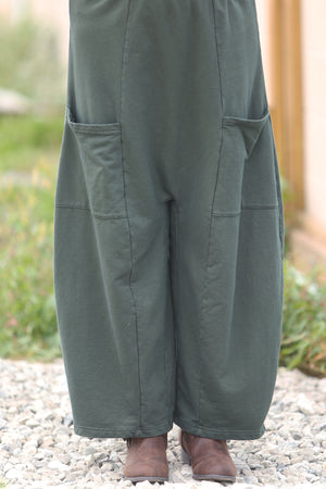 - Featuring a full-length wide leg in heavy cotton with oversized pockets.