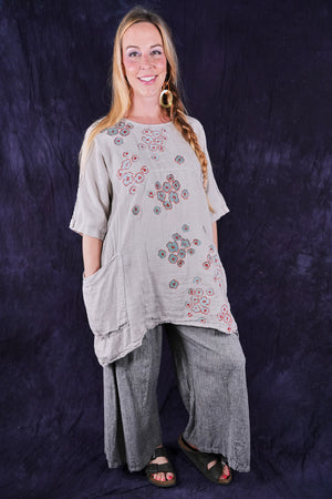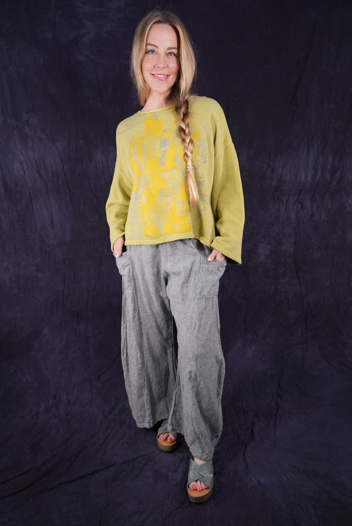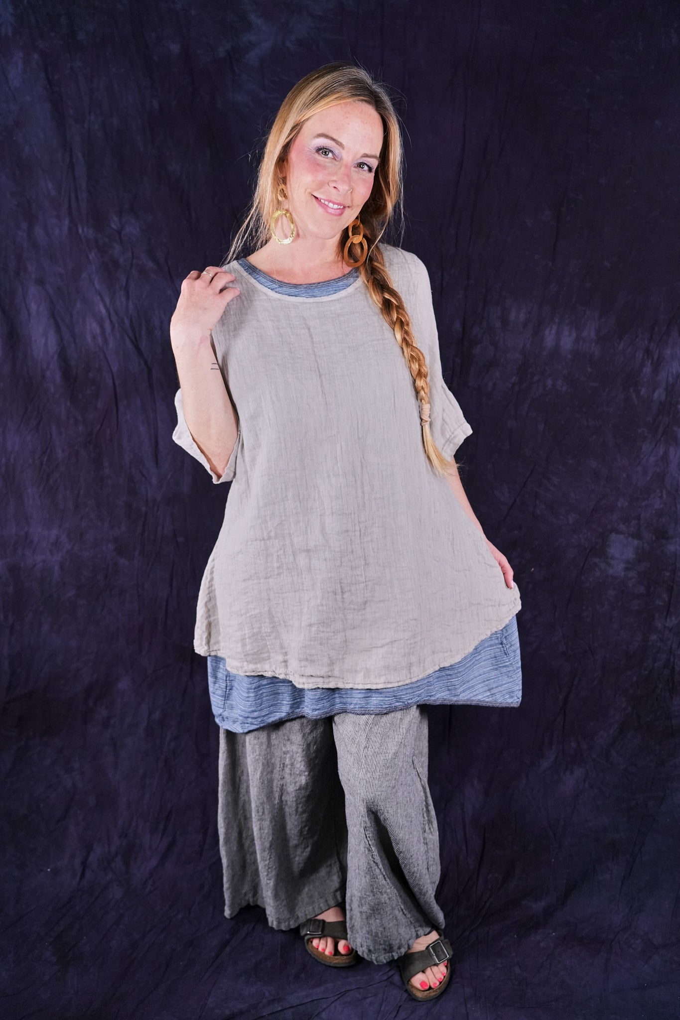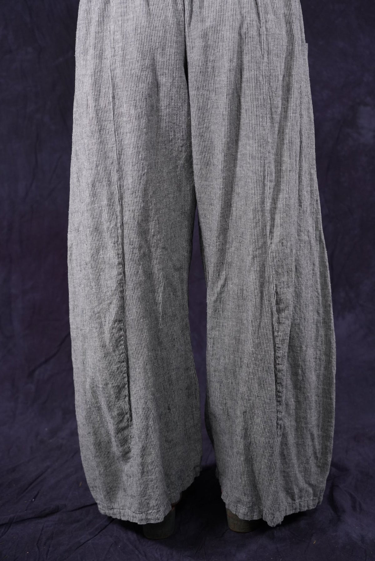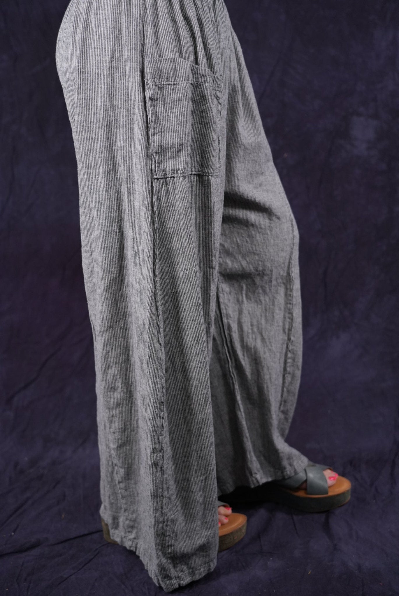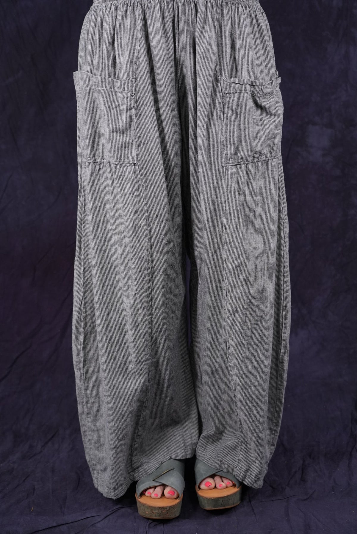 Striped hemp/cotton woven cotton Klee pant, soft and light -feels like linen. These pants look great with everything and have 2 excellent pockets and a wider elastic waistband that can be turned once to adjust length. They can go with tunics, tops and under dresses. Hemp is a highly sustainable fabric.