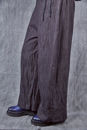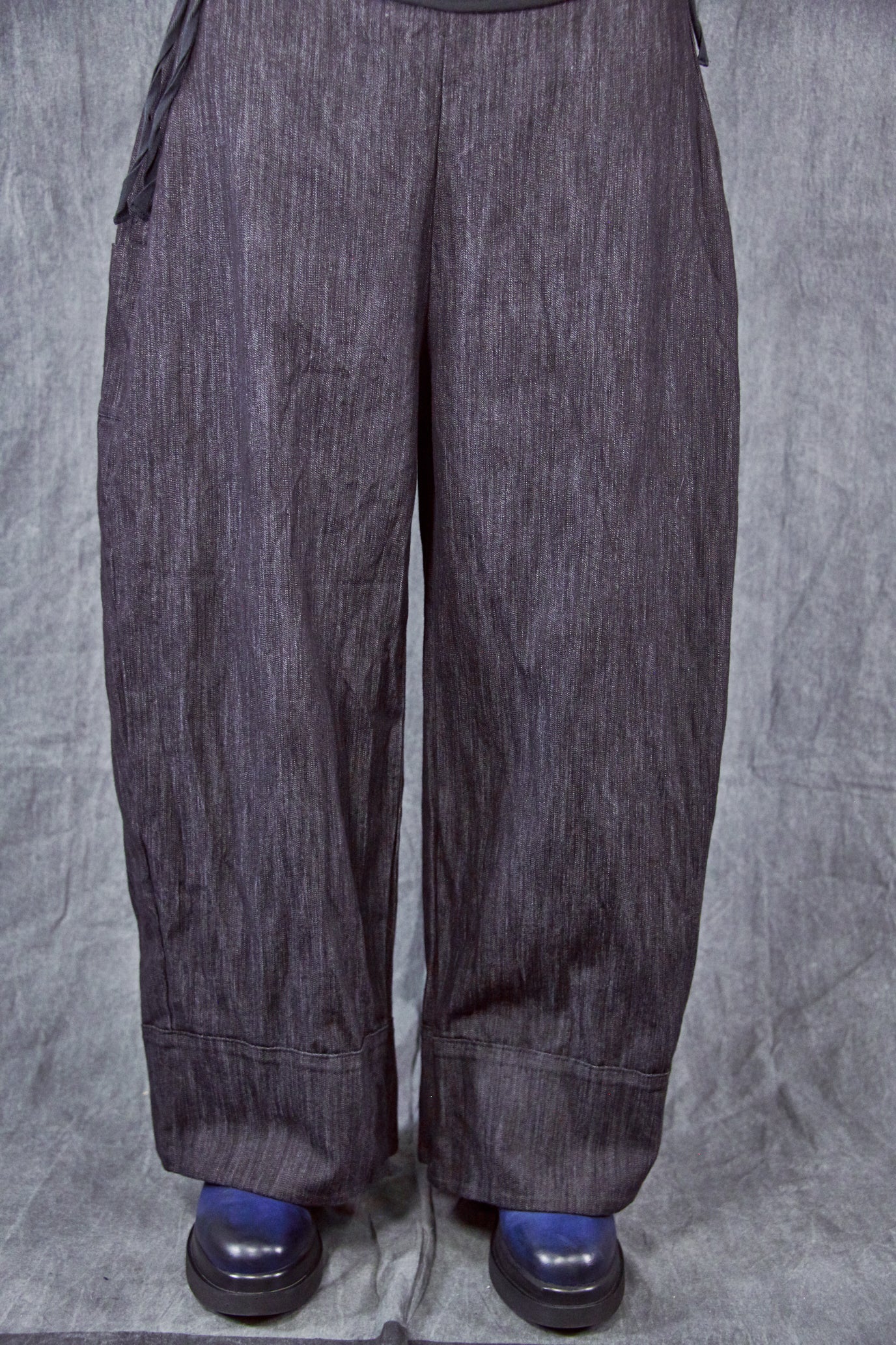 Wide black denim pant with left side pocket and leg with 5” doubled cuff. Beautiful woven fabric holds the structure but remains soft to wear. Easy to pair with any of our big tees or tunics.