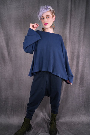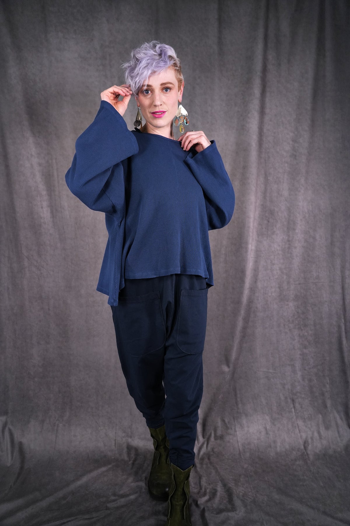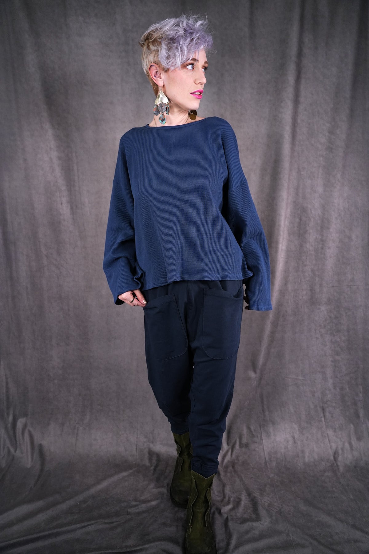 Made from our Heavy weight 92% organic cotton substantial weight fine french terry with the easy stretch of 8% lycra. This fun modern style features a conformable/ foldable stretch waistband which allows for ease of length and fit adjustment, 2 front patch pockets and dropped rise. Darts at the knee were added for shaping. Hem cuff detail. Roll to raw trim at the top of each 3 inch pant leg cuff. Wear straight legged or pull up top to allow for a calf length style variation. Super versatile pant that you’ll want to wear all season long and beyond!