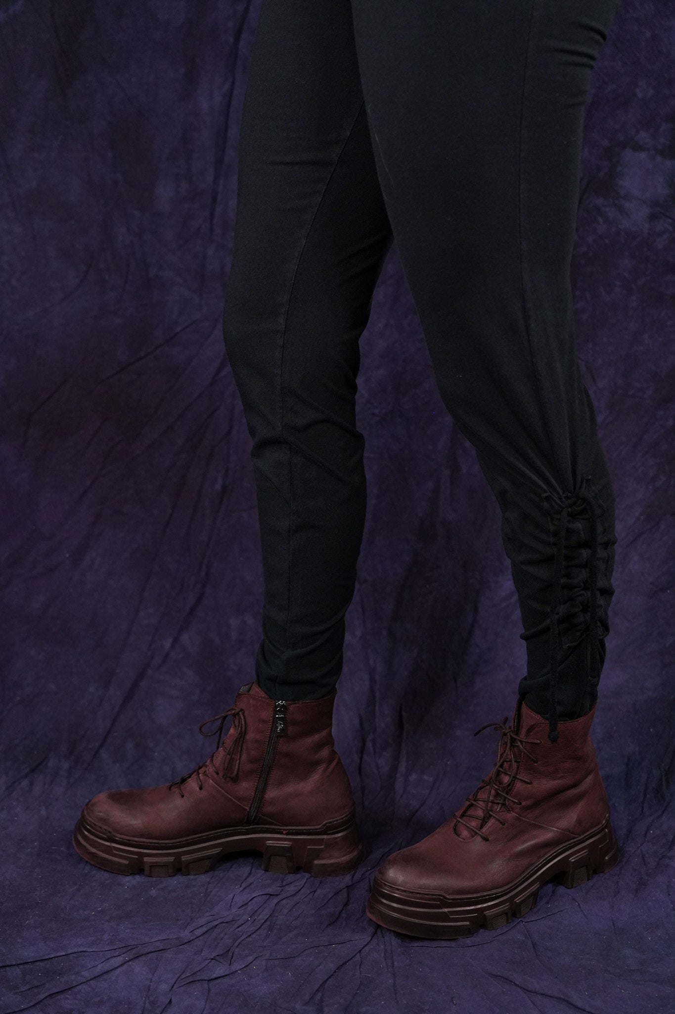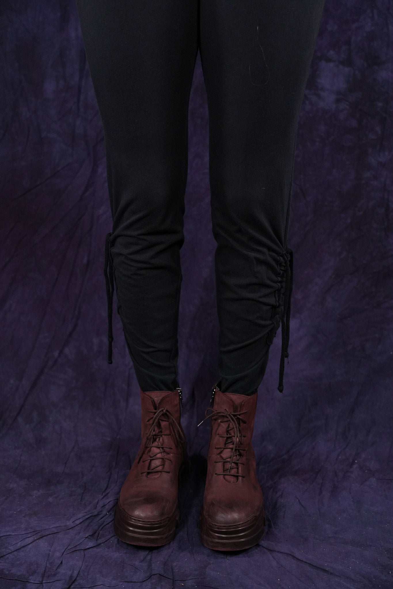 Regular full length, stretch organic cotton lycra legging with 8-inch drawstring detail on the outside of the leg.