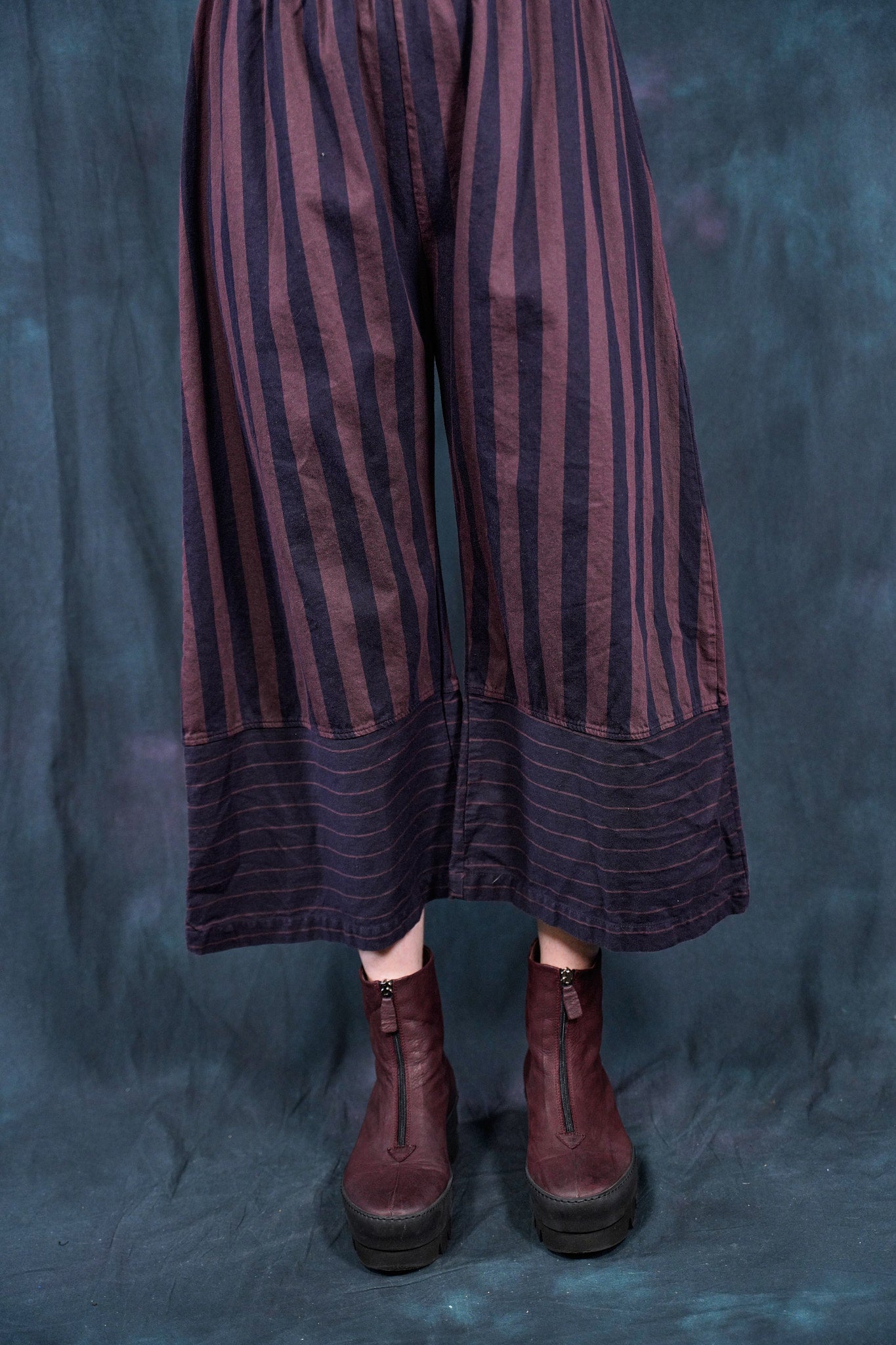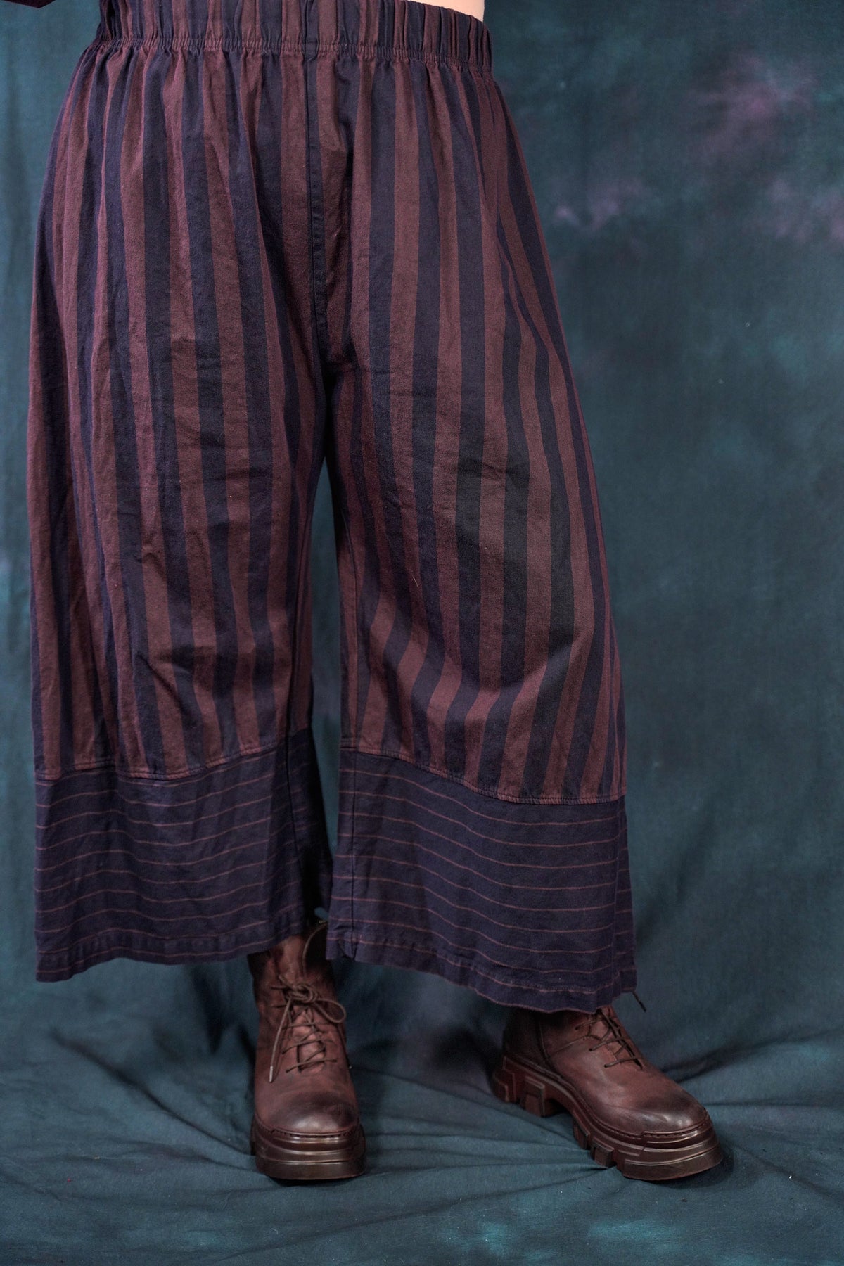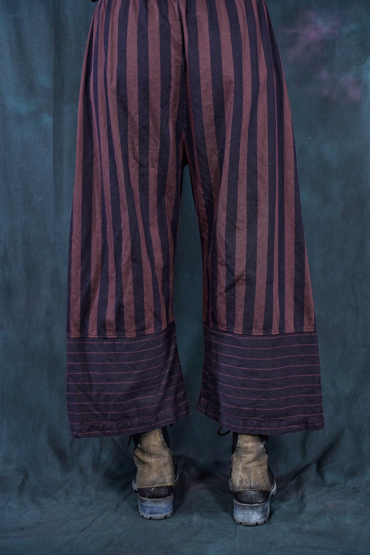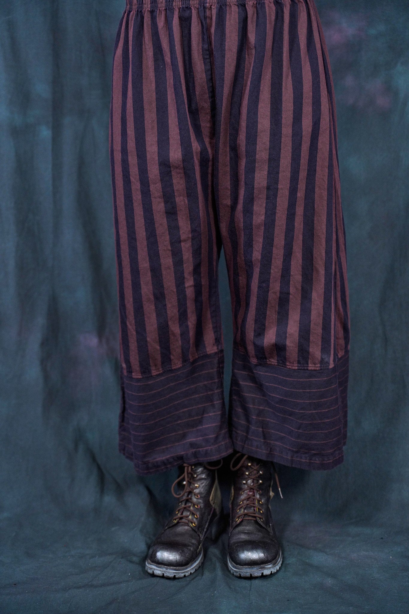 There is a comfortable elastic waistband on these cotton denim over-dyed stripe pants. Once you put them on you will not want to take them off. They are super cool and fun to wear, without being too colorful.