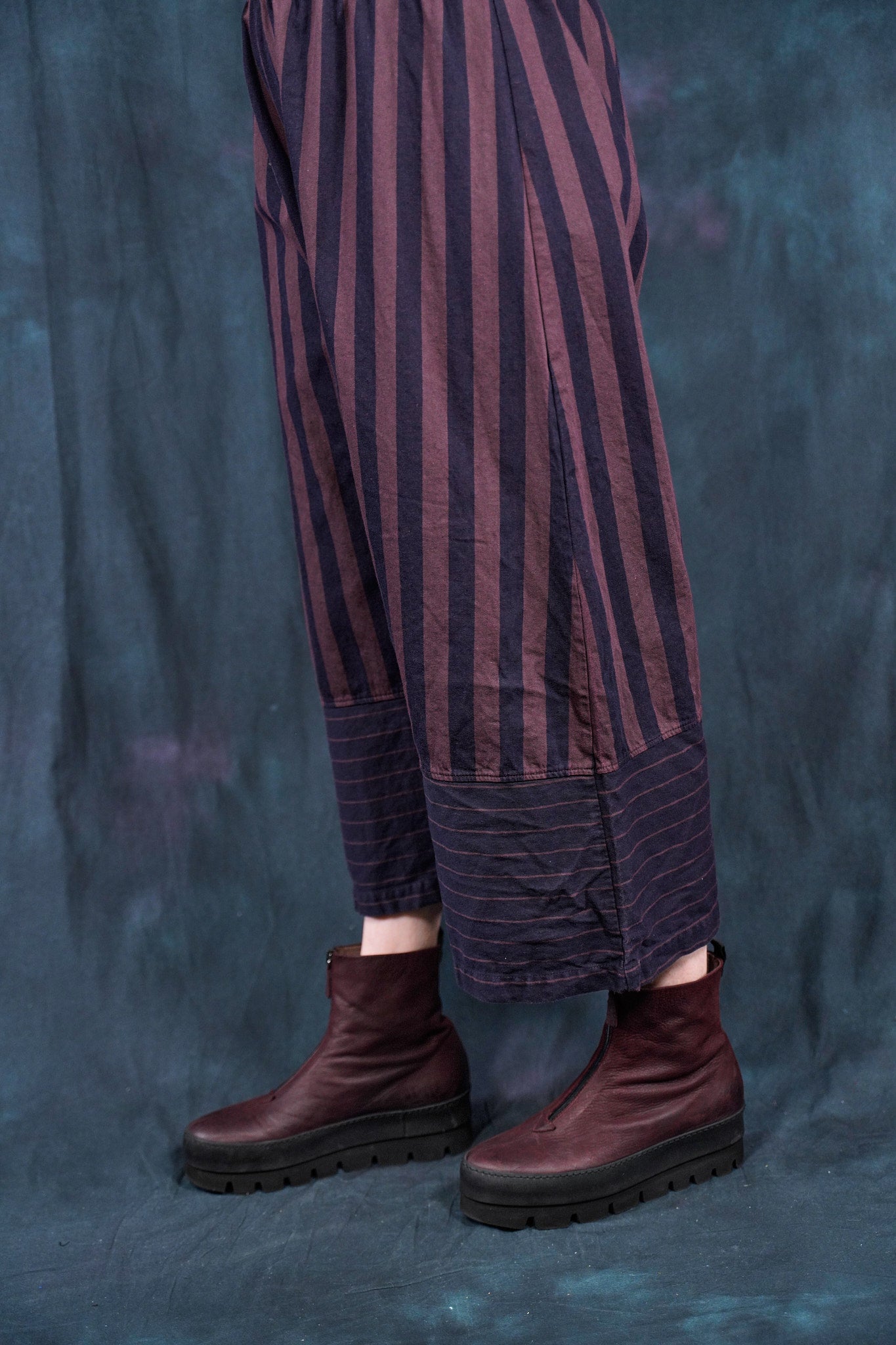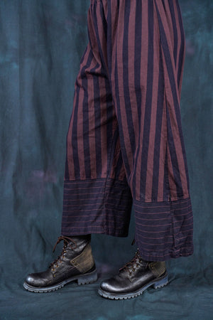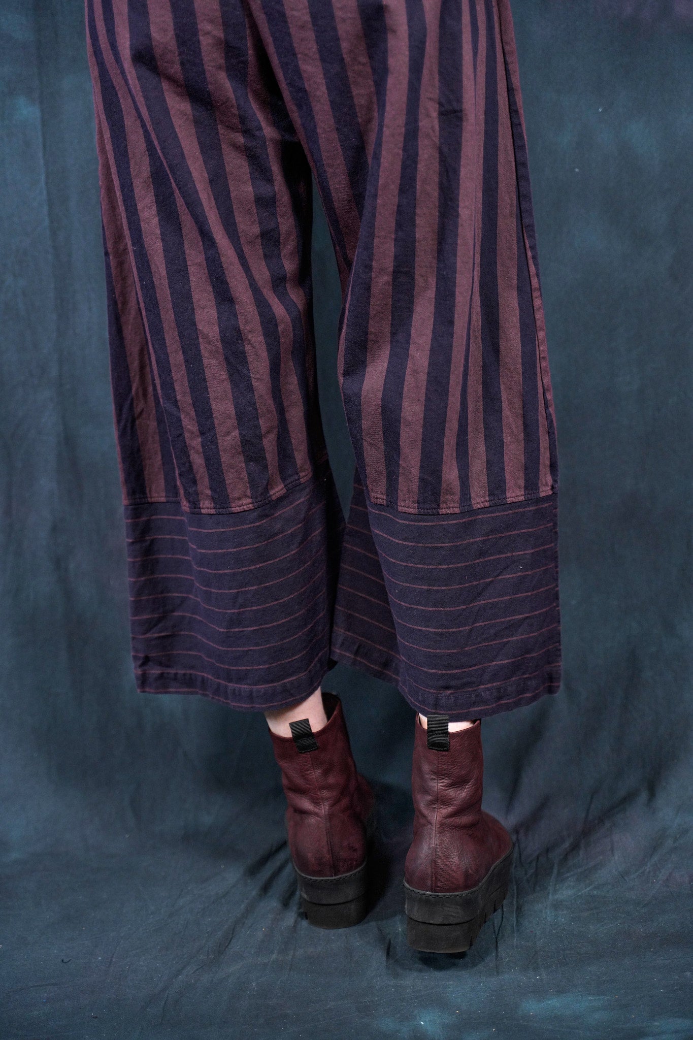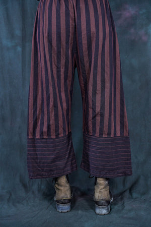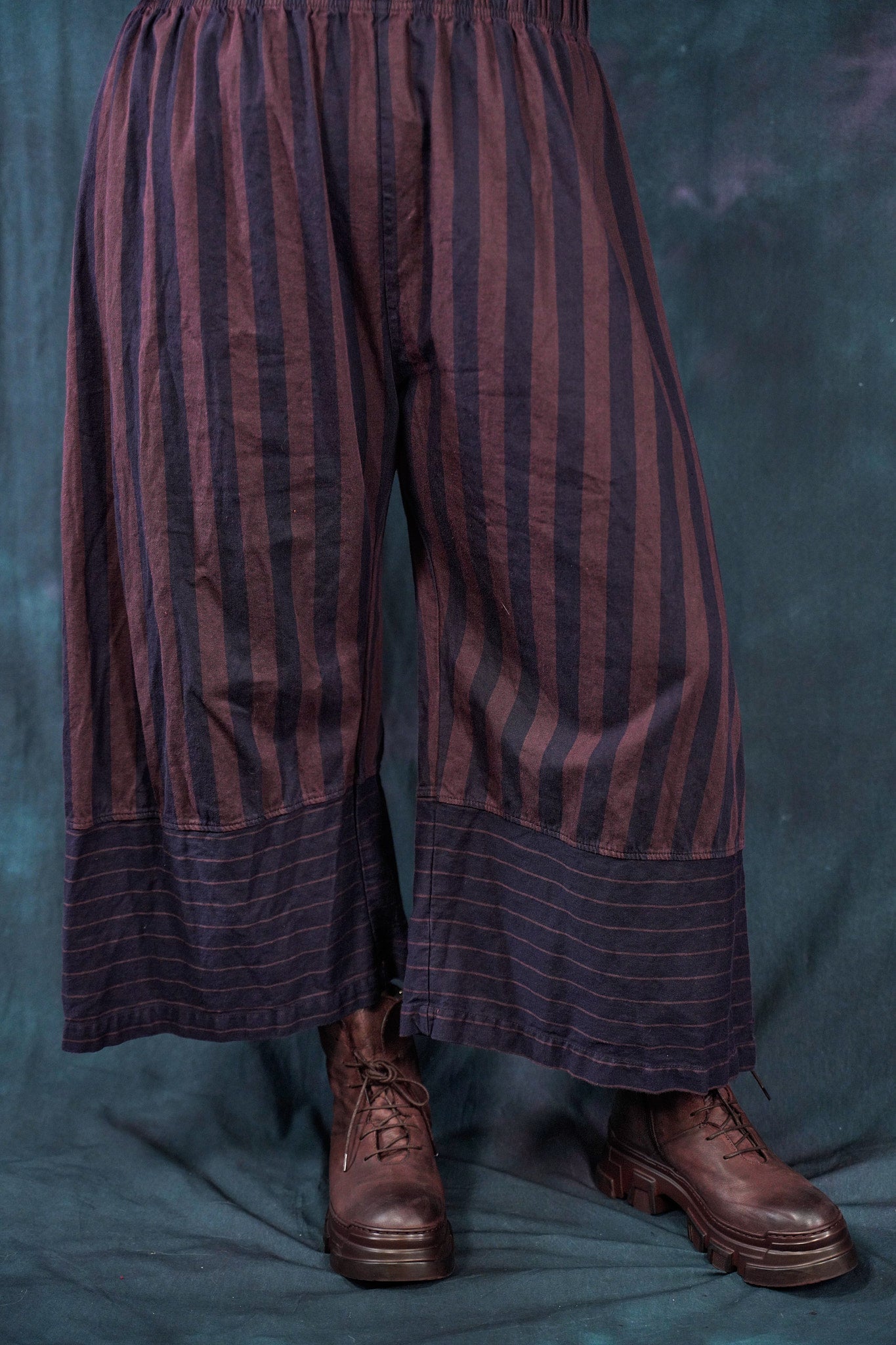 There is a comfortable elastic waistband on these cotton denim over-dyed stripe pants. Once you put them on you will not want to take them off. They are super cool and fun to wear, without being too colorful.