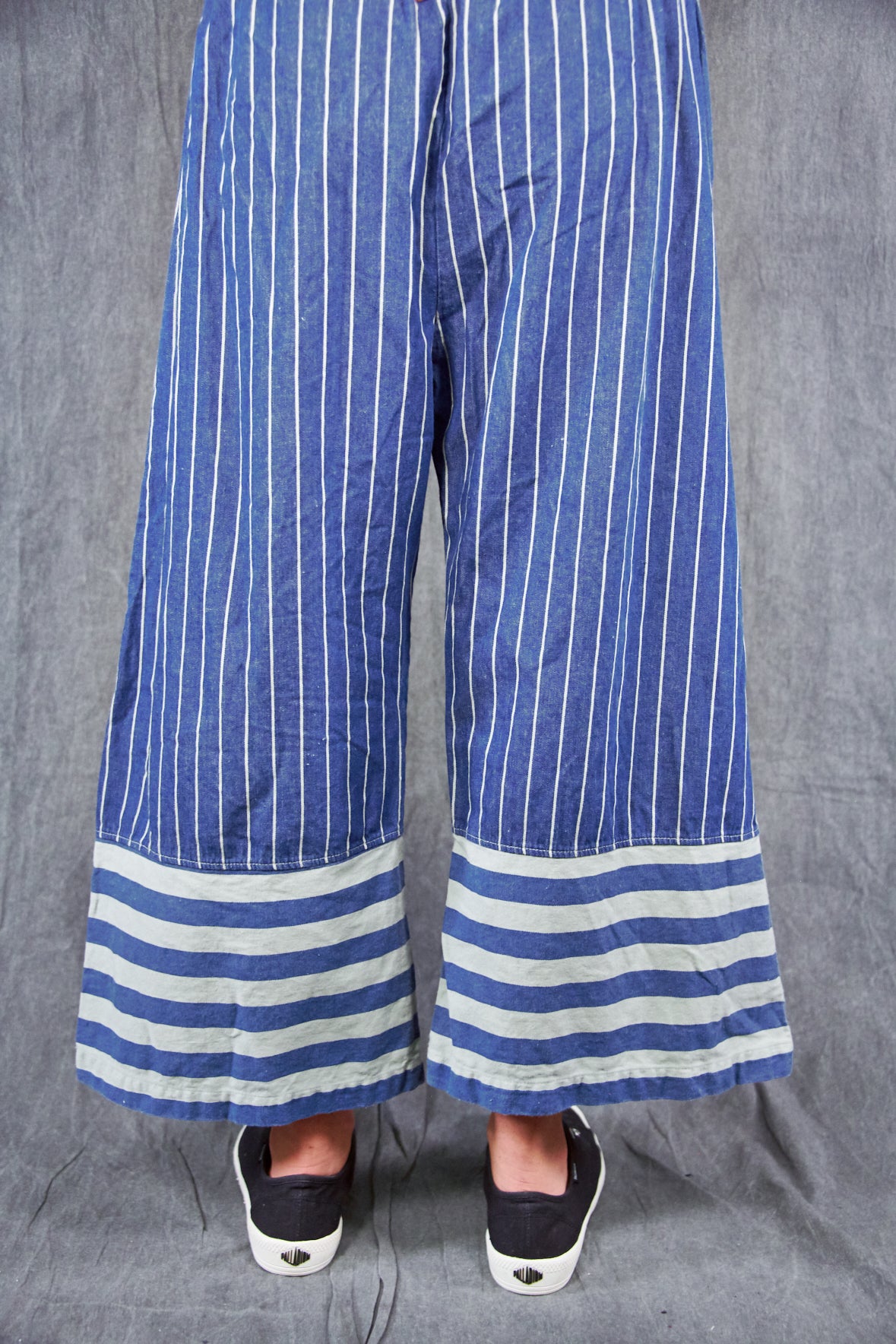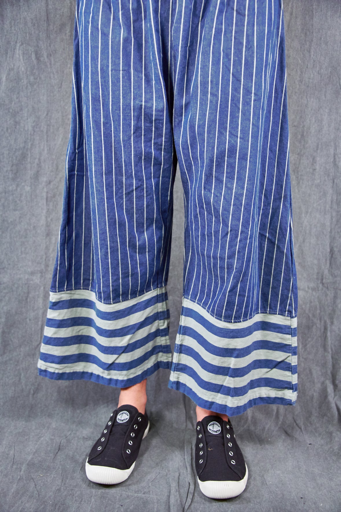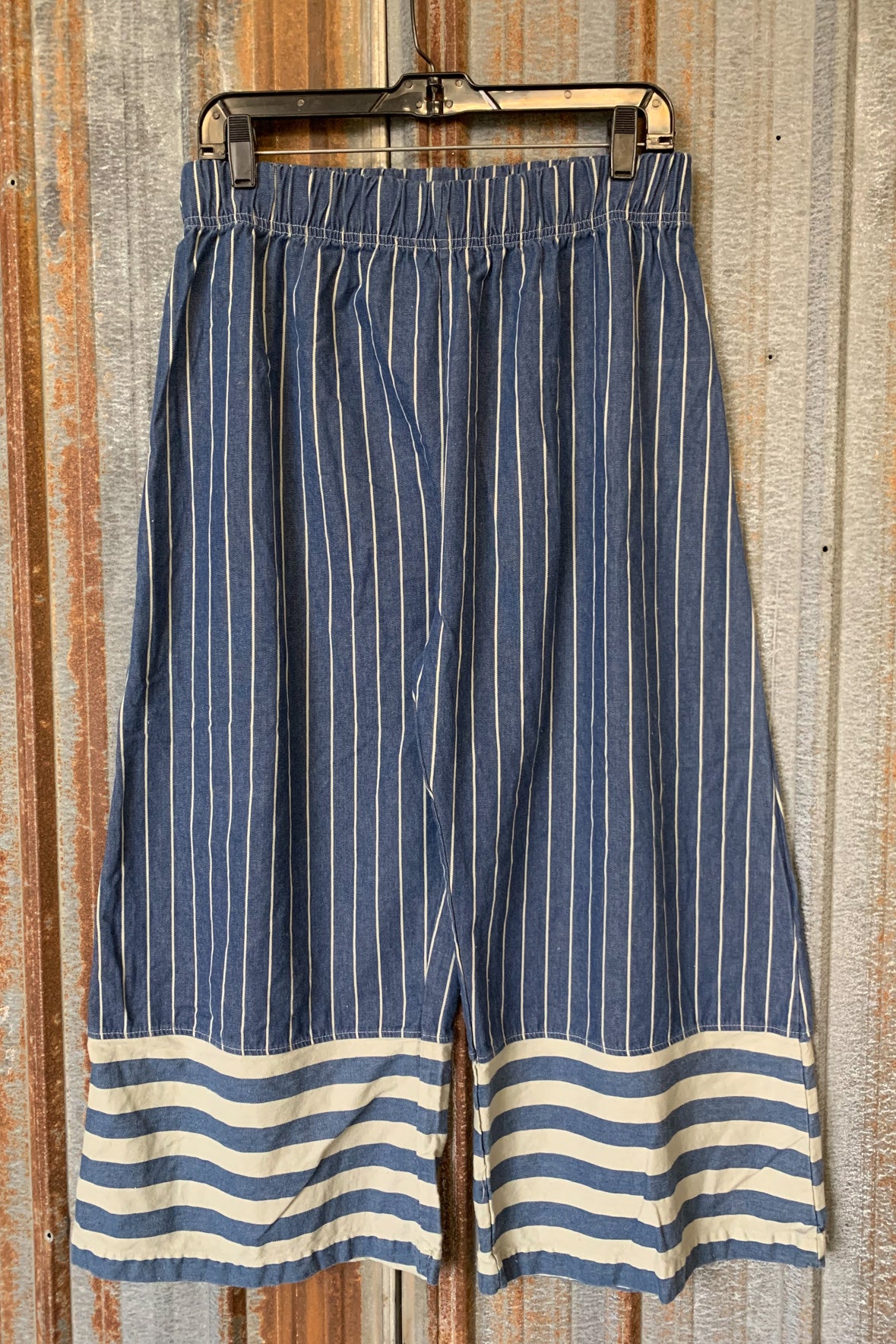 Denim and stripe wide legged pant. The light stripes are a subtle green grey, 'Laurel'- This subtle color shows best in the photos shown on model.