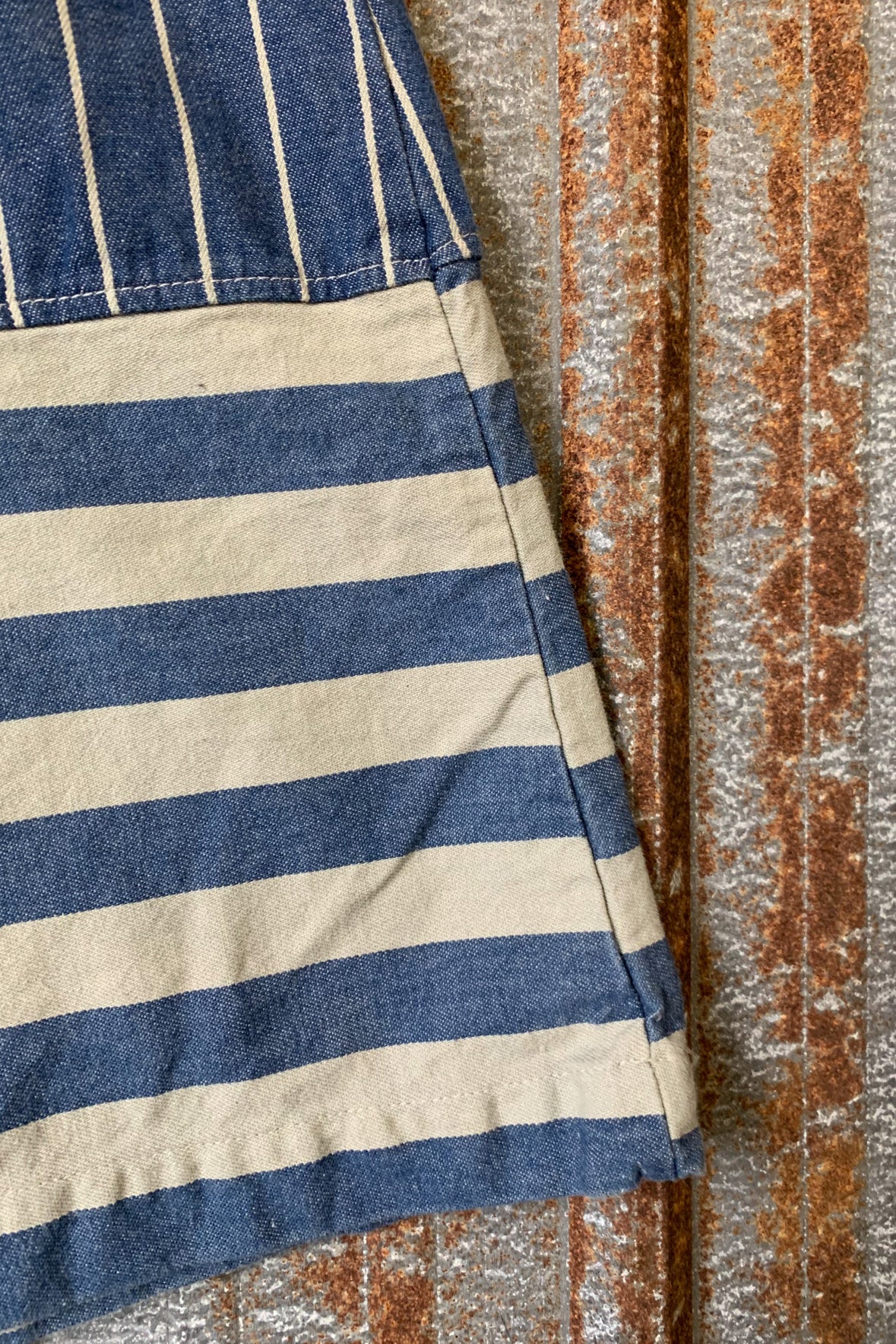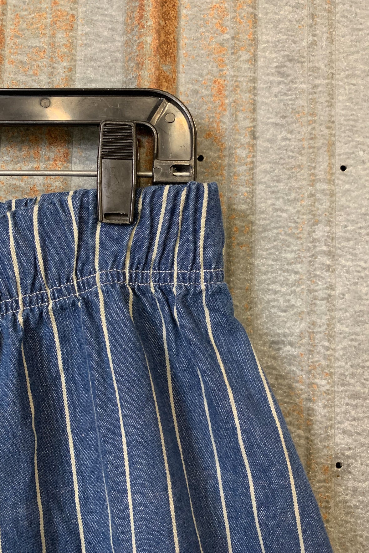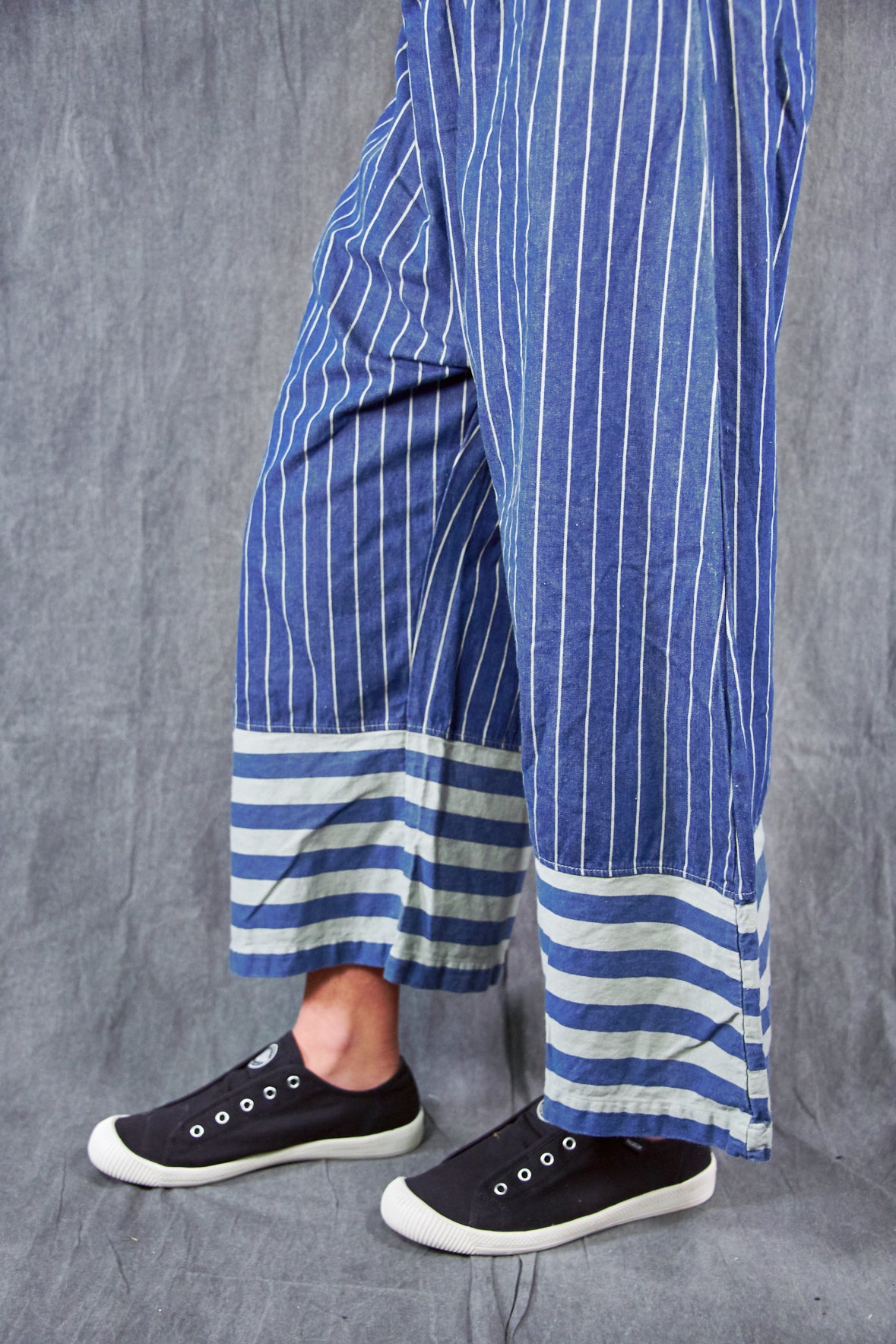 Denim and stripe wide legged pant. The light stripes are a subtle green grey, 'Laurel'- This subtle color shows best in the photos shown on model.