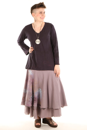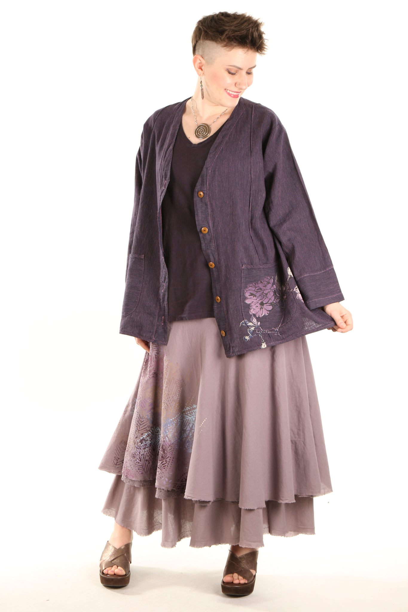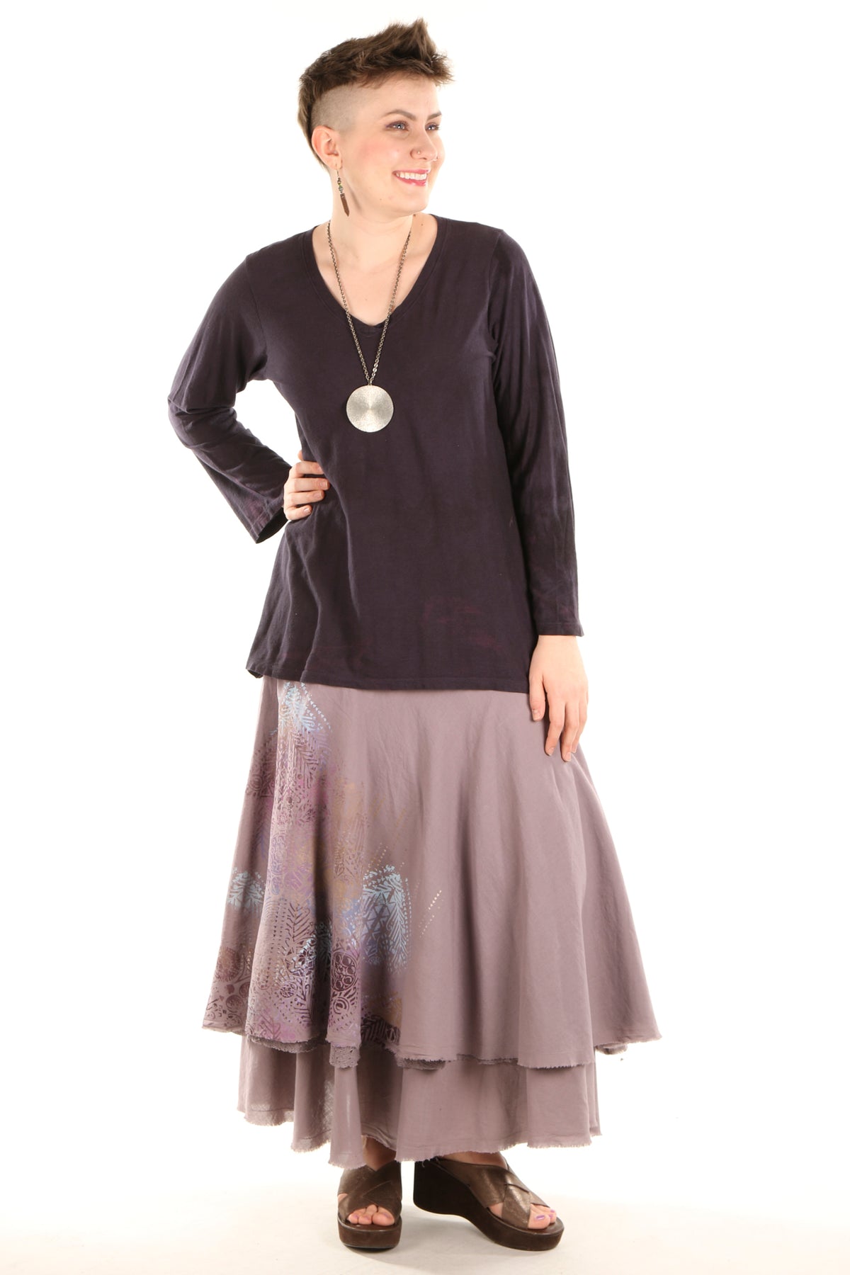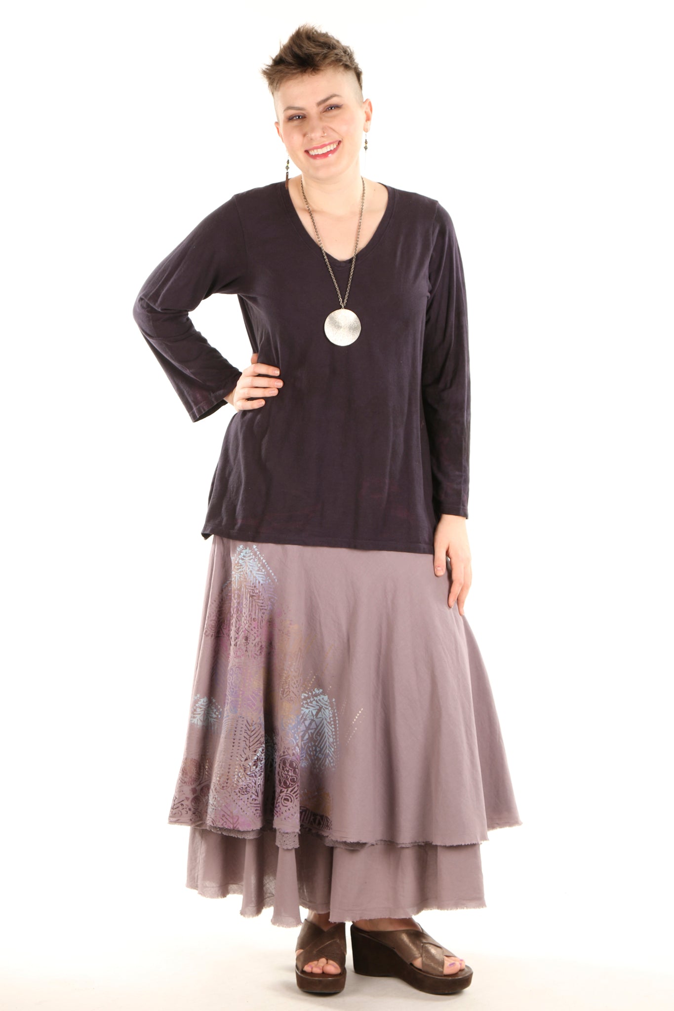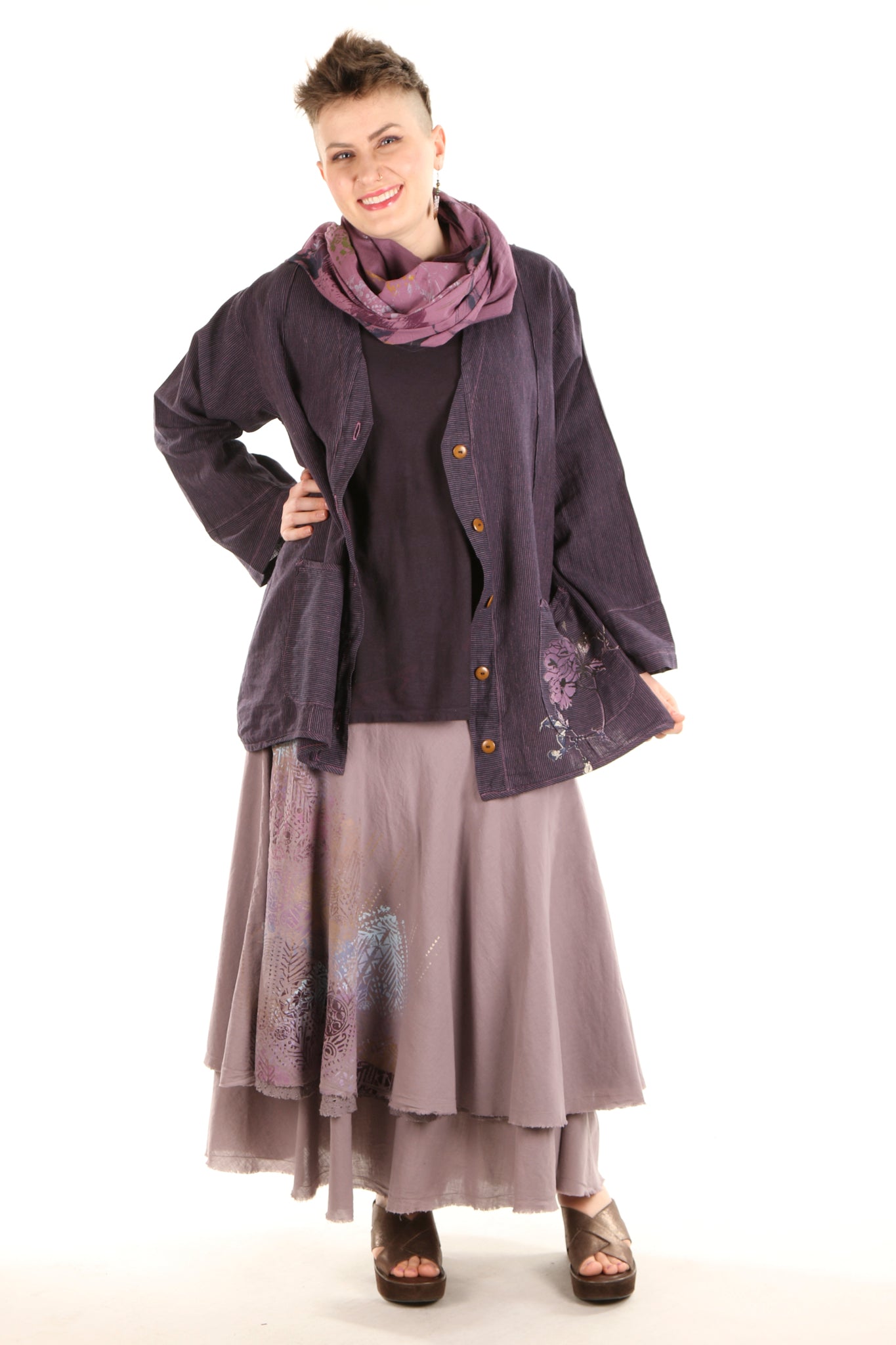 This skirt is the piece you need for special occasion dressing. It is a heavy and substantial skirt that you can wear in different ways. Three separate but related tiers, the longest of cotton lawn, the middle of heavyweight dyed lace, the top tier again in cotton lawn. The topmost tier is hand printed with a subtle texture.