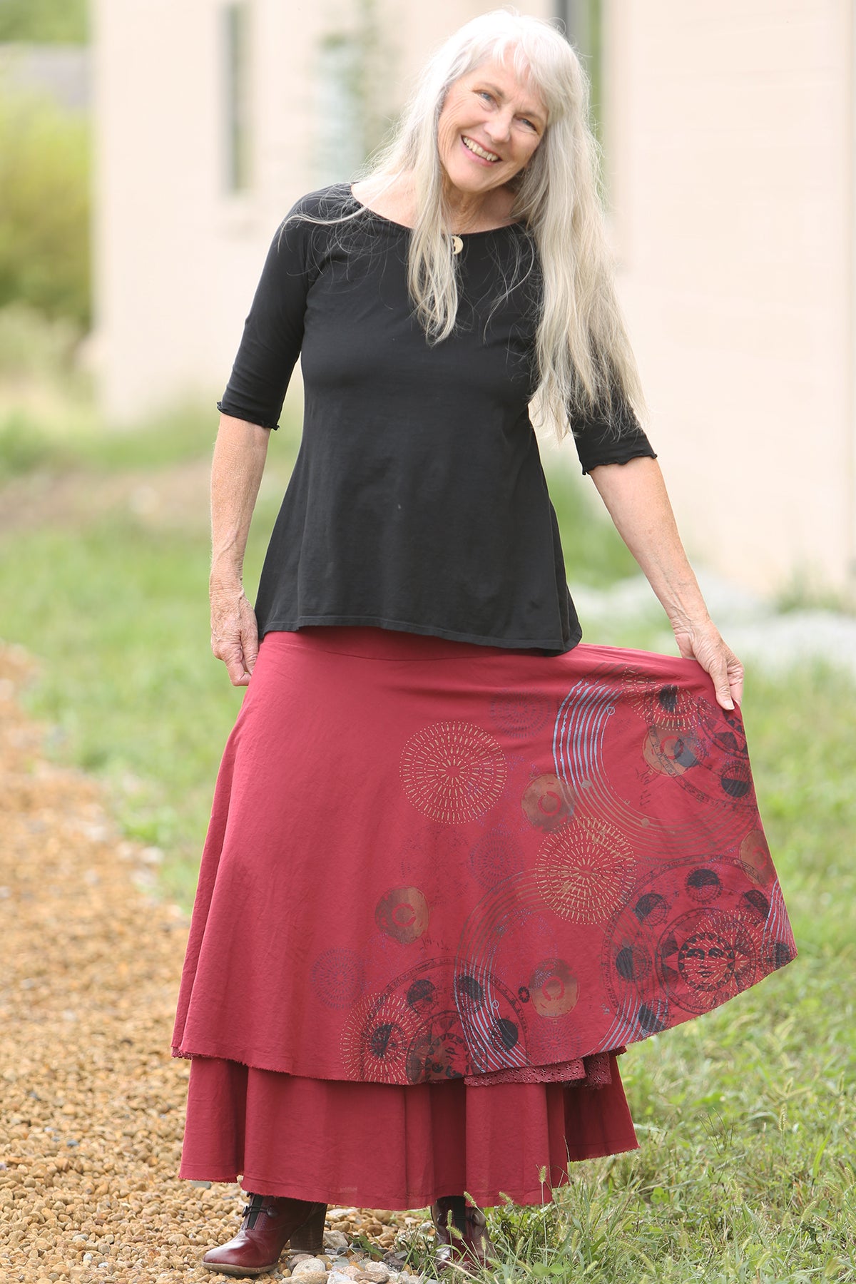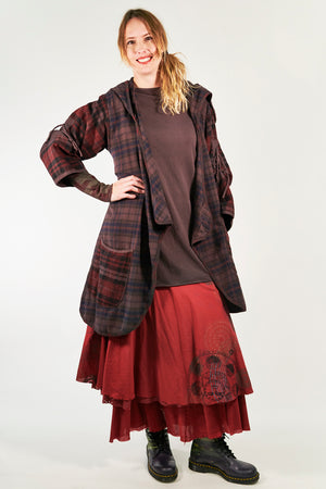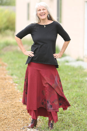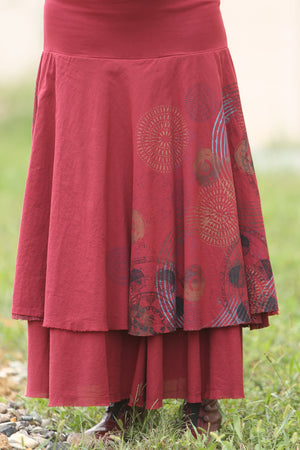This skirt is the piece you need for special occasion dressing. It is a heavy and substantial skirt that you can wear in different ways. Three separate but related tiers, the longest of cotton lawn, the middle of heavyweight dyed lace, the top tier again in cotton lawn. The topmost tier is hand printed with a subtle texture.