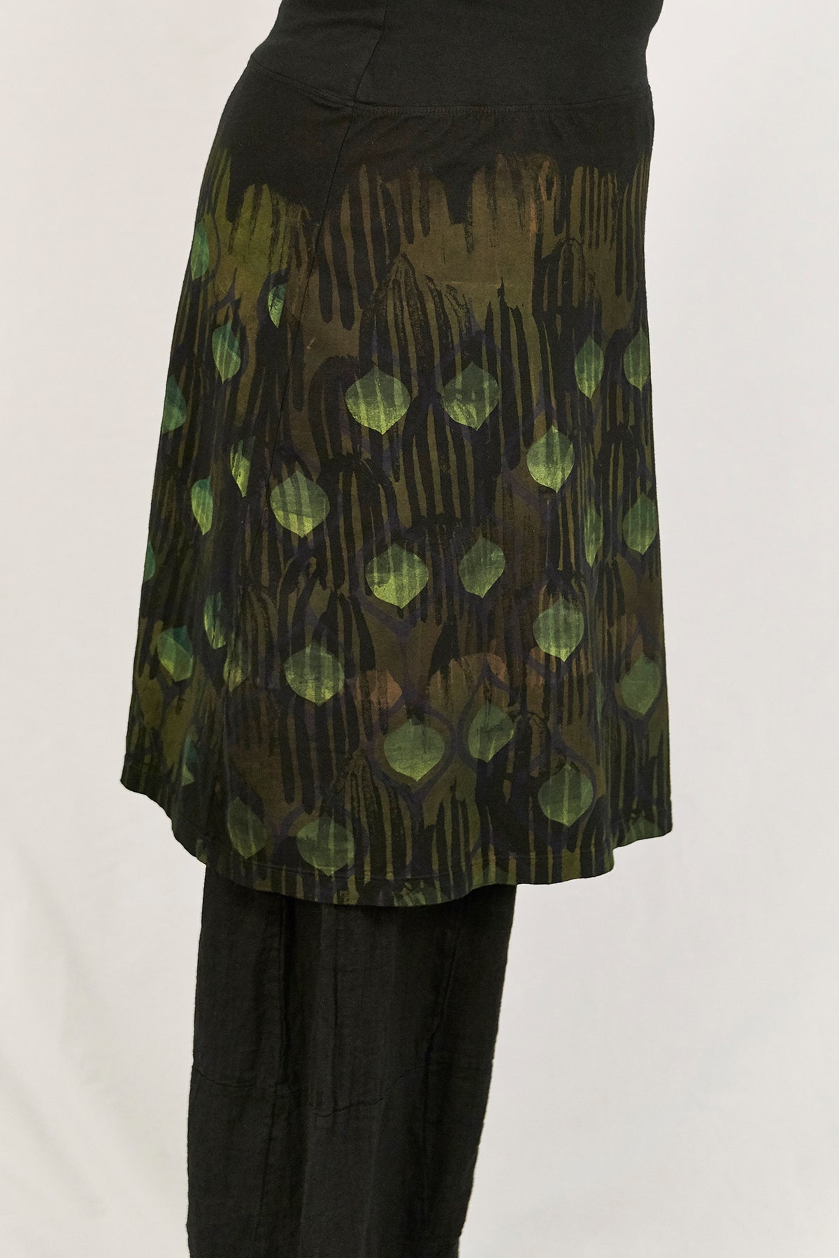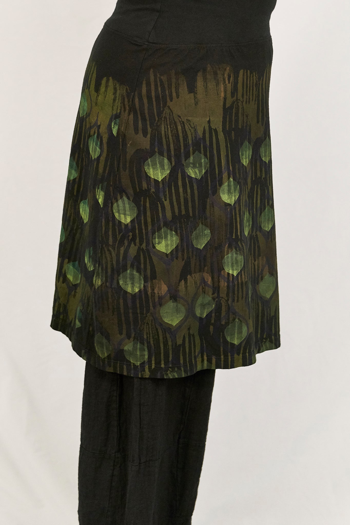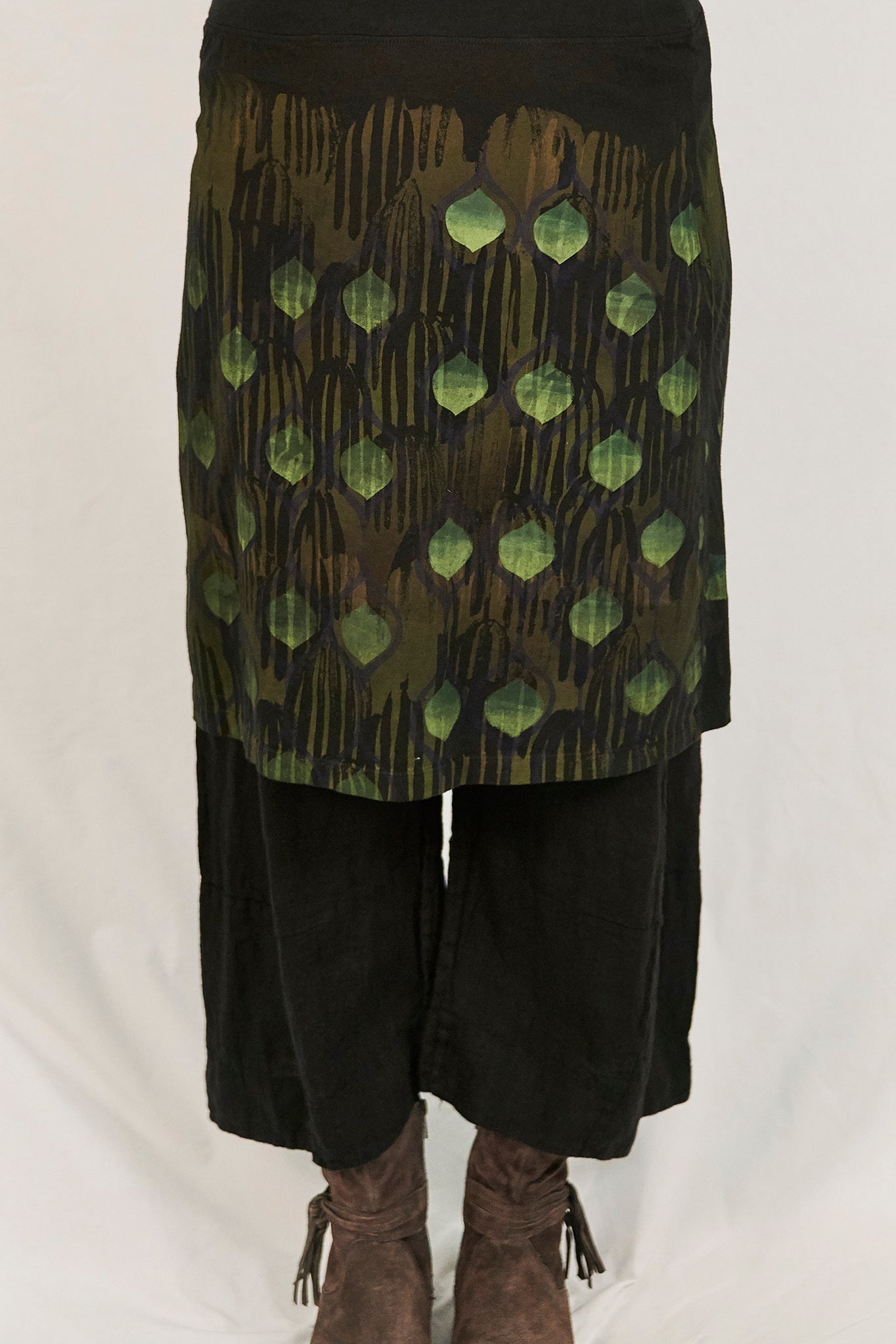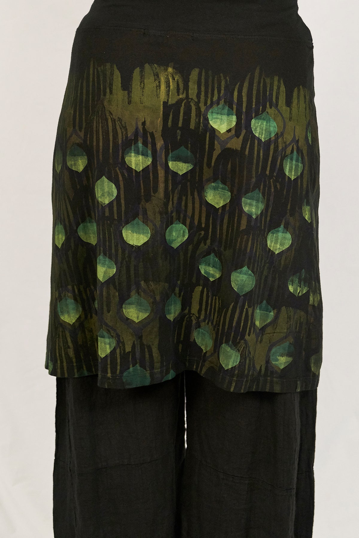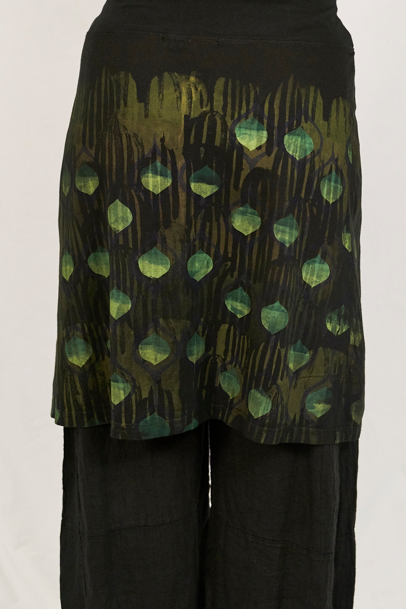 A playful short-layer skirt that is meant to be worn over wide pants or leggings for the purpose of adding an extra layer of color/tone and print to any outfit. sort of 'joins' the top and the bottom as a fusion piece.