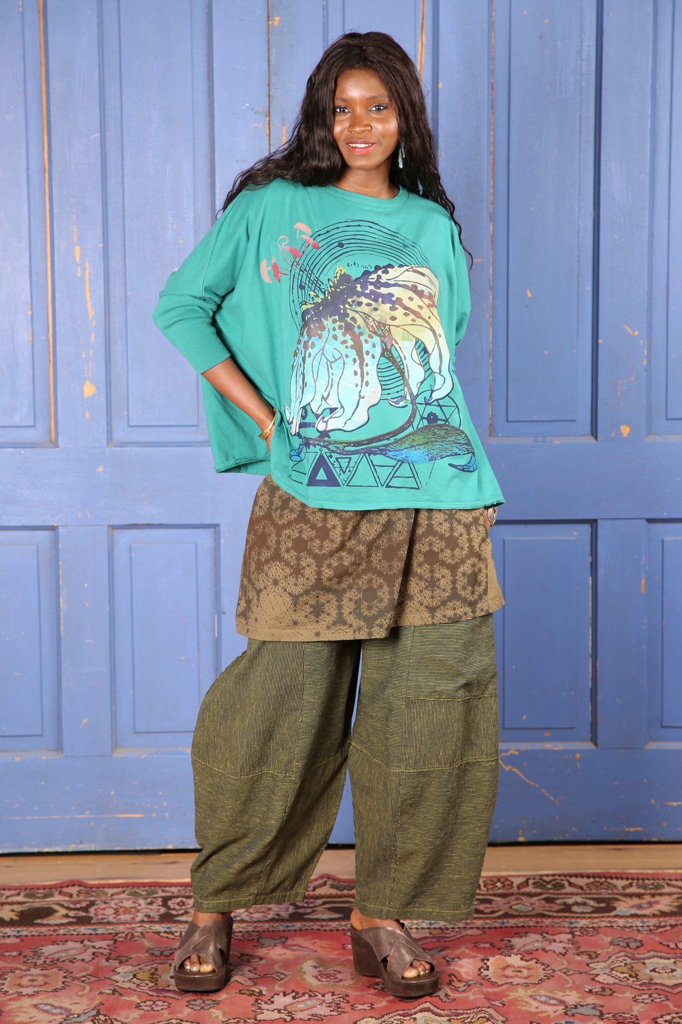 A playful short-layer skirt that is meant to be worn over wide pants or leggings for the purpose of adding an extra layer of color/tone and print to any outfit. sort of 'joins' the top and the bottom as a fusion piece.
