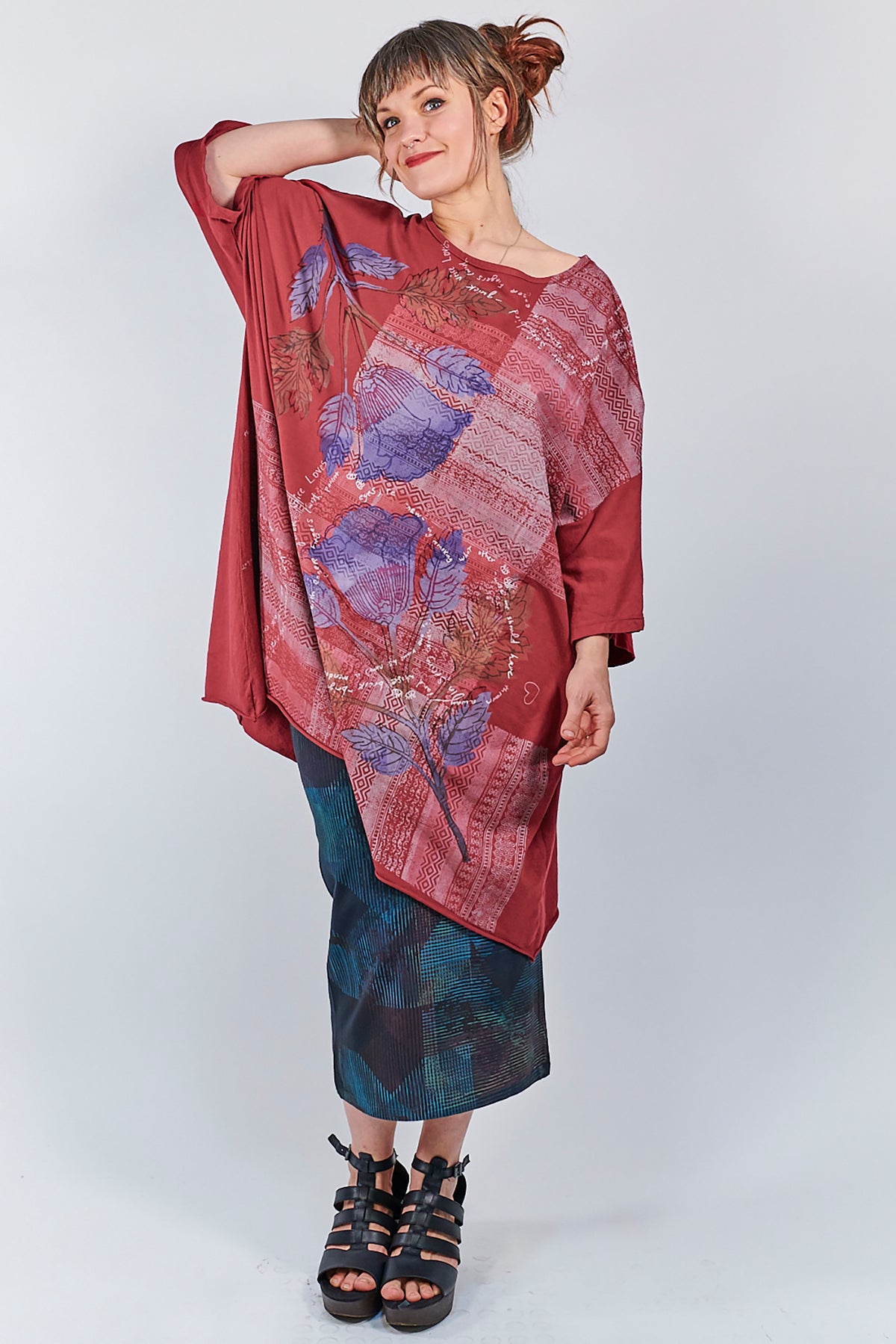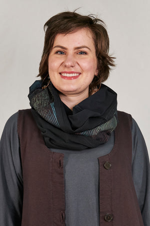 A wonderful layering piece with multiple uses: wear as a skirt OR an infinity scarf or balaclava for a splash of color! This fitted (and very stretchy) shape is perfect for wearing either way. Versatile and beautifully printed on the front and back. Stretches far beyond the sizing chart dimensions.