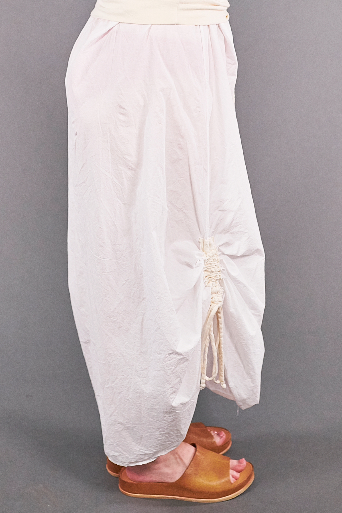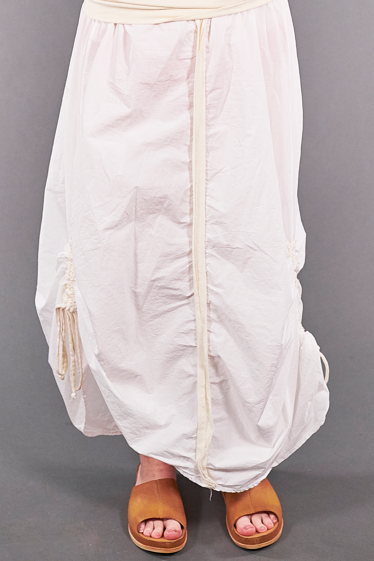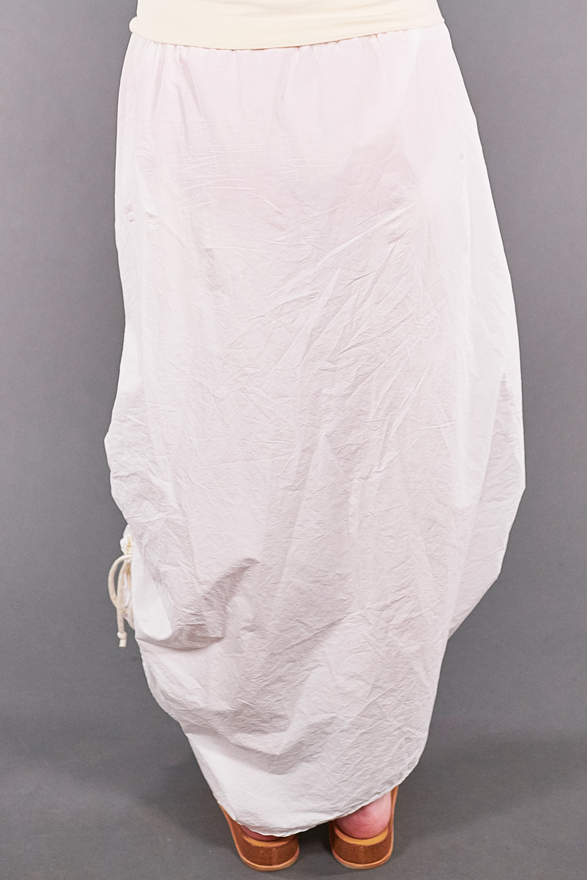 Foldover waist is comfortable & allows for height adjustment. Two ties allow for adjustable ruching--unfurl them to wear it long, or tie them up to create a draped effect. Turn it around & wear it sideways... pull it up higher so it appears short... This is THE skirt for adventurous dressers. Don't be afraid to get in there and create! Twist it, turn it, fold it... the sky is the limit.