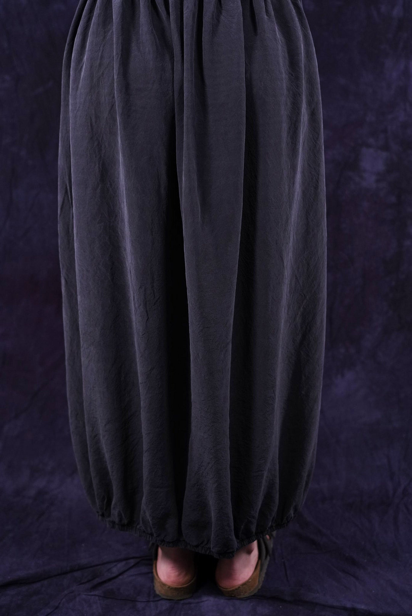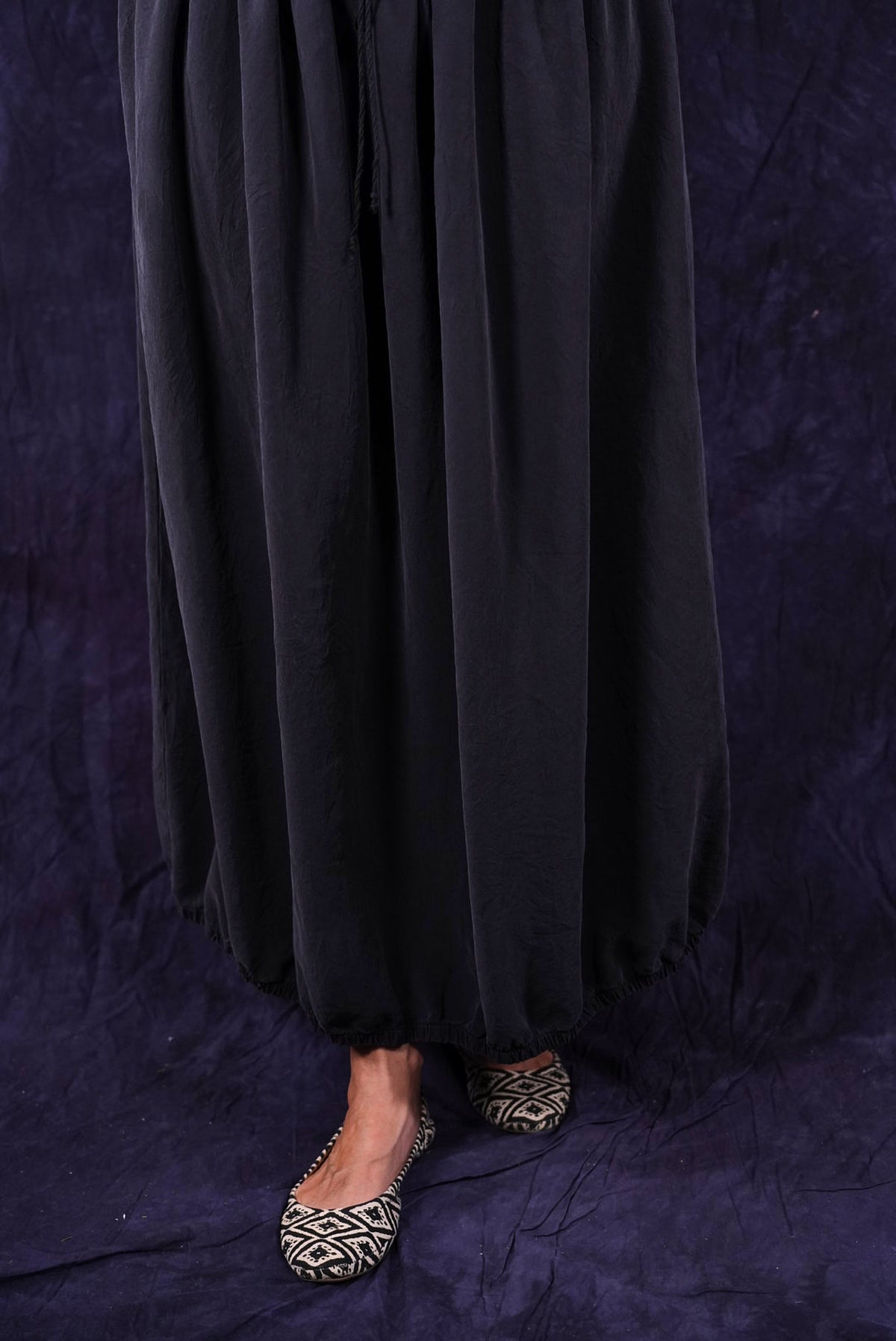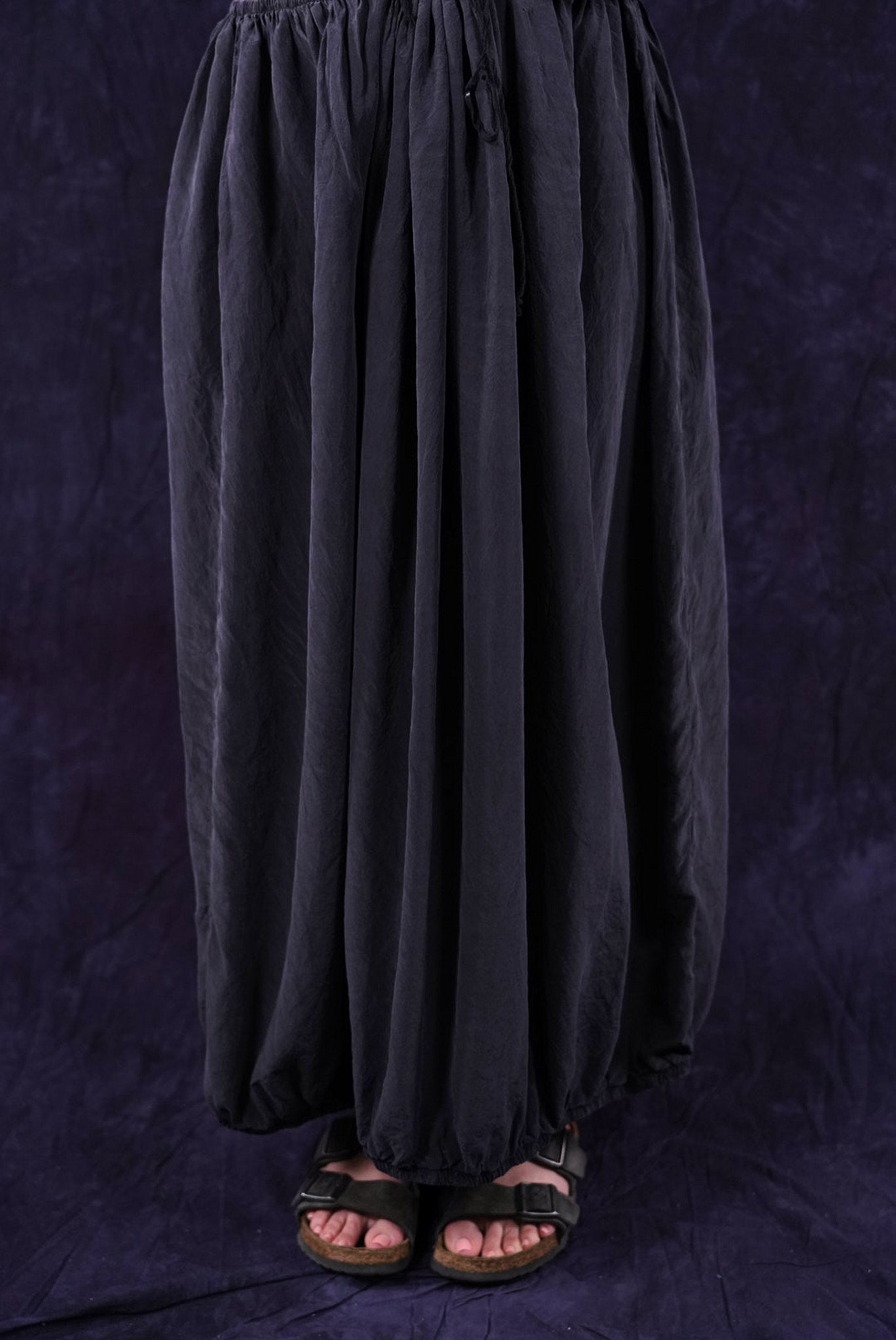 Simple, useful dressier skirt in soft black. Heavy, textured a bit, not delicate silk skirt with a partial drawstring waist and gathered hemline. Waist only pulls in a little and runs on the larger side, if you have a smaller waist you may need to add a clip or a few stitches to fit the waist to your size.