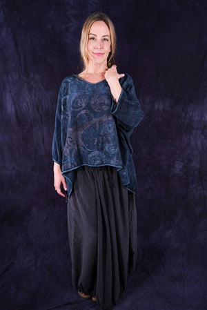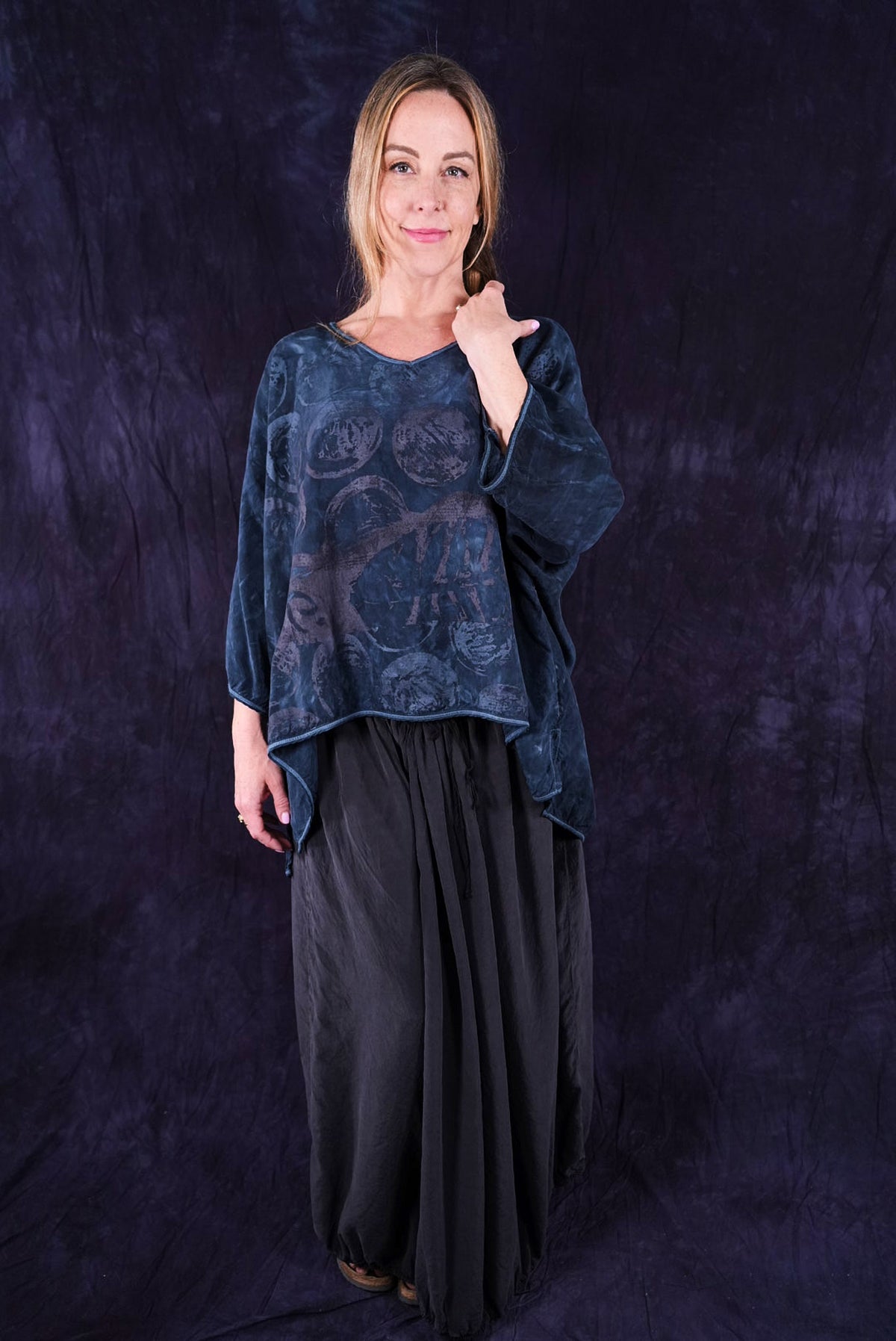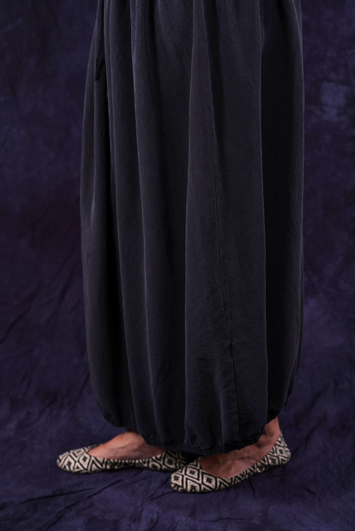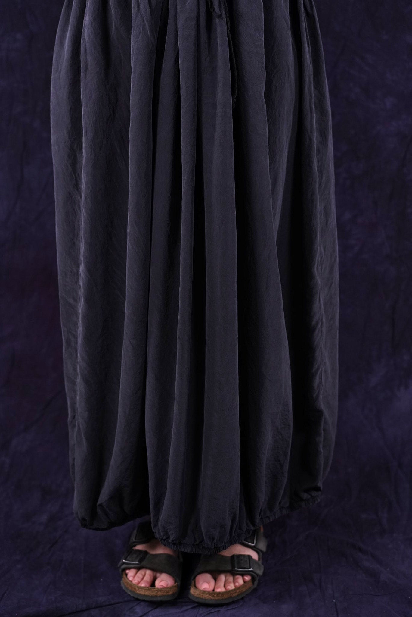 Simple, useful dressier skirt in soft black. Heavy, textured a bit, not delicate silk skirt with a partial drawstring waist and gathered hemline. Waist only pulls in a little and runs on the larger side, if you have a smaller waist you may need to add a clip or a few stitches to fit the waist to your size.