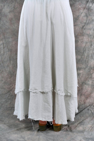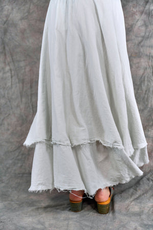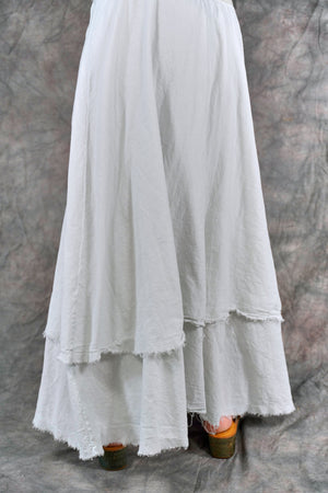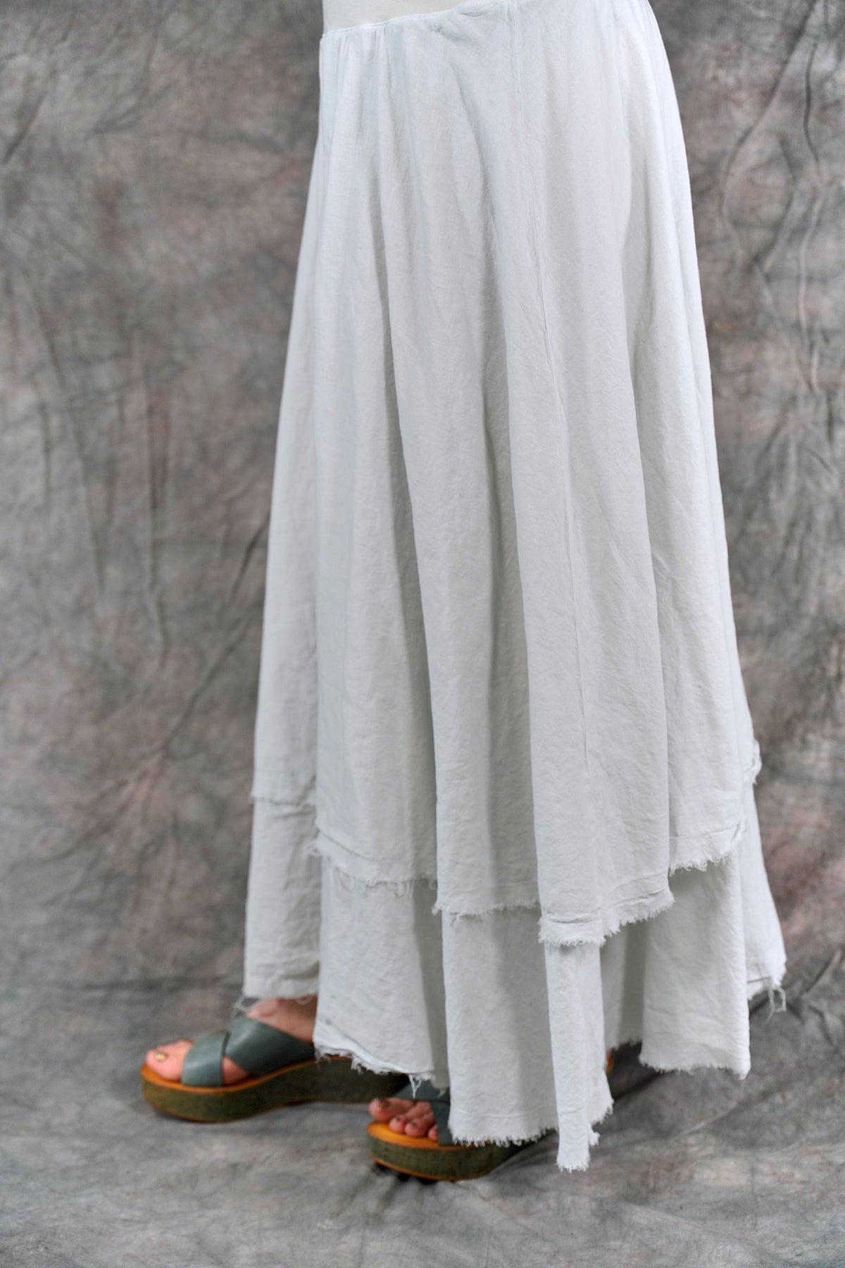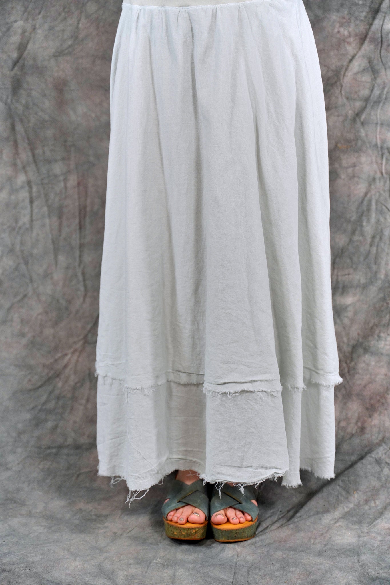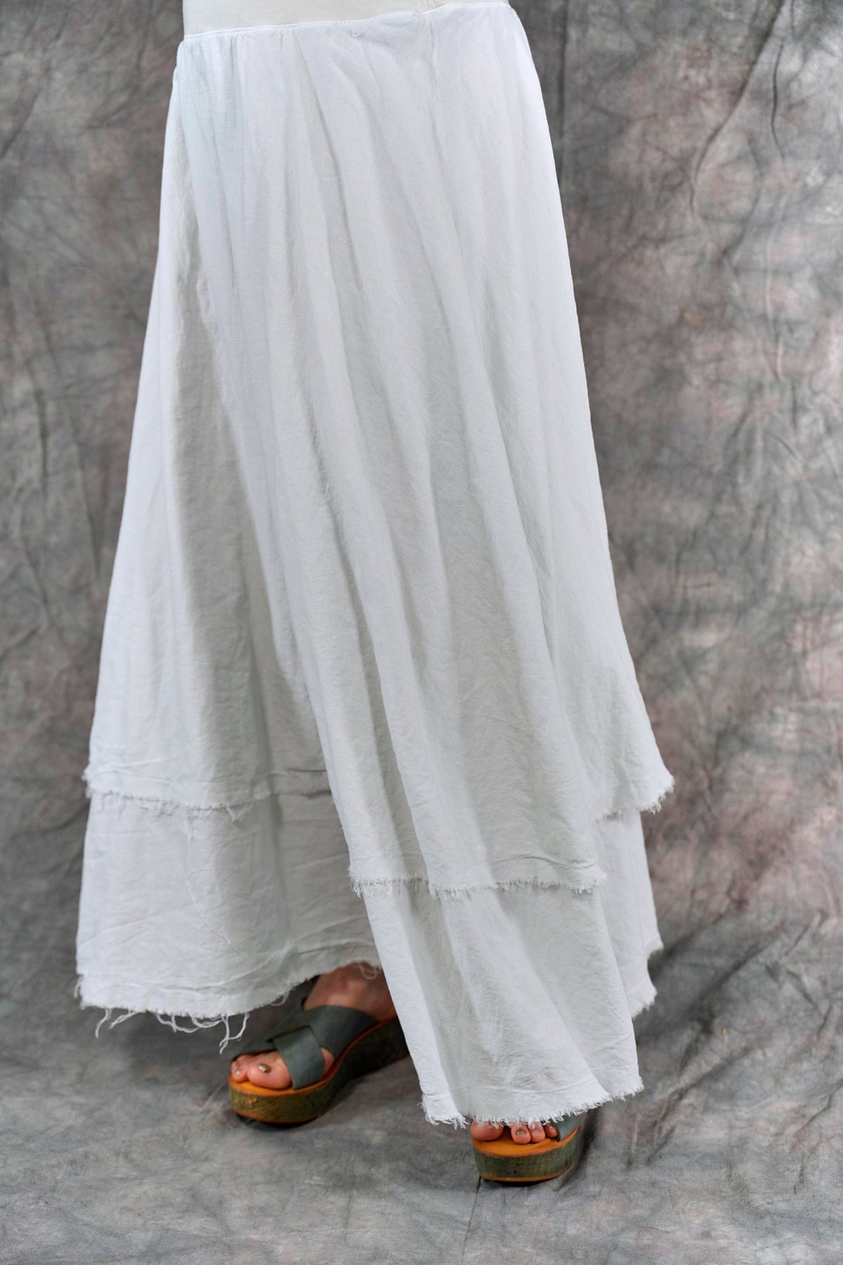 Soft 100% Cotton lawn tiers with textural raw edges make this a fun skirt to wear on it's own or layered under your favorite dresses and tunics. The waistband is a wide organic cotton spandex doubled band, as we have used for years on skirts and four square pants, that can be folded over to any length to create a perfect length and fit for you.