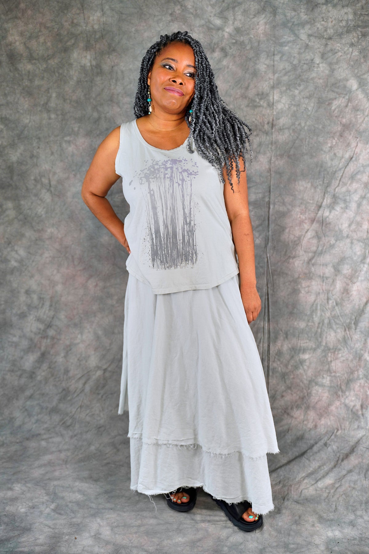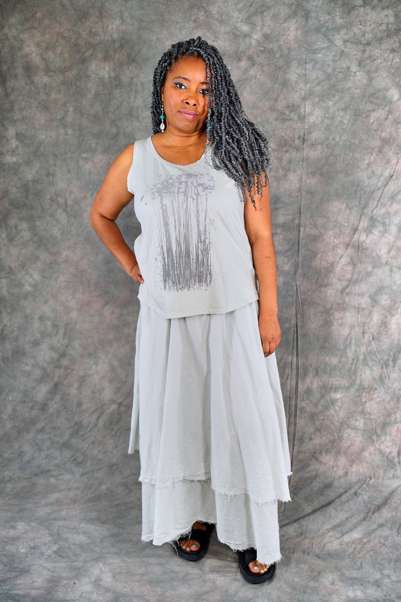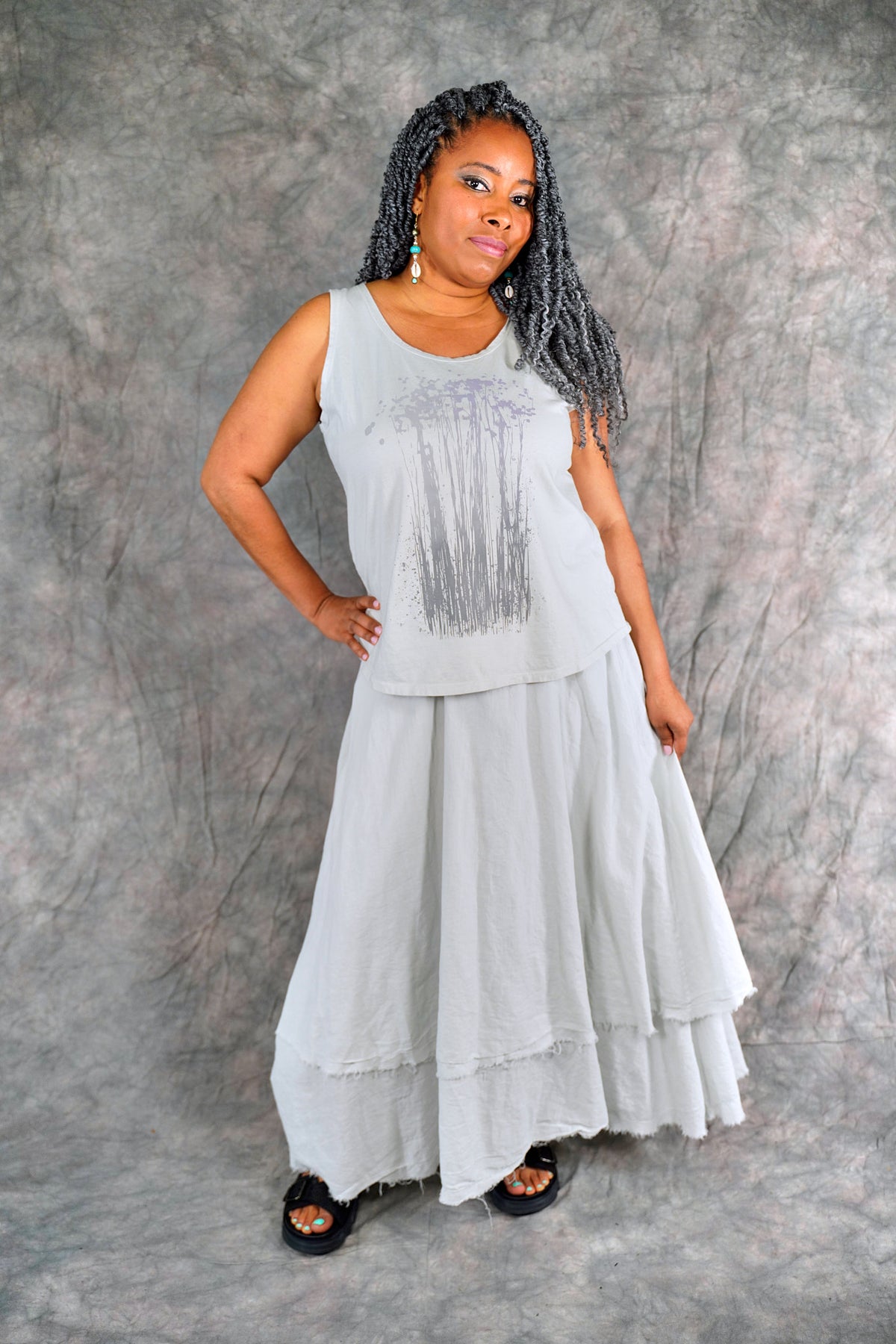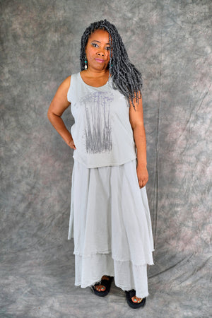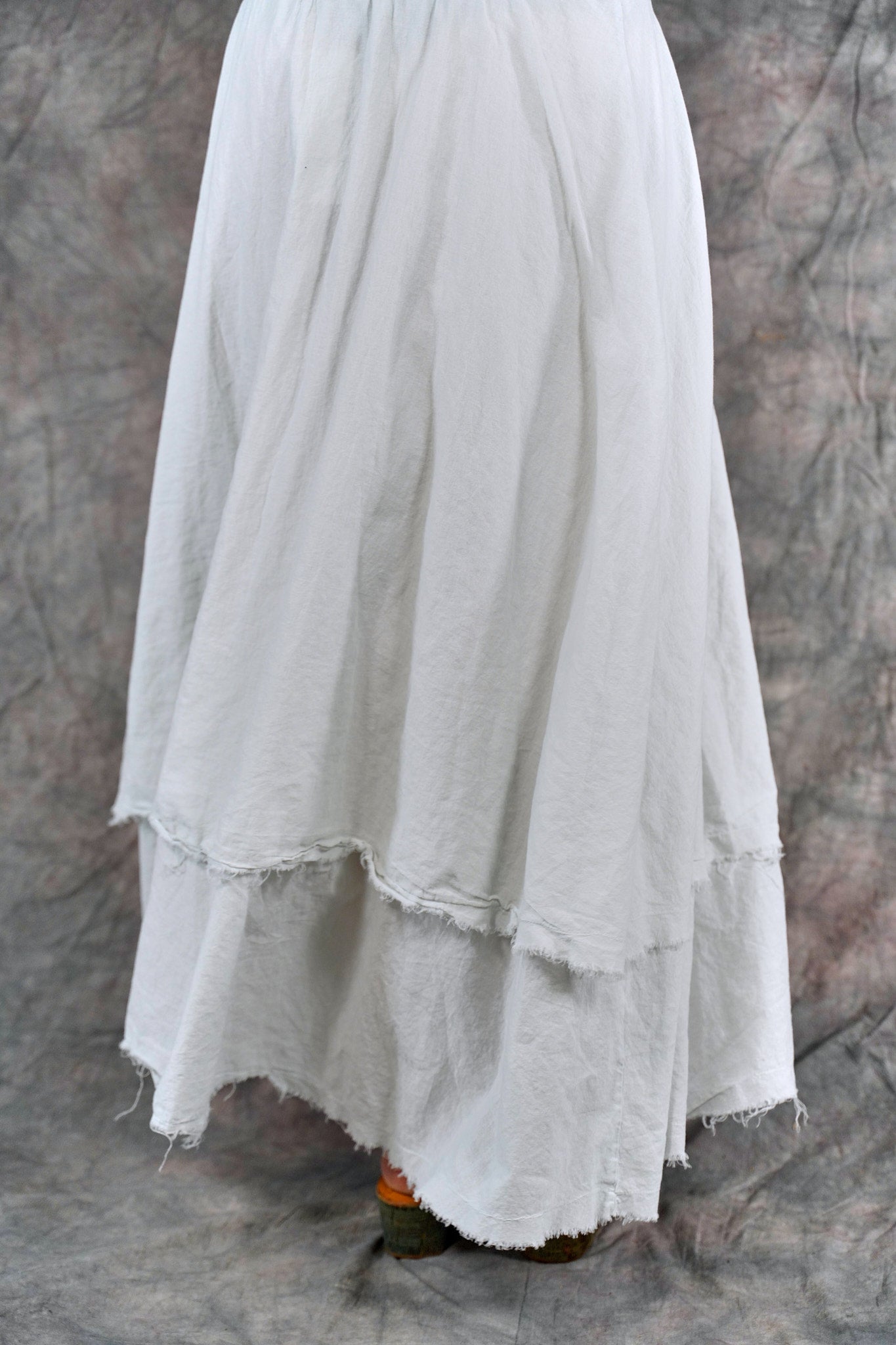Soft 100% Cotton lawn tiers with textural raw edges make this a fun skirt to wear on it's own or layered under your favorite dresses and tunics. The waistband is a wide organic cotton spandex doubled band, as we have used for years on skirts and four square pants, that can be folded over to any length to create a perfect length and fit for you.