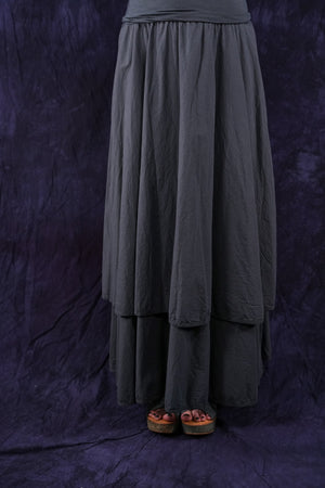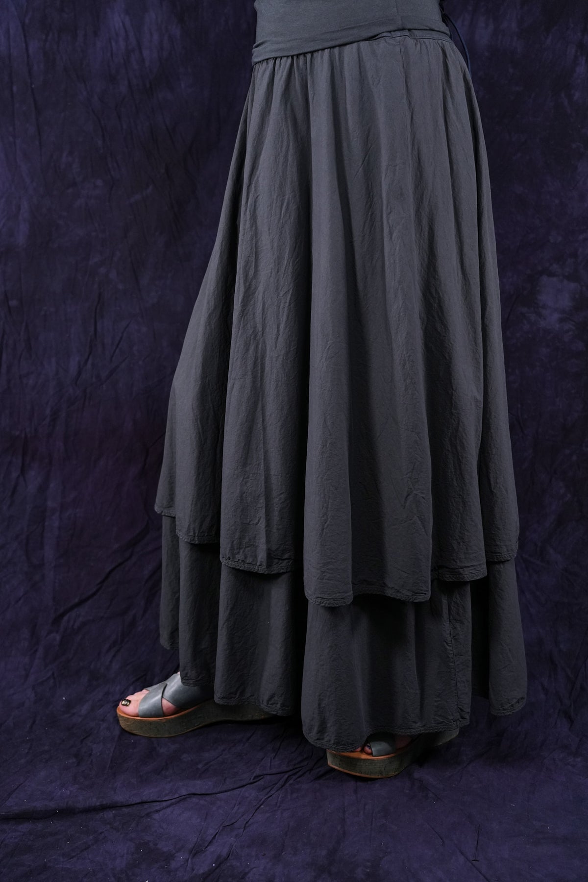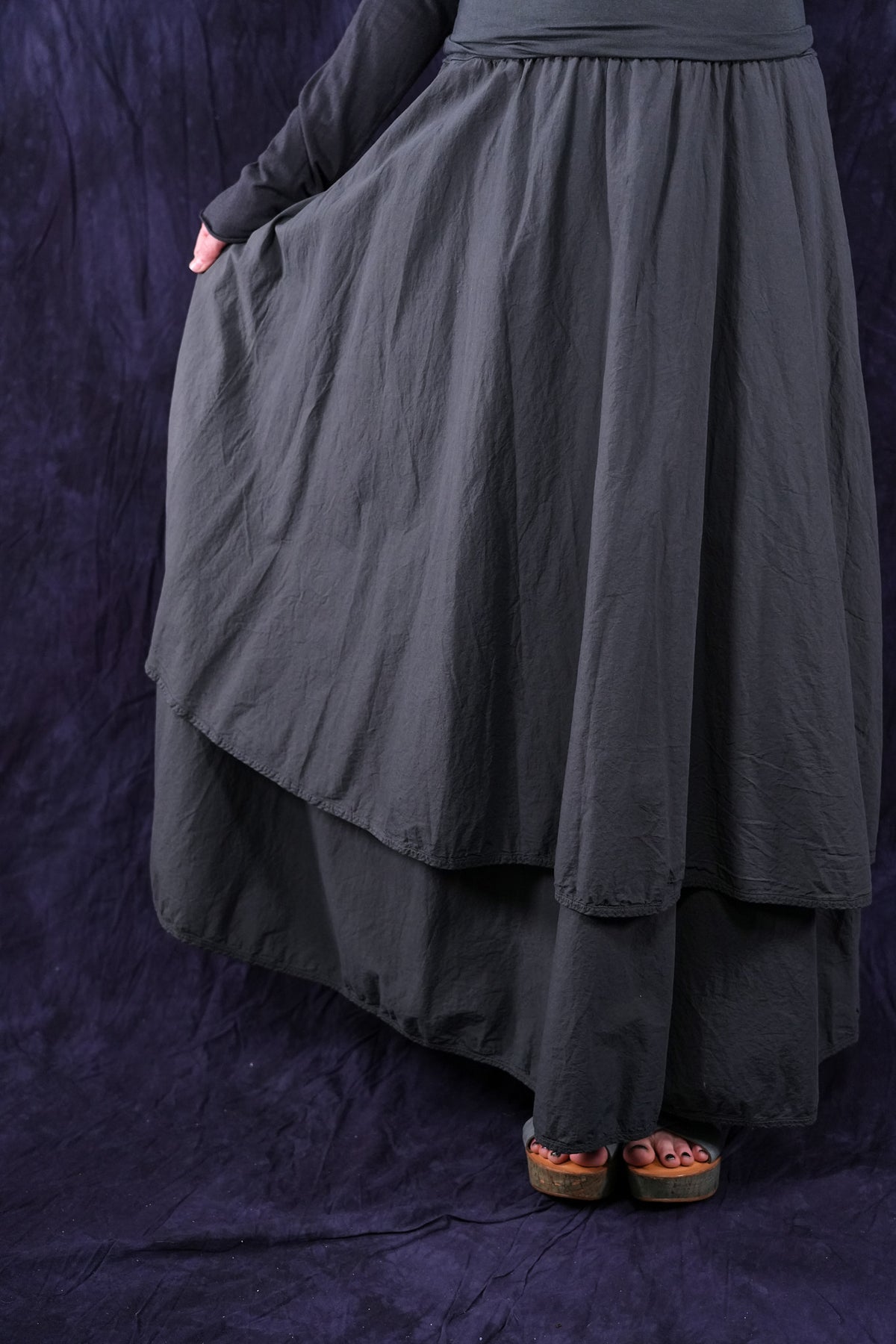 Gorgeous! Specialty skirt in layers and yards of organic lawn, and onyx a silk like sustainable fabric. Flowy and fun for the holidays or every day. The long waistband is made from stretchy organic cotton spandex and you can fold it over or wear it long to create your perfect length and comfort, Some even unfold the band and wear the cotton lycra band as a top/dress or layered beneath any piece.