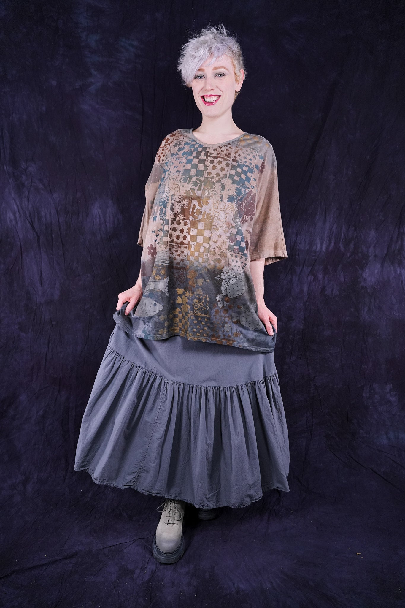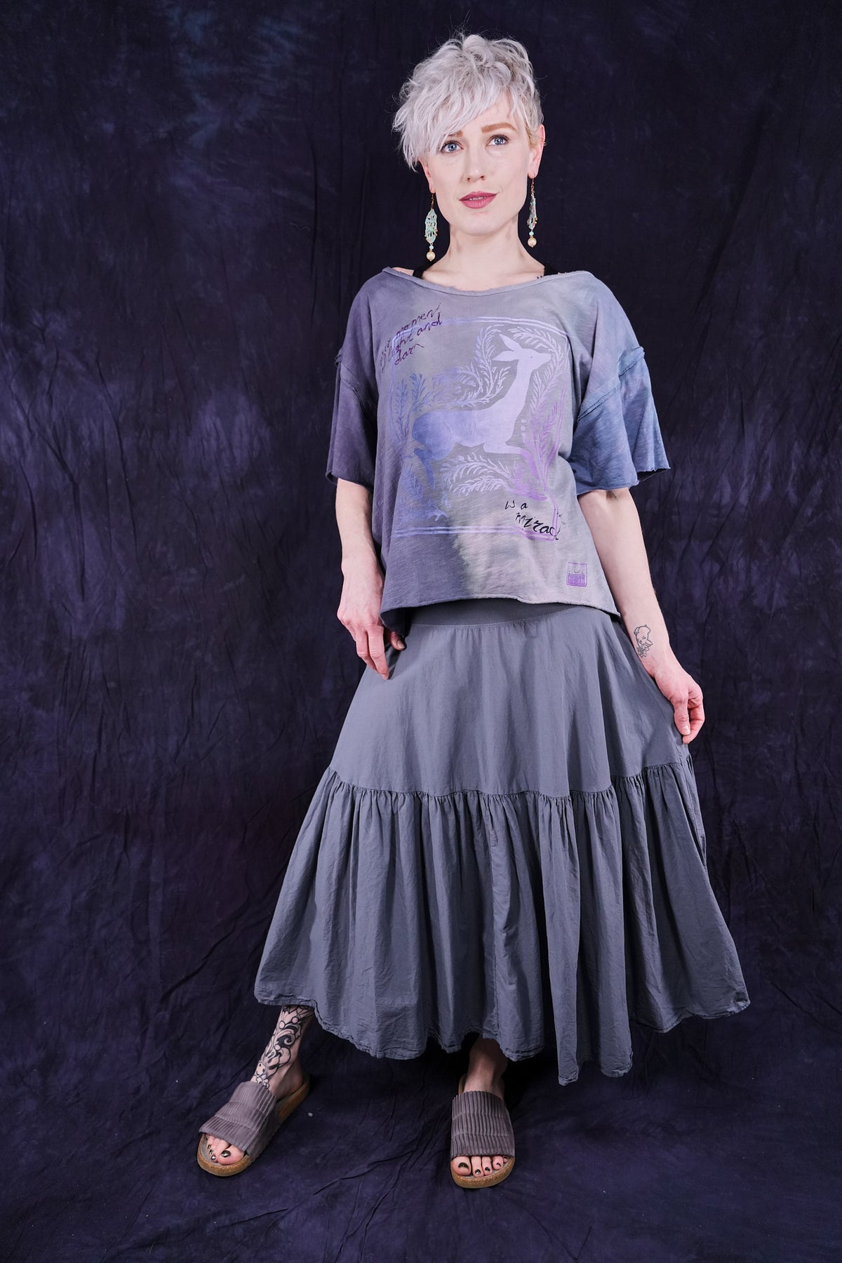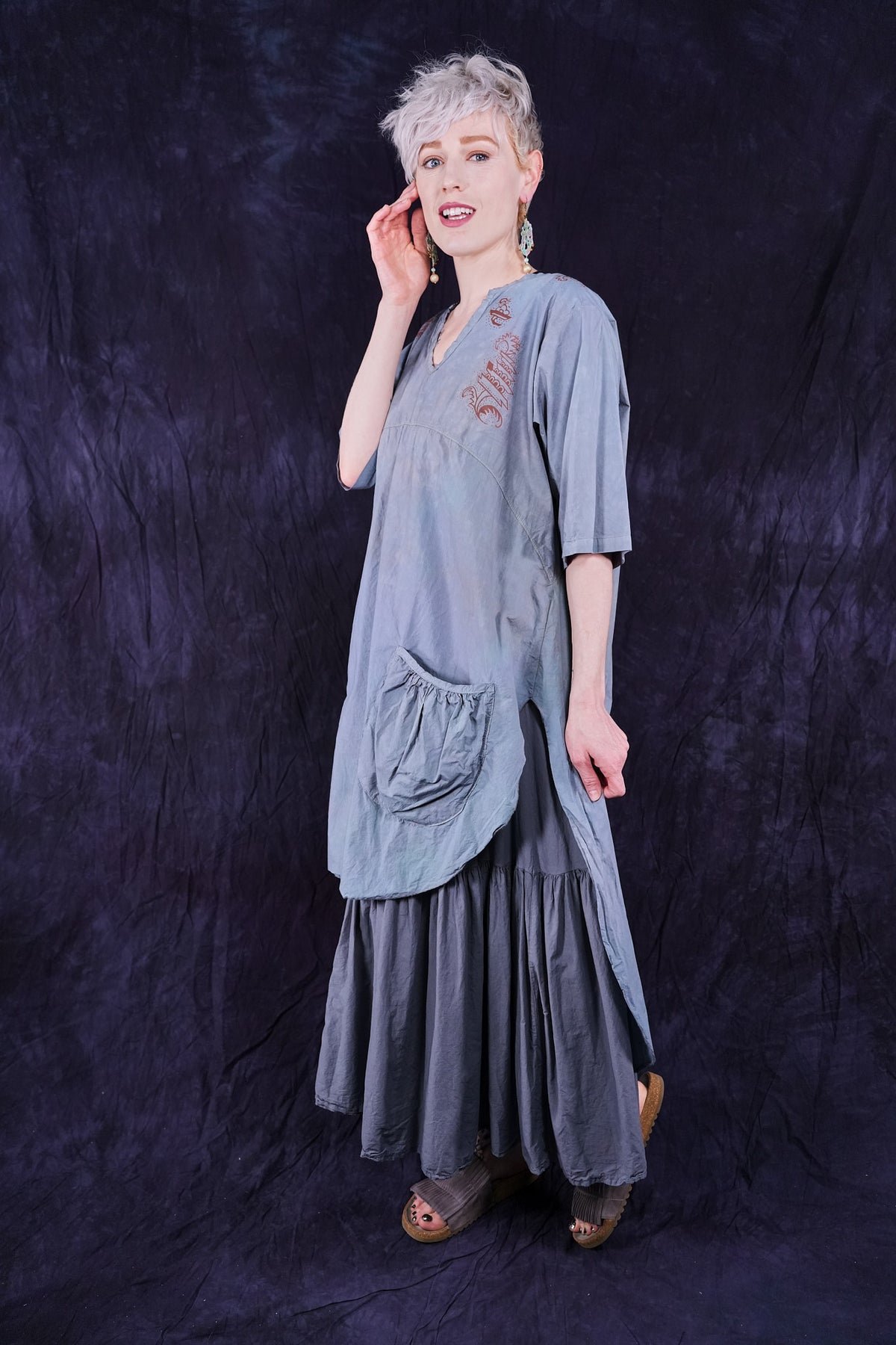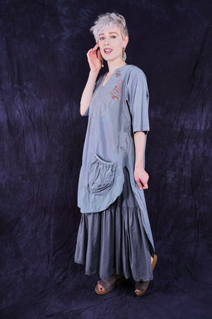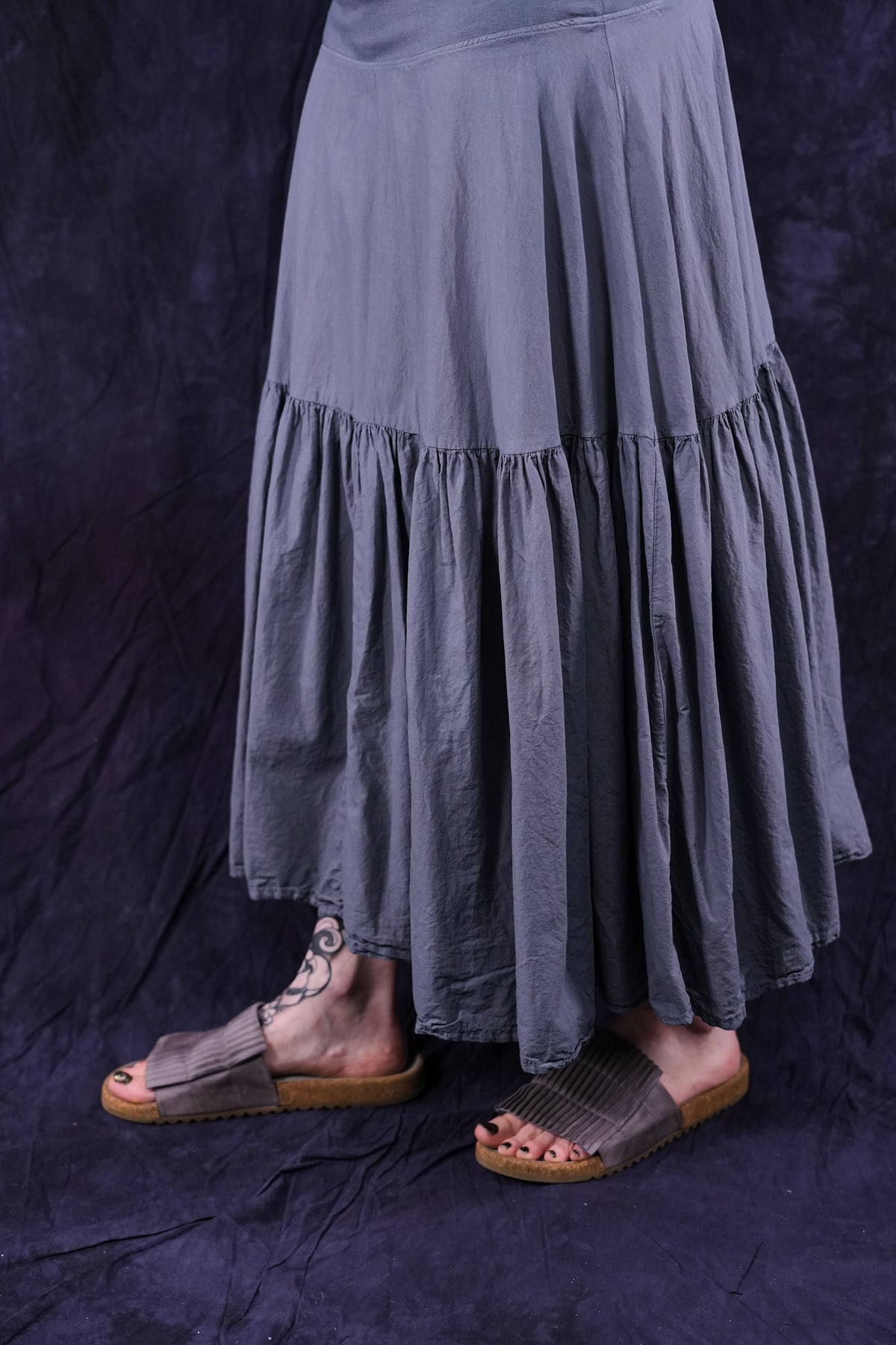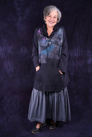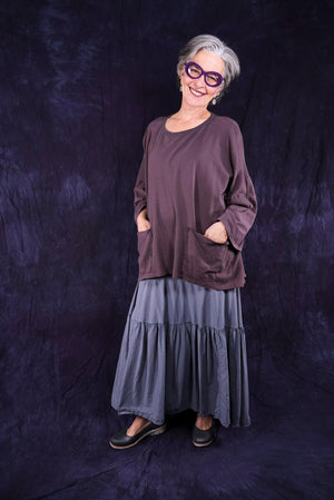 Wear it long to the floor or pull up as a sleeveless dress. Fold the stretchy cotton waist over to adjust skirt length to your liking and comfort. It is a great piece. Our breeziest spring-summer skirt- airy and light- yet not too light- for perfect layering every time, under anything! ( or pull it up to wear it as a sleeveless dress under the Cardi) 10 inch stretch cotton jersey fold over waist on this flowy skirt for length versatility. Simplified version of our cottage skirt. Cool, floaty organic cotton lawn, breathe and be!