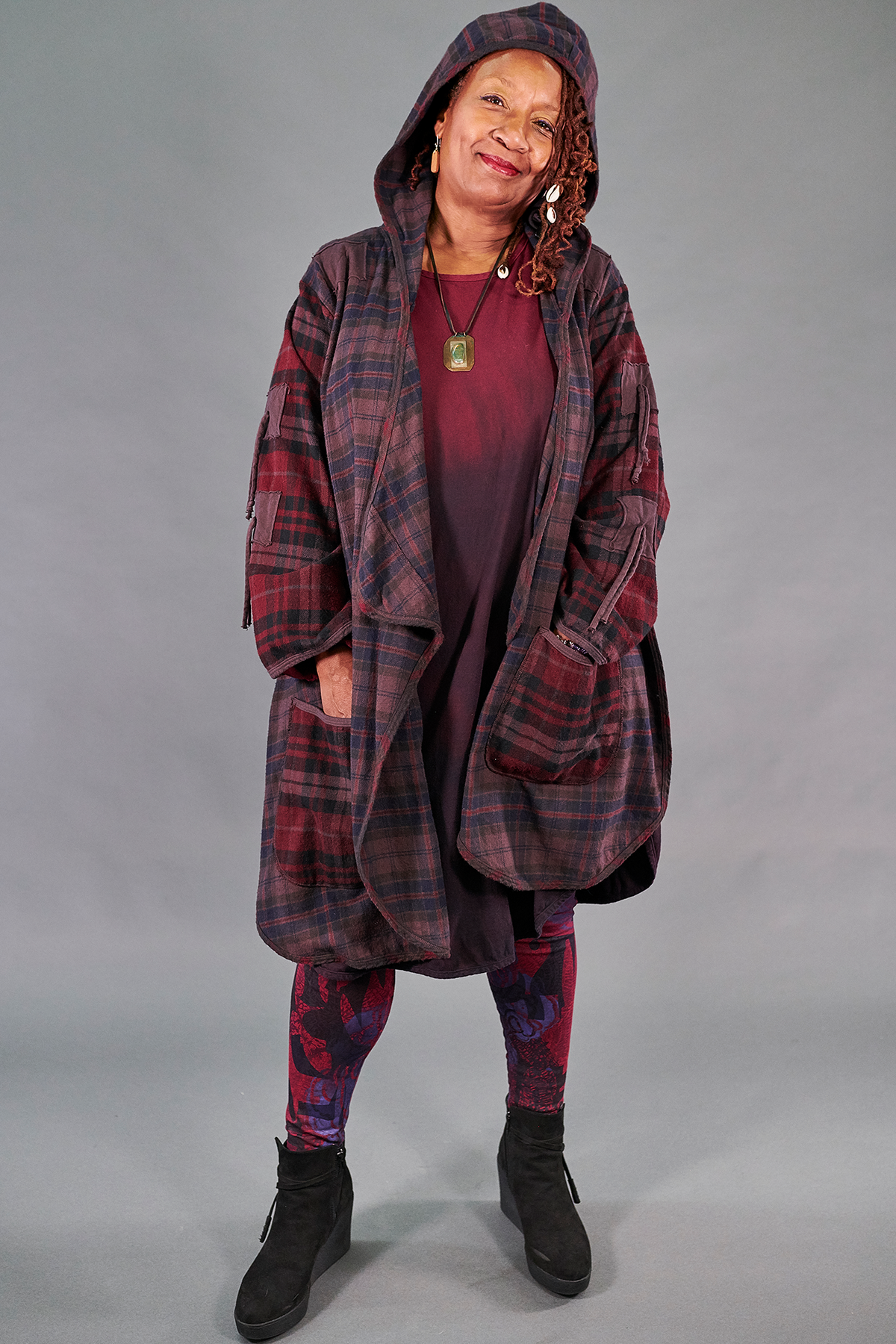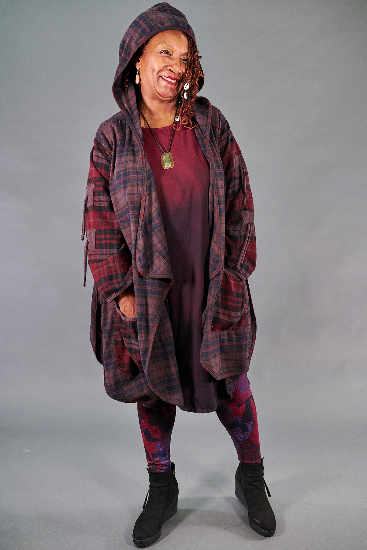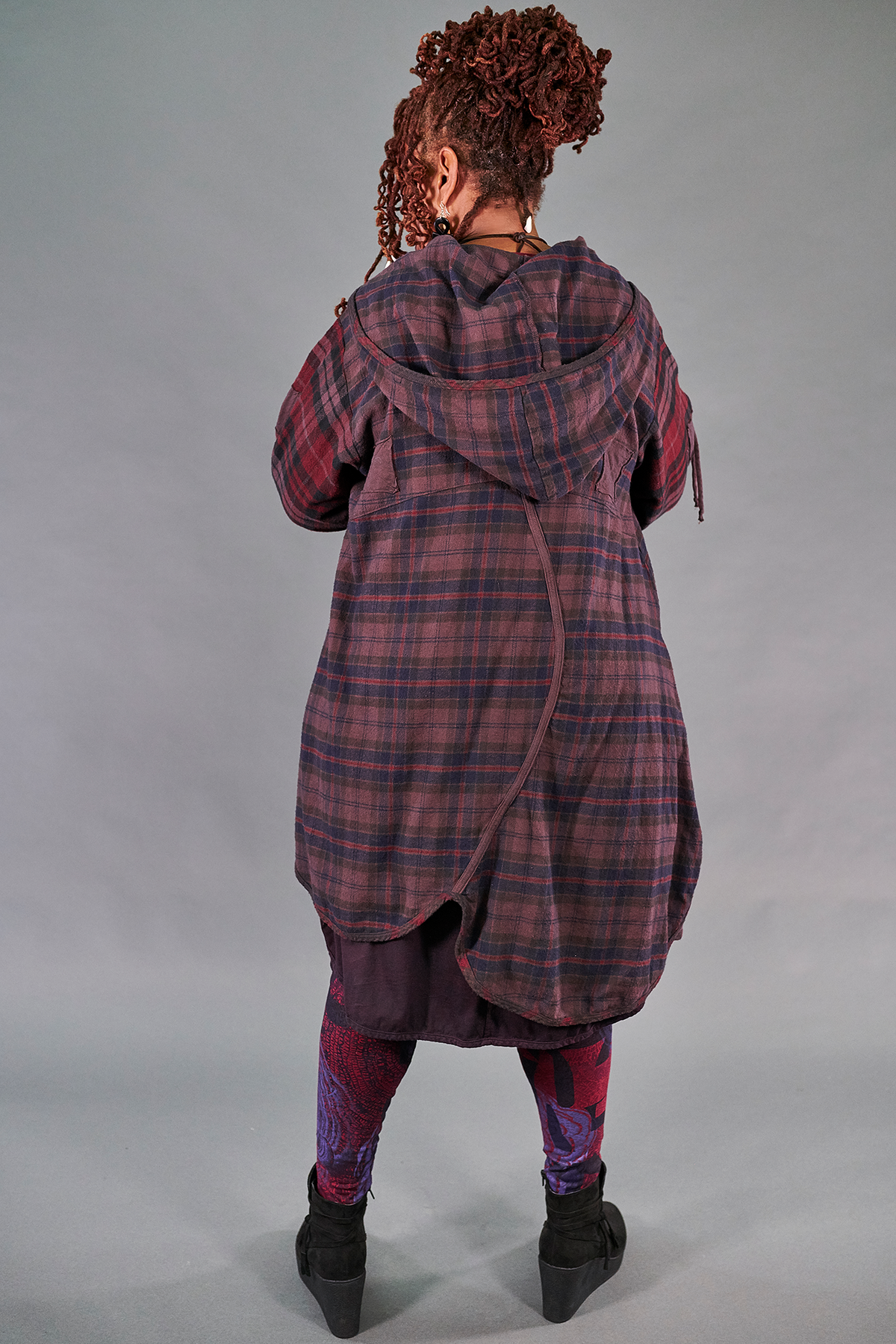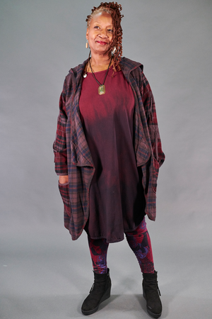 This jacket in heavy flannel is truly a piece to treasure for years to come. The styling is unique, flatters every body, and coordinates with many of our rich, seasonal colors- especially our favorite purpley- brown complex and lovely ‘Peat’ color. Made in the USA of 100% cotton plaid fabrics with subtly contrasting colors on the sleeves & large, curved pockets. Asymmetric hemline & curved seams on the back create a funky yet elegant silhouette that is uniquely Blue Fish. Open front cascades beautifully & ties on the arms allow you to wear sleeves long or ruched. You will never find another jacket like this! Very limited supply available.
