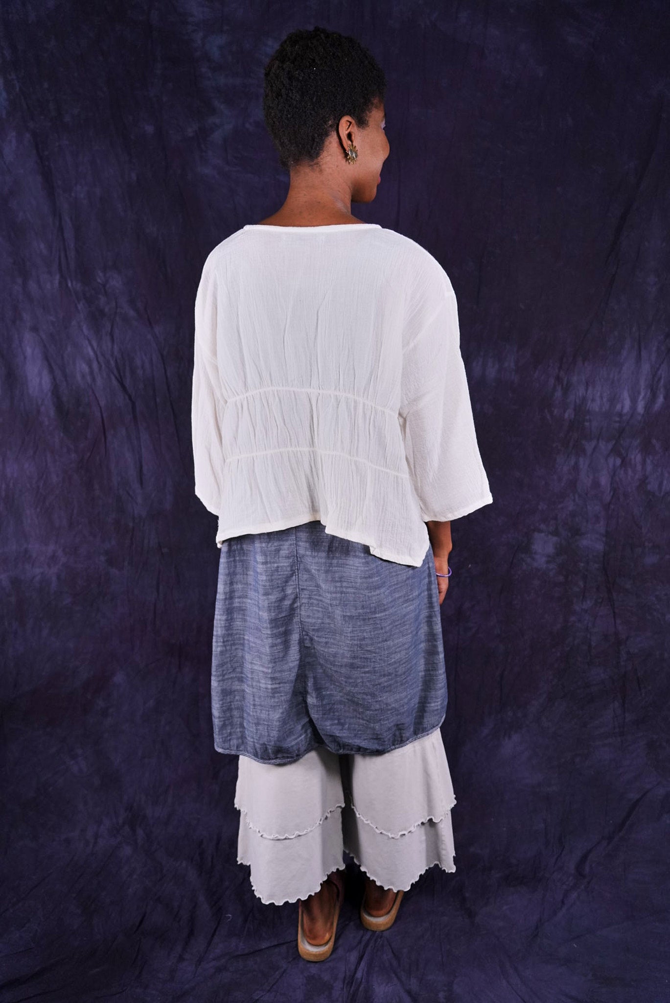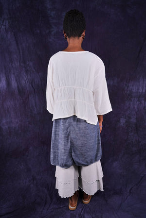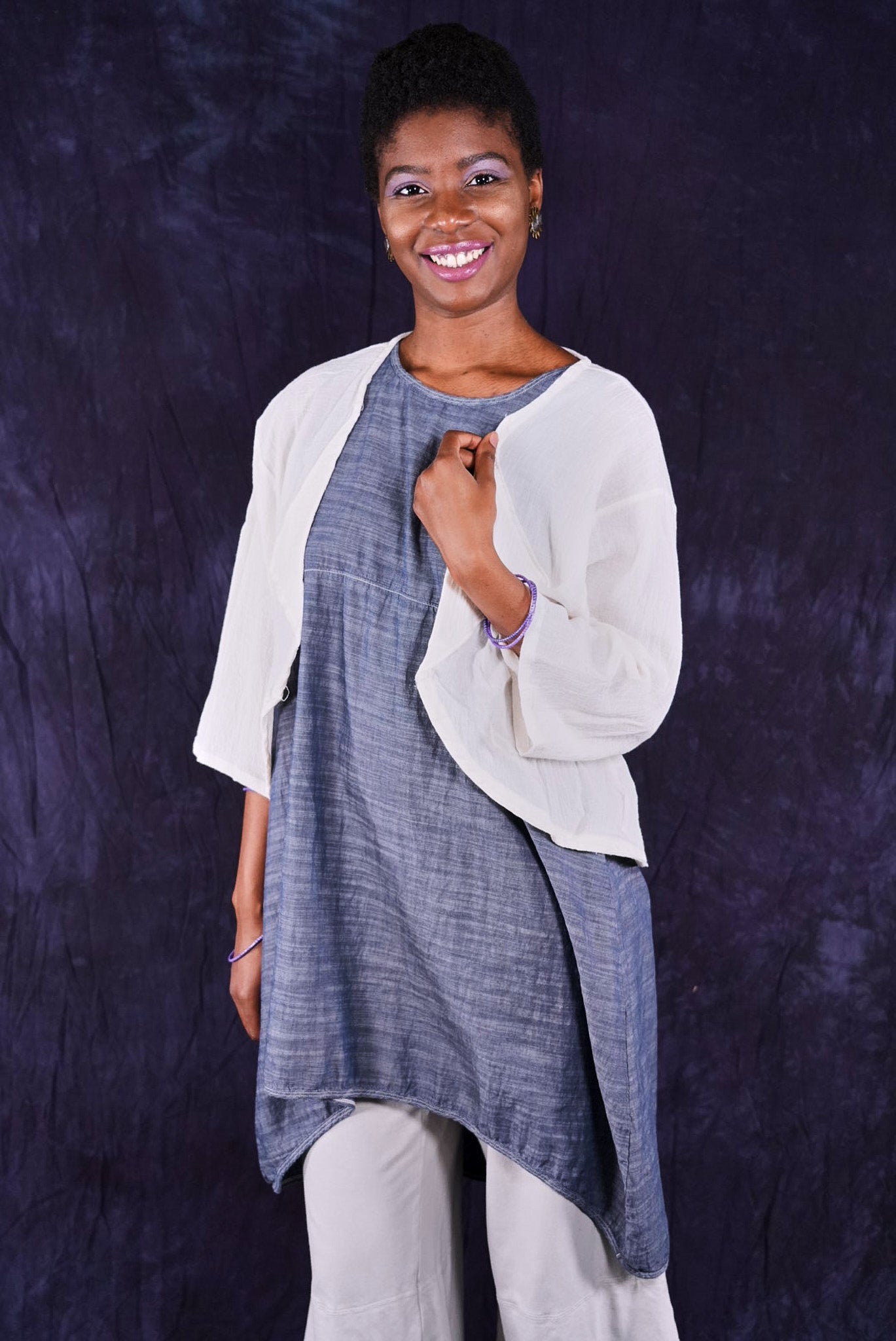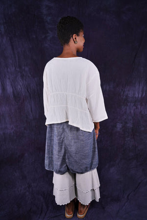 So light...You will find so many ways to have fun in this cropped cardi made of soft cotton gauze. A perfect throw-over-the-shoulders summer cover up for day or night. Two rows of elastic ruching in the back create beautiful texture and drape. Open front can be left open, or closed with a pin.