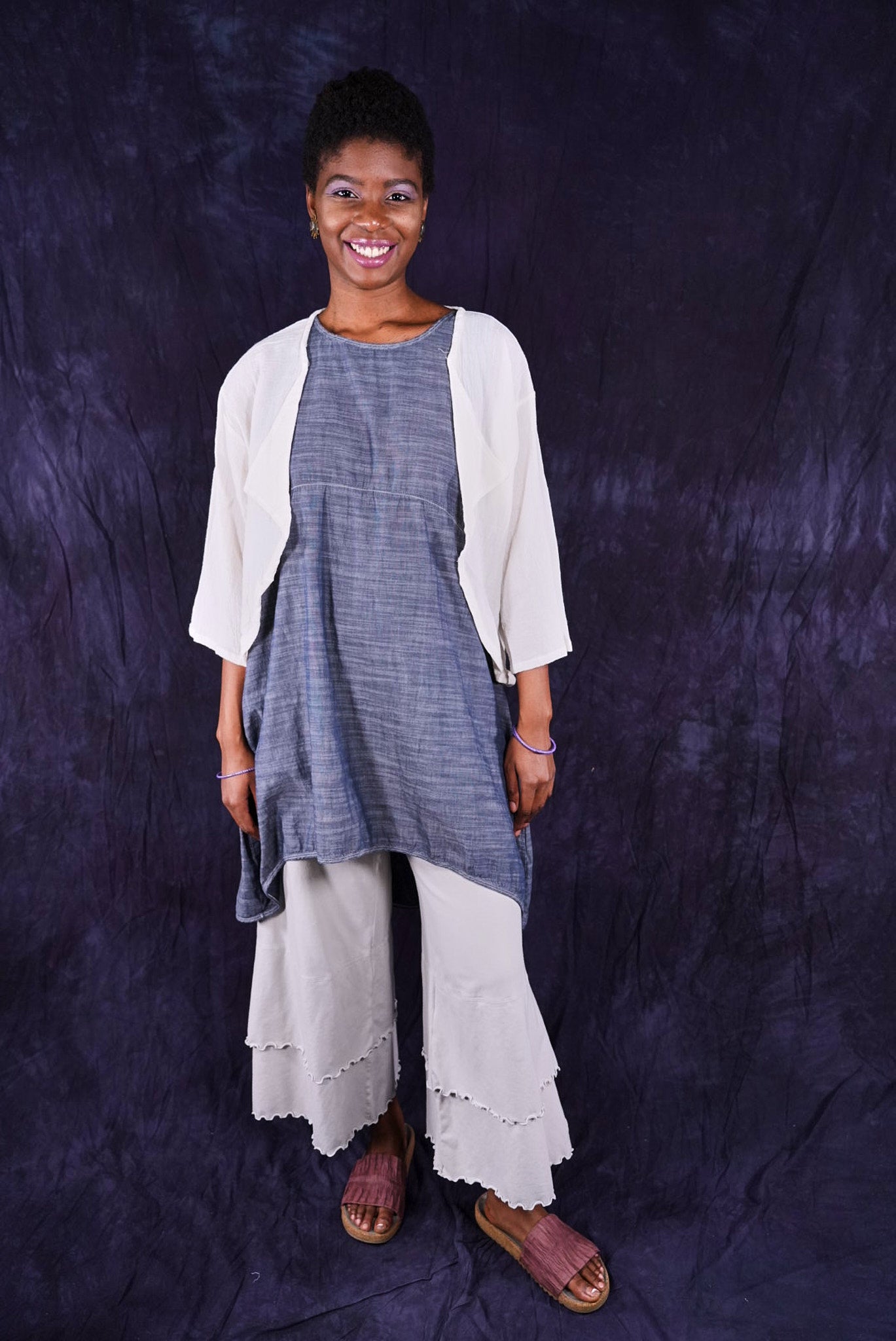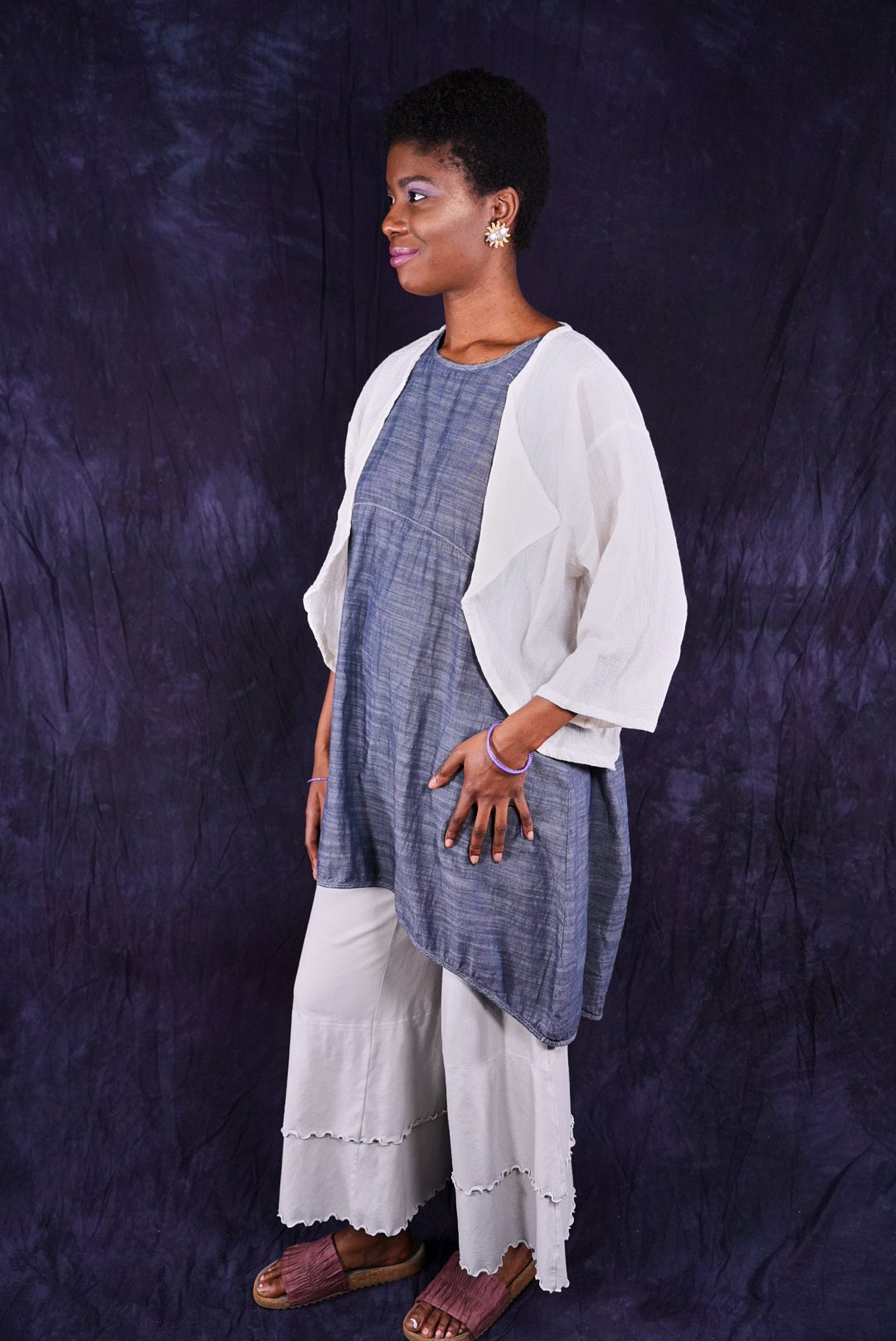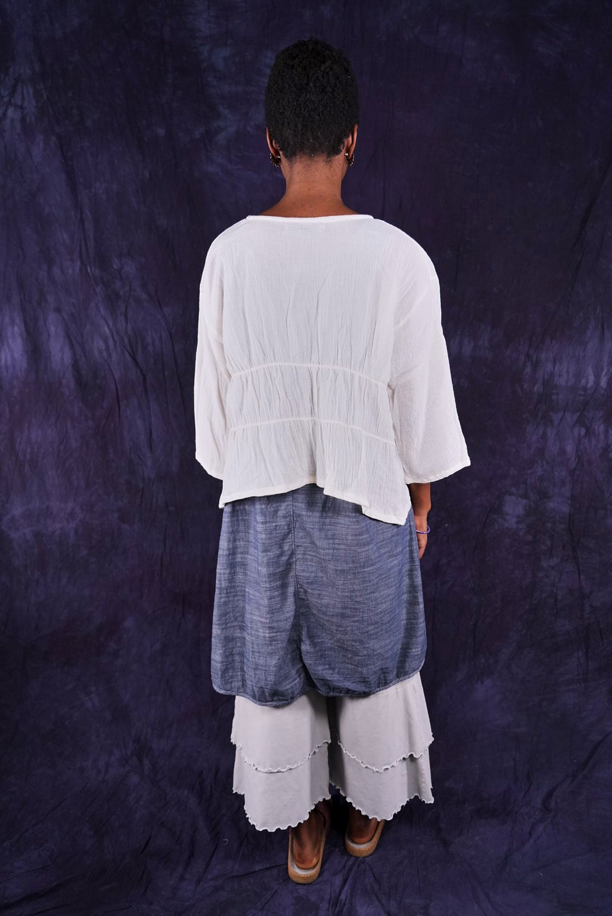 So light...You will find so many ways to have fun in this cropped cardi made of soft cotton gauze. A perfect throw-over-the-shoulders summer cover up for day or night. Two rows of elastic ruching in the back create beautiful texture and drape. Open front can be left open, or closed with a pin.