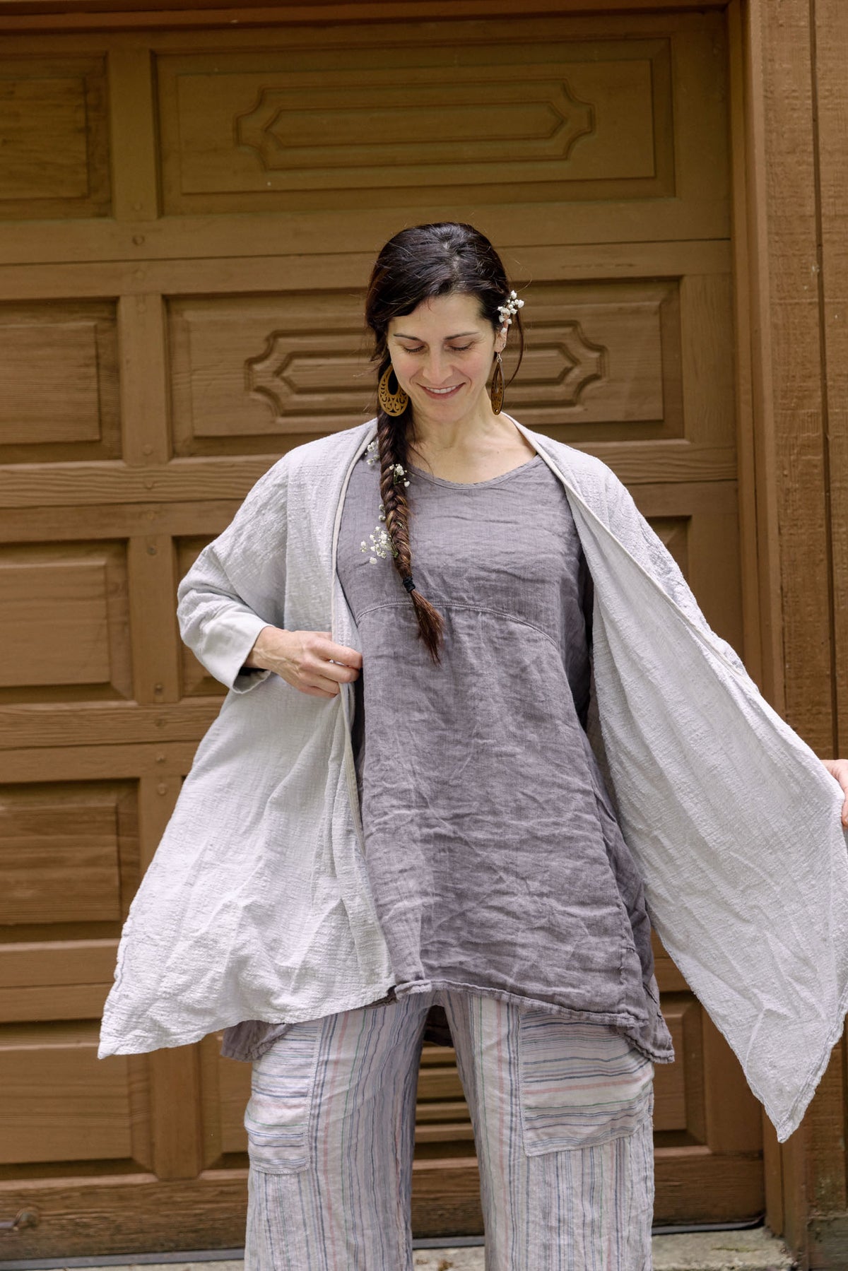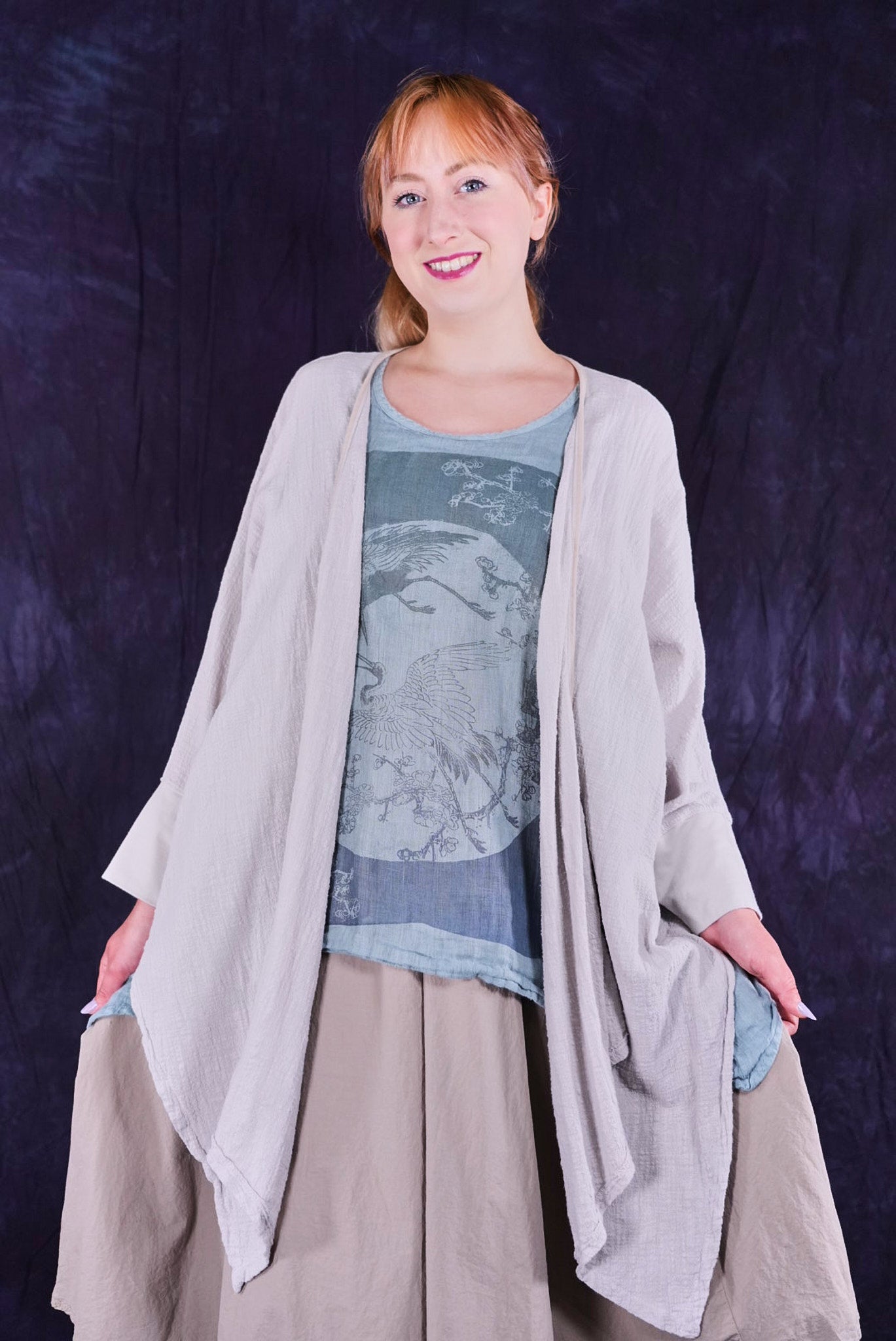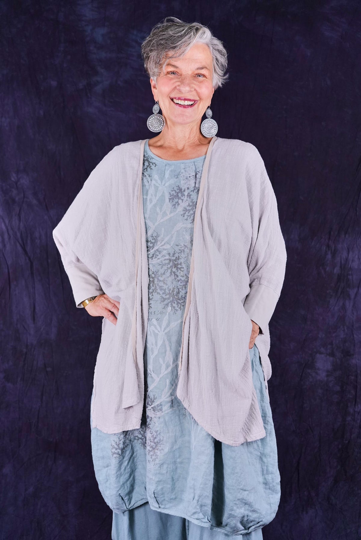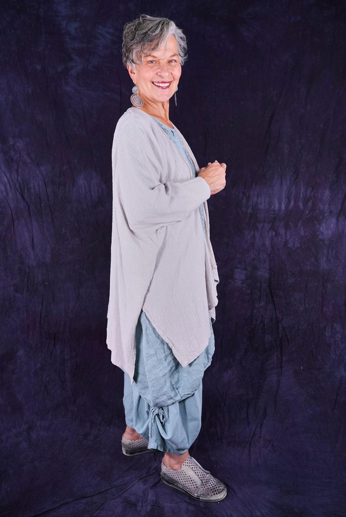 Only a few made. Simple, open cardigan to layer over tanks or sleeveless dresses. Organic cotton ribbed cuff. Nicely textured, soft drapey cotton woven fabric. Hand or machine wash gentle, line or machine dry delicate.