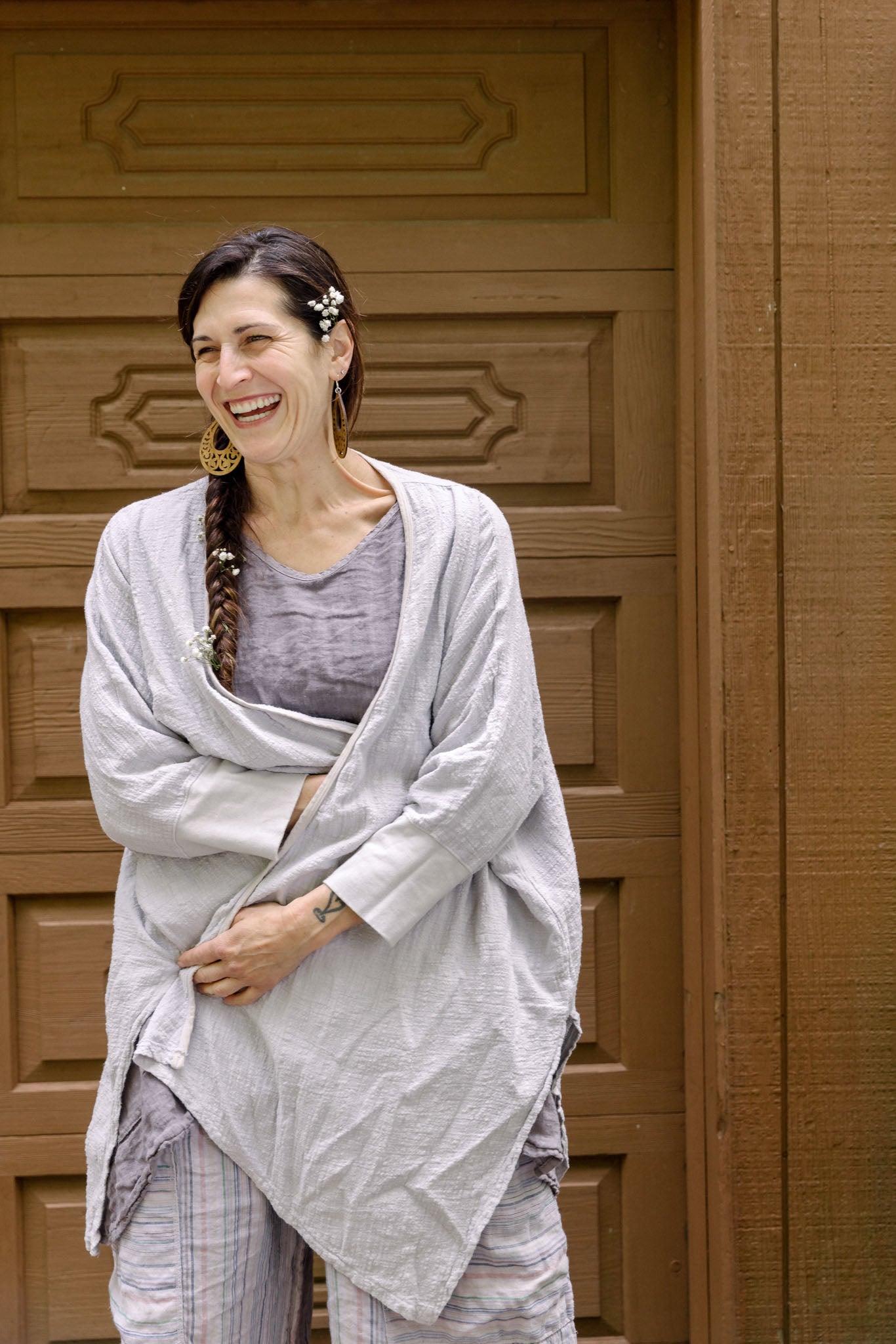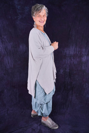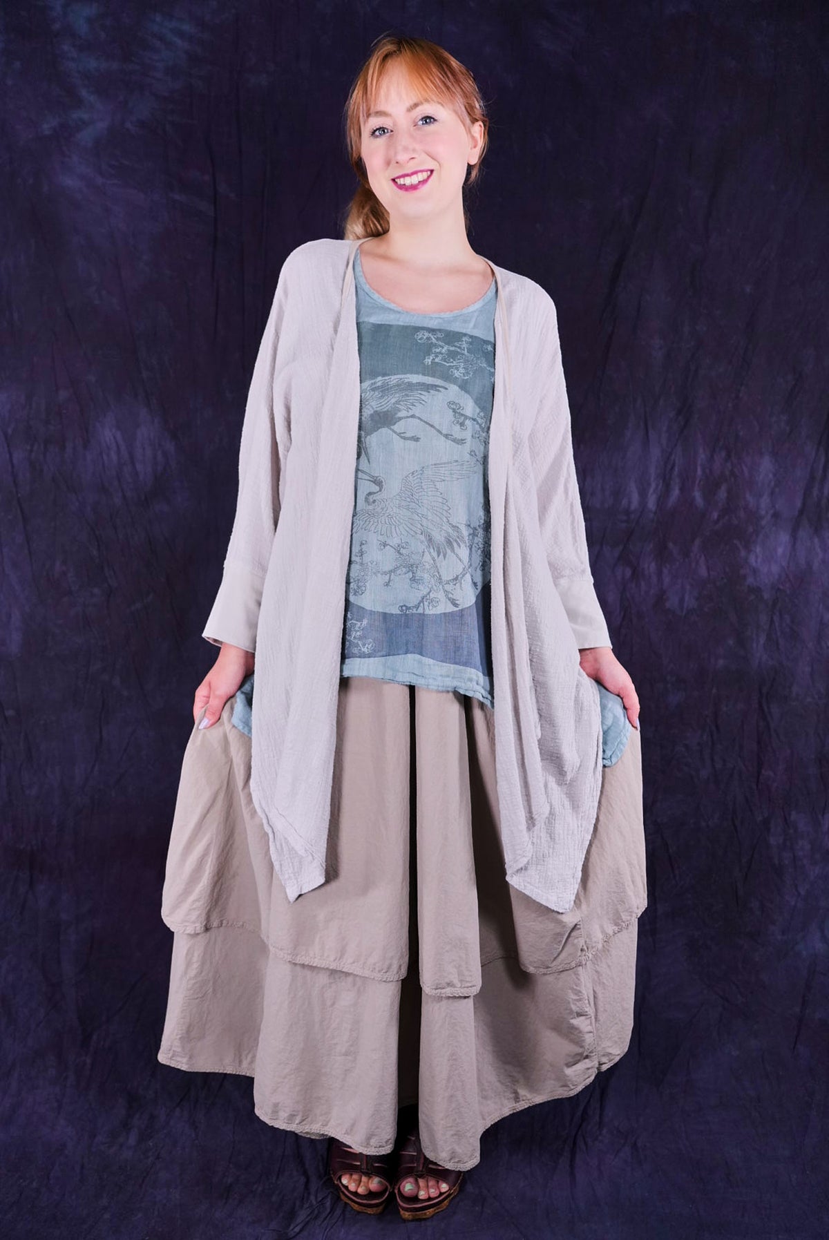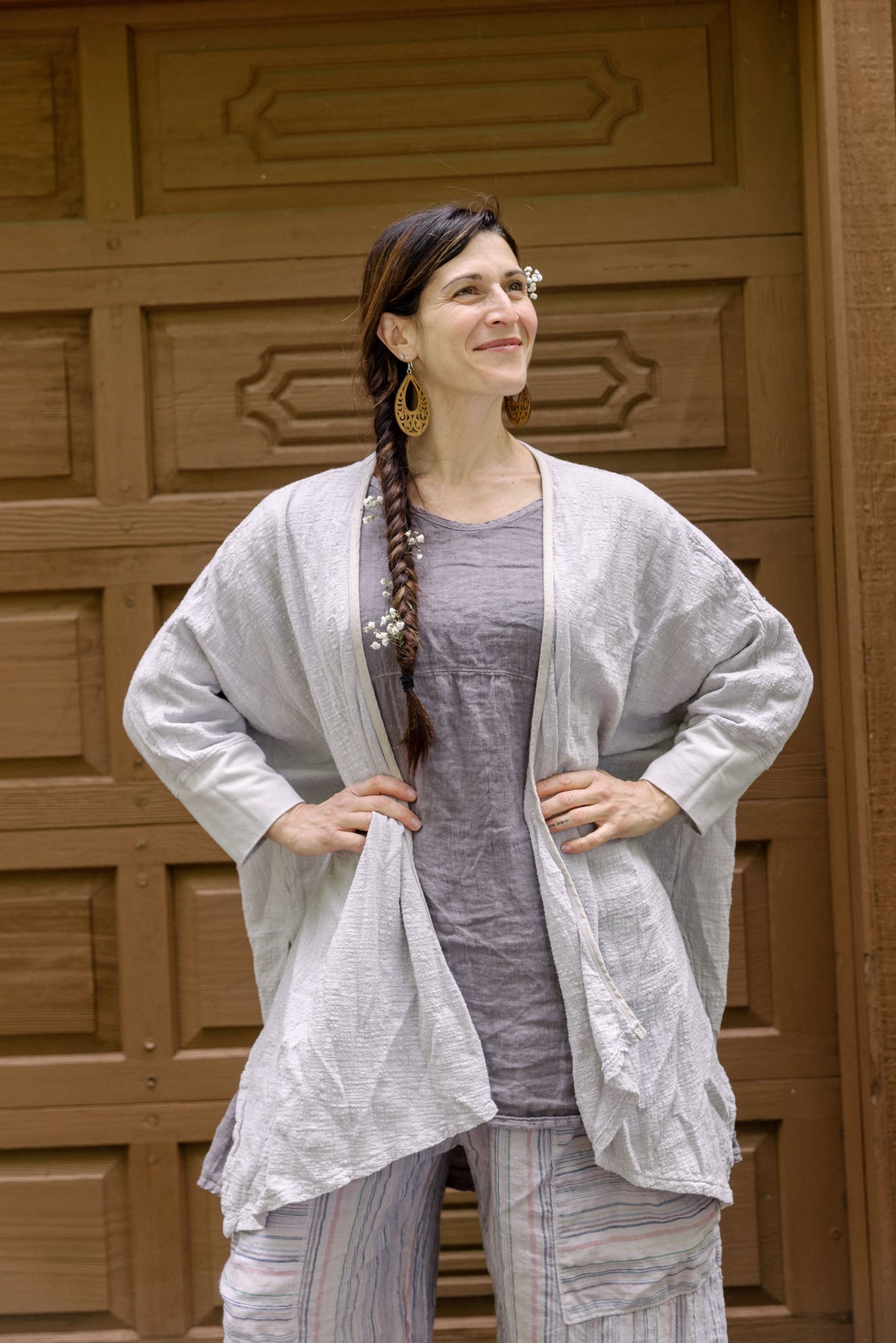 Only a few made. Simple, open cardigan to layer over tanks or sleeveless dresses. Organic cotton ribbed cuff. Nicely textured, soft drapey cotton woven fabric. Hand or machine wash gentle, line or machine dry delicate.