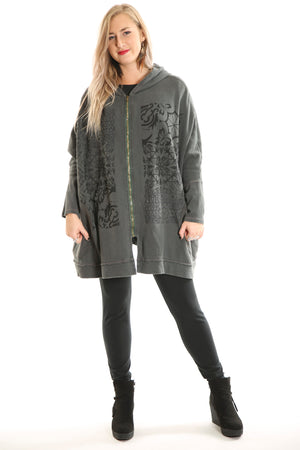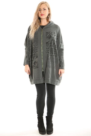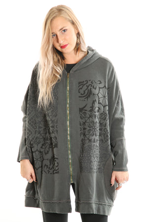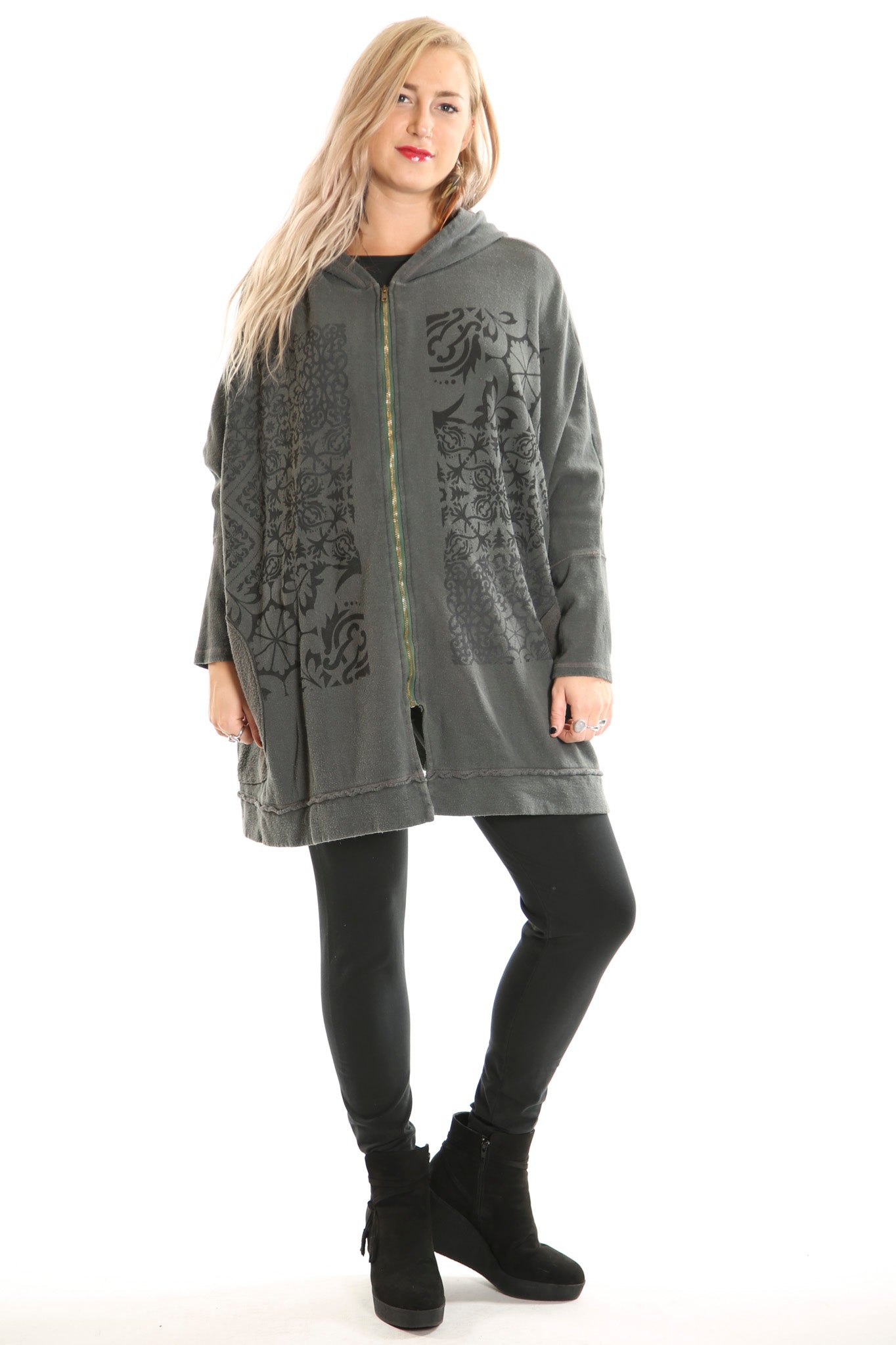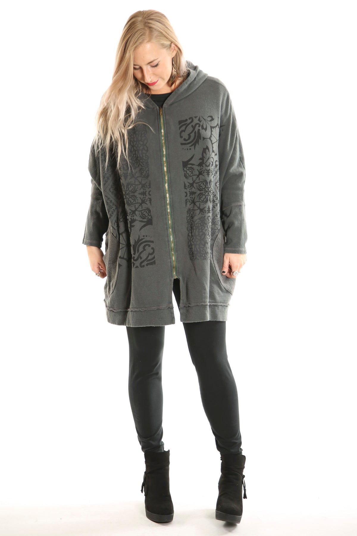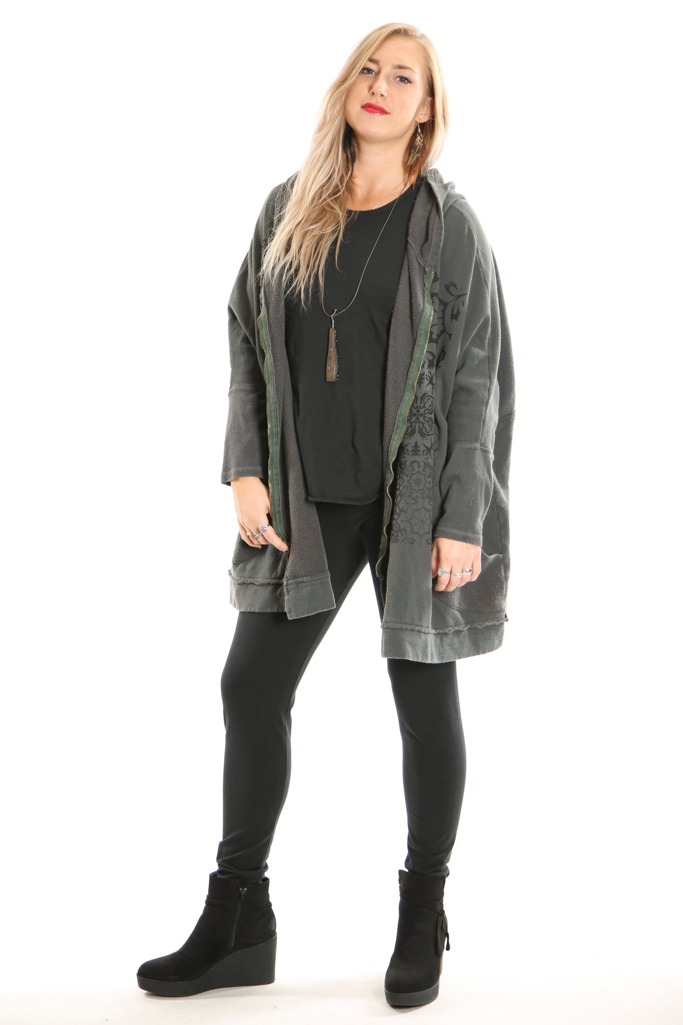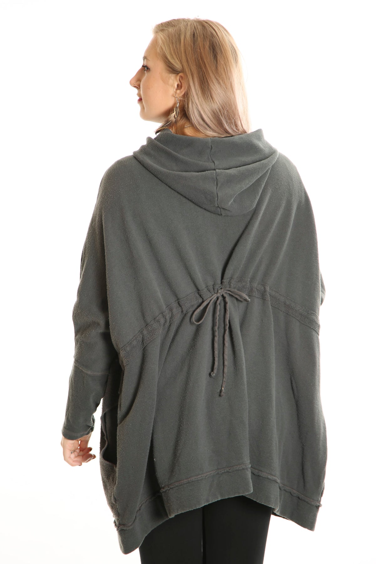 A perfect hoodie for layer with year-round. This square french terry hoodie with side pockets, has a zipper that runs from about 8" from the hem to the neckline. Ties in the back for fit, creating a slight hi-low effect.