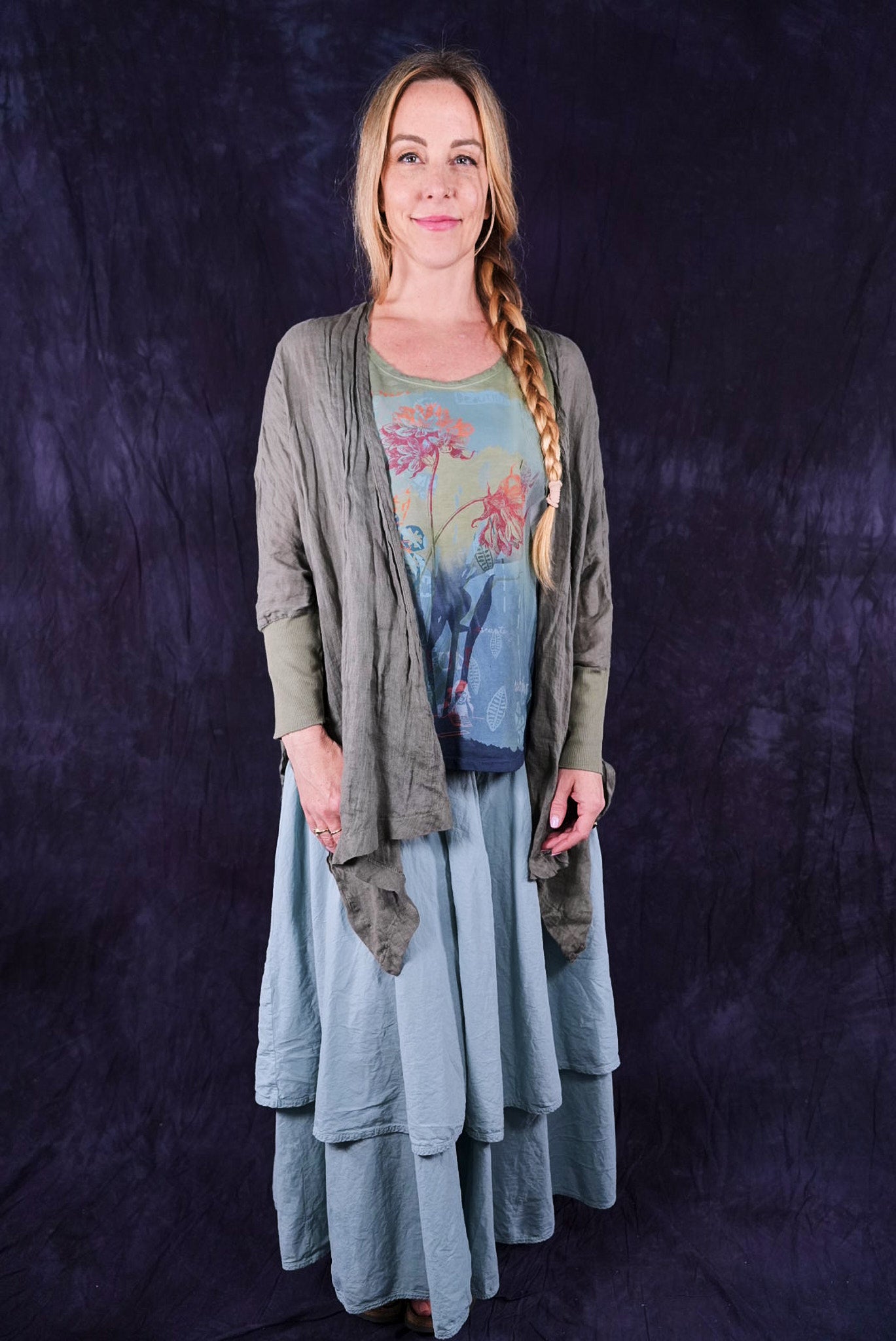 LAST ONE!!! A simple and seasonless piece, made from lightest weight flax linen which, when dyed, crinkles to form a beautiful relaxed texture. Ribbed wide organic cotton cuff. Square swing shape, side vents. Wear it over our printed organic cotton tank top paired with the Tiered Skirt, or any of our pants and leggings...twist gently and allow to dry when damp, to refresh or enhance the crinkles. Don't like crinkles? You can iron it if you must:)