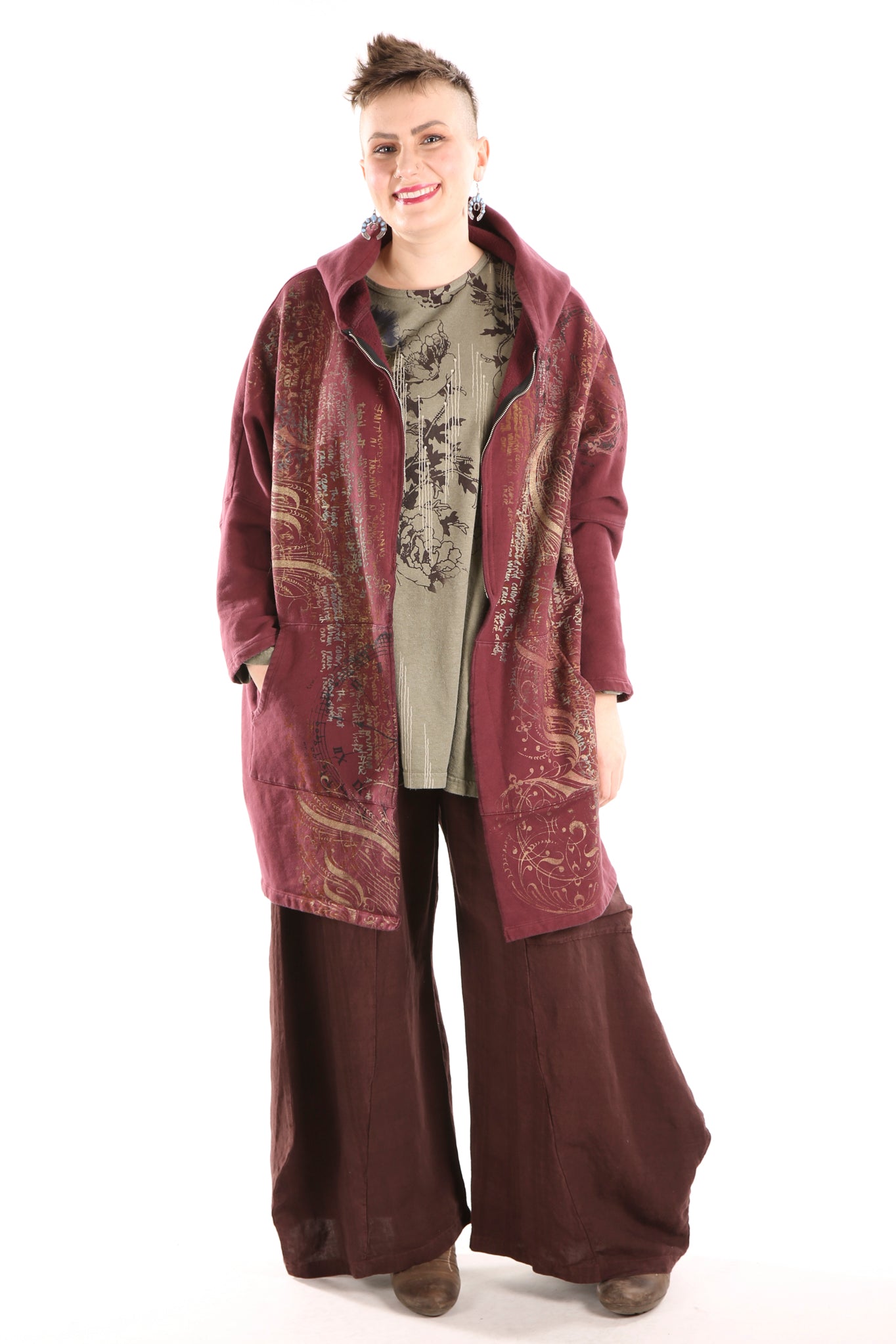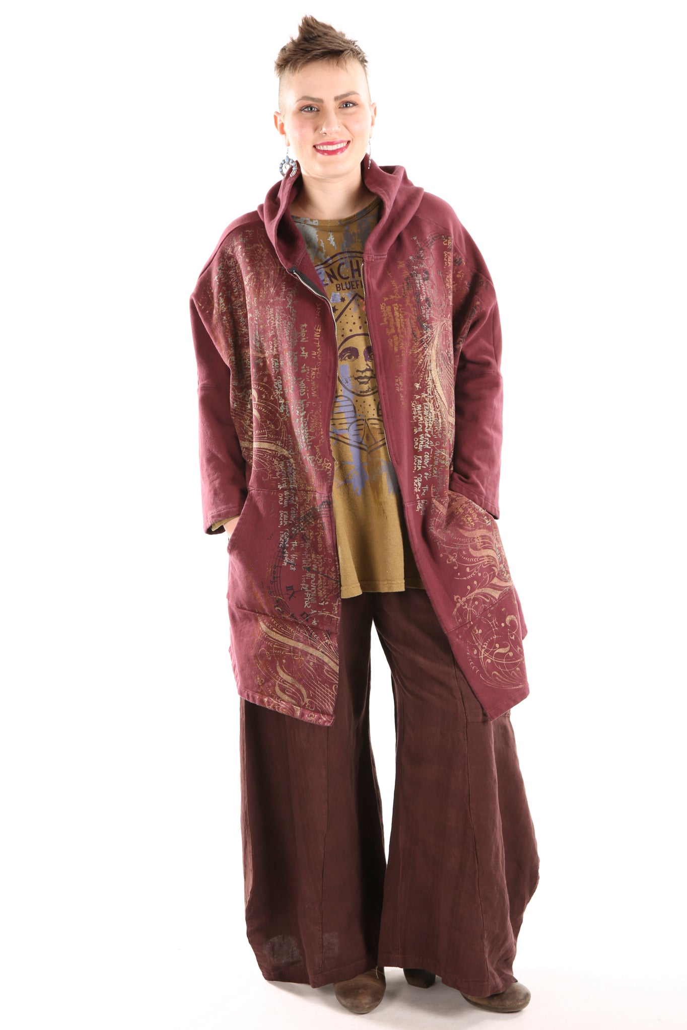 The high zip with contrasting antique burgundy tape and brass zipper offers a new look to this popular hoodie.