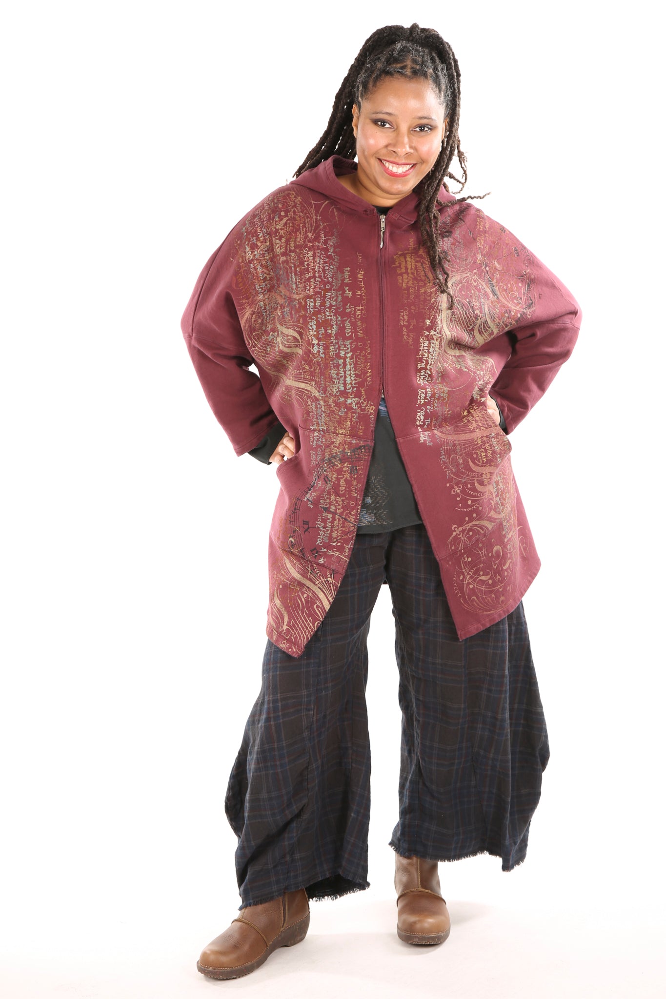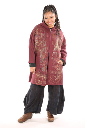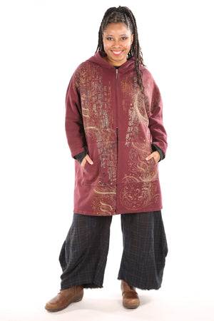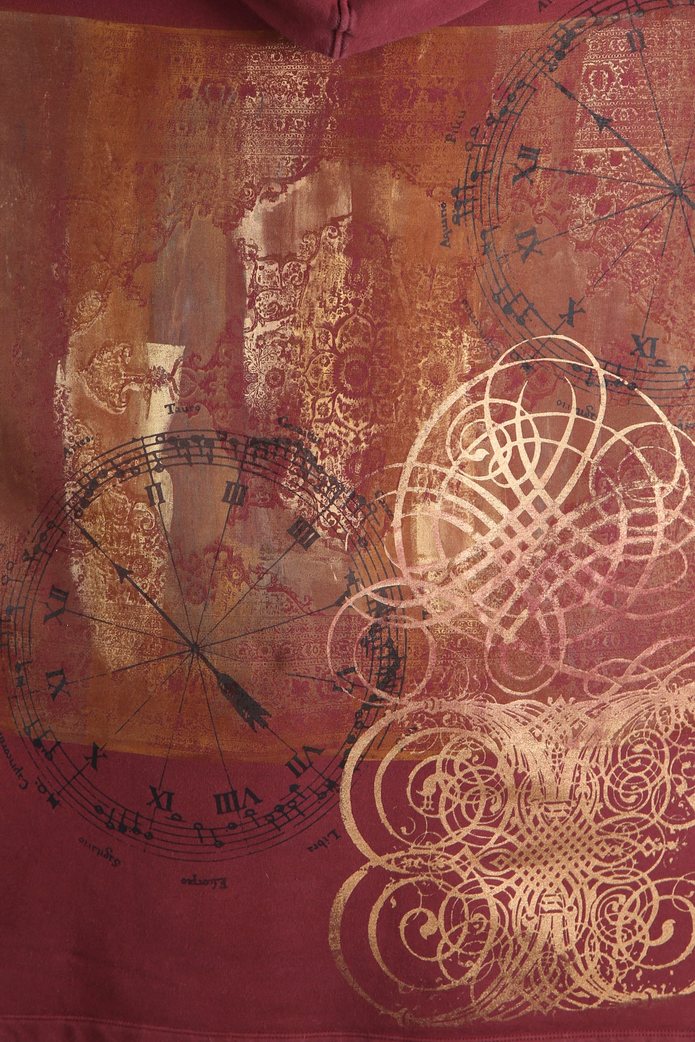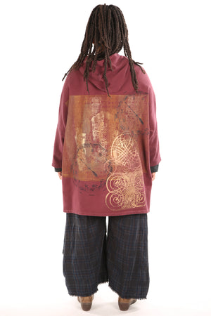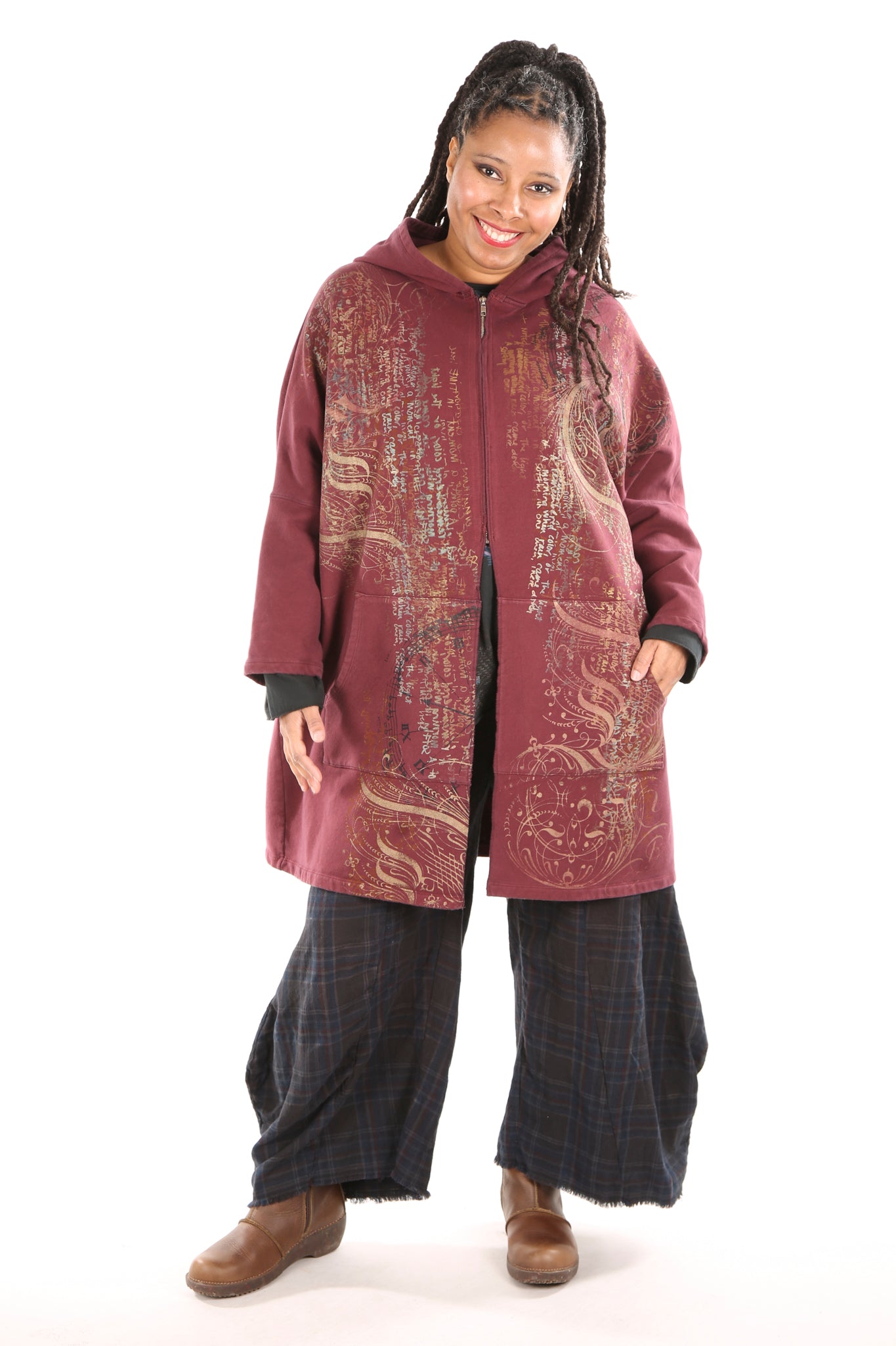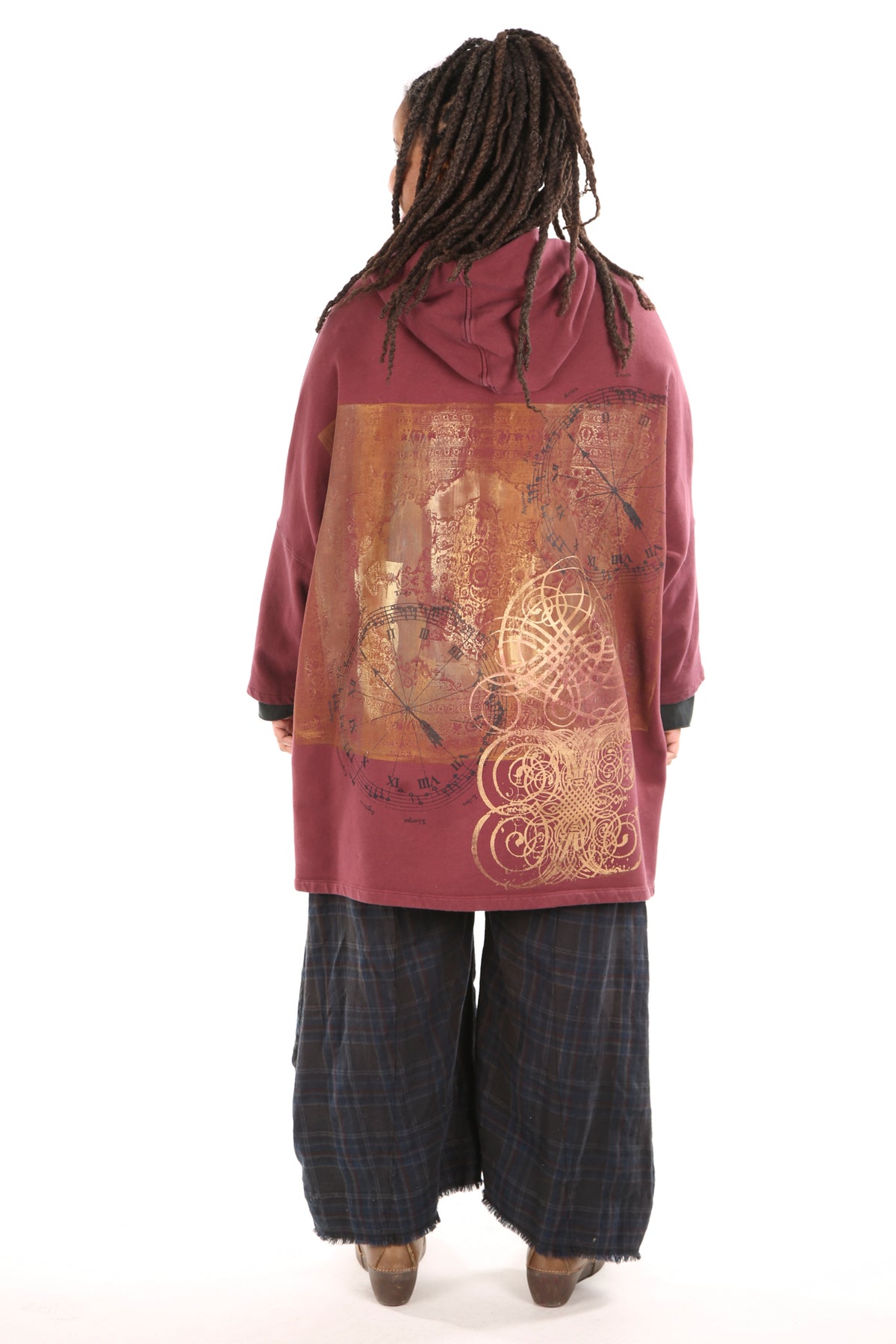 A colorful & artfully hand printed art piece printed on the front and the back which is a cozy and warm hoodie, made from our thick, organic heavy stretch fleece.